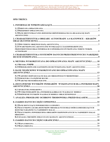 Mapa akustyczna terenów połoŜonych w obszarze oddziaływania autostrady płatnej A-4 Katowice – Kraków od km 340+200 ( węzeł „Murckowska”) do km 401+100 ( węzeł „Balice”), odcinek przebiegający przez miasto Mysłowice od km 344+460 do km 356+900 SPIS TREŚCI: 1. INFORMACJE WPROWADZAJĄCE...................................................................................4 1.1 PODSTAWA OPRACOWANIA ...................................................................................................4 1.2 PRZEDMIOT OPRACOWANIA ..................................................................................................4 1.3 DANE IDENTYFIKACYJNE JEDNOSTKI ODPOWIEDZIALNEJ ZA REALIZACJĘ MAPY AKUSTYCZNEJ ..............................................................................................................................4 2. CHARAKTERYSTYKA OBSZARU AUTOSTRADY A-4 KATOWICE – KRAKÓW ORAZ JEJ OTOCZENIA ............................................................................................................5 2.1 OPIS TERENU OBJĘTEGO MAPĄ AKUSTYCZNĄ ......................................................................5 2.2 UWARUNKOWANIA AKUSTYCZNE WYNIKAJĄCE Z ZAGOSPODAROWANIA PRZESTRZENNEGO ORAZ INFORMACJE O SPOSOBACH UśYTKOWANIA TERENU WOKÓŁ AUTOSTRADY ...............................................................................................................................8 3. CHARAKTERYSTYKA SYSTEMÓW DANYCH PRZESTRZENNYCH I NARZĘDZI DO ICH STOSOWANIA..............................................................................................................9 4. METODA WYKORZYSTANA DO OPRACOWANIA MAPY AKUSTYCZNEJ .........10 4.1 METODA NMPB ..................................................................................................................10 4.2 OPROGRAMOWANIE ZASTOSOWANE DO WYKONANIA MAPY AKUSTYCZNEJ .....................12 5. DANE WEJŚCIOWE WYKORZYSTANE DO OPRACOWANIA MAPY AKUSTYCZNEJ .........................................................................................................................13 5.1 WARTOŚCI DOPUSZCZALNE HAŁASU DROGOWEGO W ŚRODOWISKU.................................17 5.2 STRUKTURA I NATĘśENIE RUCHU........................................................................................18 5.3 WARUNKI METEOROLOGICZNE...........................................................................................18 6. ZESTAWIENIE WYNIKÓW POMIARÓW WYKONANYCH DLA POTRZEB MAPY AKUSTYCZNEJ .........................................................................................................................20 6.1 APARATURA POMIAROWA ...................................................................................................20 6.2 WYNIKI POMIARÓW DLA POTRZEB KALIBRACJI I WALIDACJI MODELU ...........................21 6.3 OMÓWIENIE WYNIKÓW WALIDACJI MODELU OBLICZENIOWEGO .....................................23 7. ANALIZA PROGRAMU OCHRONY ŚRODOWISKA PRZED HAŁASEM.................24 8. ZAKRES DANYCH CZĘŚCI OPISOWEJ..........................................................................33 8.1 DANE DOTYCZĄCE POWIERZCHNI I LUDNOŚCI ...................................................................33 8.2 SZACUNKOWA LICZBA BUDYNKÓW MIESZKALNYCH ORAZ OSÓB ZAMIESZKUJĄCYCH BUDYNKI NARAśONE NA NADMIERNY HAŁAS ............................................................................34 8.3 SZACUNKOWA POWIERZCHNIA OBSZARÓW EKSPONOWANYCH NA NADMIERNY HAŁAS DROGOWY ..................................................................................................................................35 8.4 ANALIZA TRENDÓW ZMIAN STANU KLIMATU AKUSTYCZNEGO ..........................................35 9. ZAKRES DANYCH CZĘŚCI GRAFICZNEJ .....................................................................39 9.1 MAPA EMISYJNA ..................................................................................................................39 9.2 MAPA IMISYJNA ...................................................................................................................39 Laboratorium Akustyki Technicznej Główny Instytut Górnictwa w Katowicach 2 Mapa akustyczna terenów połoŜonych w obszarze oddziaływania autostrady płatnej A-4 Katowice – Kraków od km 340+200 ( węzeł „Murckowska”) do km 401+100 ( węzeł „Balice”), odcinek przebiegający przez miasto Mysłowice od km 344+460 do km 356+900 9.3 MAPA WRAśLIWOŚCI HAŁASOWEJ OBSZARÓW ..................................................................40 9.4 MAPY TERENÓW ZAGROśONYCH ........................................................................................40 9.5 ROZKŁAD WARTOŚCI WSKAŹNIKA M .................................................................................40 9.6 MAPA PROGNOSTYCZNA ......................................................................................................41 10. PODSUMOWANIE I WNIOSKI ........................................................................................41 SPIS ZAŁĄCZNIKÓW ..............................................................................................................45 Laboratorium Akustyki Technicznej Główny Instytut Górnictwa w Katowicach 3 Mapa akustyczna terenów połoŜonych w obszarze oddziaływania autostrady płatnej A-4 Katowice – Kraków od km 340+200 ( węzeł „Murckowska”) do km 401+100 ( węzeł „Balice”), odcinek przebiegający przez miasto Mysłowice od km 344+460 do km 356+900 1. INFORMACJE WPROWADZAJĄCE 1.1 Podstawa opracowania Mapę akustyczną autostrady płatnej A-4 Katowice – Kraków od km 340+200 (węzeł „Murckowska”) do km 401+100 (węzeł „Balice”) na terenie województw śląskiego i małopolskiego wykonano na podstawie Umowy o Dzieło nr 582 1633 1 -171 z dnia 05 kwietnia 2011 roku zawartej pomiędzy: Stalexport Autostrada Małopolska S.A. z siedzibą w Mysłowicach, a Głównym Instytutem Górn