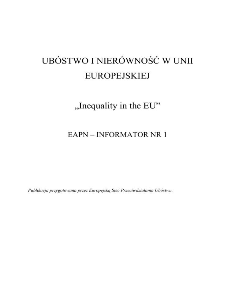 UBÓSTWO I NIERÓWNOŚĆ W UNII EUROPEJSKIEJ „Inequality in the EU” EAPN – INFORMATOR NR 1 Publikacja przygotowana przez Europejską Sieć Przeciwdziałania Ubóstwu. Dlaczego jest potrzebny informator na temat ubóstwa i nierówności? Mimo ogólnego dobrobytu w Unii Europejskiej, ubóstwo w jej państwach członkowskich utrzymuje się na stosunkowo wysokim poziomie. Prawie jedna osoba na siedem jest zagrożona ubóstwem. Odsetek ten jest nawet wyższy w odniesieniu do pewnych grup, takich jak dzieci lub osoby starsze. Zakres i powaga problemu nie są jednak często właściwie rozumiane przez polityków i opinię publiczną. W rezultacie kwestia eliminacji ubóstwa nie jest traktowana priorytetowo. Często dzieje się tak dlatego, że ludzie postrzegają ubóstwo wyłącznie jako coś zagrażającego podstawowej egzystencji i kojarzą je głównie z krajami rozwijającymi się. W rzeczywistości jednak ubóstwo jest w UE poważnym problemem, utrudniającym życie wielu osobom. Jest bezpośrednim atakiem na podstawowe prawa człowieka, ogranicza możliwość pełnego wykorzystania ludzkiego potencjału, wywołuje wysokie koszty społeczne i utrudnia zrównoważony rozwój gospodarczy. Ubóstwo jest także odzwierciedleniem systemowych błędów w zakresie sprawiedliwej redystrybucji zasobów i gwarantowania równych szans. Prowadzi to do powstania głęboko zakorzenionych nierówności, kontrastujących z olbrzymim bogactwem, zgromadzonym przez niewielką grupę osób, podczas gdy inne są skazane na marginalizację i życie pełne wyrzeczeń, chociaż mieszkają w zamożnym otoczeniu. Debatę na temat ubóstwa w UE często kojarzy się z pojęciem „wykluczenia społecznego”. Terminu tego używa się, by wskazać na procesy spychania niektórych ludzi na margines społeczeństwa, co ogranicza ich szanse, dostęp do zasobów oraz możliwości uczestnictwa w normalnym życiu społecznym i kulturalnym oraz sprawia, że ludzie tacy czują się zmarginalizowani, bezsilni i dyskryminowani. Kolejnym pojęciem kojarzonym z ubóstwem jest „podatność na zagrożenia”. Ludzie są podatni na różnego rodzaju ryzyka, jeżeli ich osobista pomyślność jest zagrożona w związku z niedostatkiem zasobów, możliwością popadnięcia w długi, ryzykiem zachorowania, ograniczeniem szans edukacyjnych mieszkaniem w niewłaściwych warunkach i nieodpowiednim otoczeniu. Wspomniane pojęcia są istotne i powiązane ze sobą. Jednak nie wszyscy ludzie wykluczeni społecznie lub podatni na zagrożenia są ubodzy. EAPN koncentruje się w tym informatorze na kwestii ubóstwa. Czego dowiecie się z tego informatora? Niniejsza broszura ma stanowić jedynie wstęp do debaty na temat ubóstwa i koncentruje się przede wszystkim na bieżących poglądach na temat natury i zakresu ubóstwa, jego przyczyn i powiązań z nierównością. Wyjaśnia obecne sposoby postrzegania i pomiaru poziomu ubóstwa w UE oraz zwraca uwagę na niektóre niedostatki tych sposobów. Informator jest pierwszą częścią zestawu „narzędzi” EAPN, ukierunkowanych na uwidocznienie kwestii ubóstwa, jego lepsze zrozumienie i podjęcie odpowiednich działań. Stanowi część kampanii EAPN w ramach przygotowań do roku 2010, czyli unijnego roku walki z ubóstwem. Czym jest ubóstwo? Jednym z problemów w ramach dyskusji na temat ubóstwa jest wyjaśnienie, czym ono jest i jak można je zdefiniować. Dla potrzeb bieżącej debaty na szczeblu UE ubóstwo dzieli się zasadniczo na dwa typy: ubóstwo bezwzględne (zwane też absolutnym albo skrajnym) oraz względne (zwane też relatywnym). Ubóstwo bezwzględne i względne Z ubóstwem bezwzględnym (skrajnym) mamy do czynienia, gdy nie są zaspokojone podstawowe potrzeby, związane z przeżyciem. Ludzie dotknięci tym typem ubóstwa mogą np. głodować, nie mieć dostępu do czystej wody, odpowiedniego schronienia, właściwej odzieży, czy opieki medycznej. Muszą walczyć o przeżycie. Ze zjawiskiem takim mamy do czynienia głównie w krajach rozwijających się, ale także niektórzy ludzie w Unii Europejskiej (np. bezdomni, lub Romowie w niektórych osiedlach) wciąż doświadczają tego typu ubóstwa. Organizacja Narodów Zjednoczonych zamierza koncentrować swoje działania na eliminacji bezwzględnego (skrajnego) ubóstwa. Pierwszym celem z listy tzw. Milenijnych Celów Rozwoju ONZ jest wyeliminowanie skrajnego ubóstwa i głodu. Zamiar eliminacji skrajnego ubóstwa został przełożony na zobowiązanie do „zmniejszenia o połowę liczby ludzi , których dochód nie przekracza jednego dolara dziennie”. W większości krajów UE pojęcie ubóstwa odnosi się jednak do ubóstwa względnego. Ubóstwo względne to sytuacja, w której poziom życia i dochodu niektórych osób jest o tyle gorszy od ogólnych standardów życia w danym kraju czy regionie, że osoby te mają problem z normalnym funkcjonowaniem oraz uczestnictwem w normalnych działaniach gospodarczych, sytuacjach towarzyskich i życiu kulturalnym Oznacza to zróżnicowanie ubóstwa względnego w zależności od kraju i standardu życiowego, osiąganego w tym kraju przez większość obywateli. Choć więc nie jest to sytuacja tak skrajna, jak w przypadku ubóstwa bezwzględnego, ubóstwo względne pozostaje kwestią bardzo poważną i bolesną. CO TO JEST UBÓSTWO WZGLĘDNE? Uważa się, że ludzie żyją w ubóstwie, jeżeli ich dochody i zasoby są na tak niskim poziomie, że uniemożliwia to tym ludziom osiągnięcie standardu życiowego, uznawanego za odpowiedni w społeczeństwie, w którym żyją. Ze względu na swoje ubóstwo wspomniane osoby mogą doświadczać wielu niekorzystnych sytuacji w wyniku braku zatrudnienia, niskiego dochodu, niewłaściwych warunków mieszkaniowych, nieodpowiedniej opieki zdrowotnej oraz barier w zakresie dostępu do kształcenia ustawicznego, oferty kulturalnej, sportowej i rekreacyjnej. Ludzie ci są często marginalizowani i wykluczani z uczestnictwa w różnych dzia