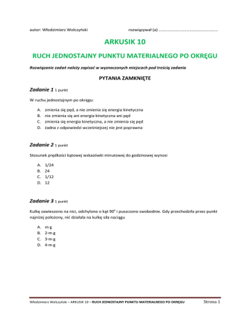 autor: Włodzimierz Wolczyński rozwiązywał (a) ................................................... ARKUSIK 10 RUCH JEDNOSTAJNY PUNKTU MATERIALNEGO PO OKRĘGU Rozwiązanie zadań należy zapisać w wyznaczonych miejscach pod treścią zadania PYTANIA ZAMKNIĘTE Zadanie 1 1 punkt W ruchu jednostajnym po okręgu: A. B. C. D. zmienia się pęd, a nie zmienia się energia kinetyczna nie zmienia się ani energia kinetyczna ani pęd zmienia się energia kinetyczna, a nie zmienia się pęd żadna z odpowiedzi wcześniejszej nie jest poprawna Zadanie 2 1 punkt Stosunek prędkości kątowej wskazówki minutowej do godzinowej wynosi A. B. C. D. 1/24 24 1/12 12 Zadanie 3 1 punkt Kulkę zawieszono na nici, odchylono o kąt 90o i puszczono swobodnie. Gdy przechodziła przez punkt najniżej położony, nić działała na kulkę siła naciągu A. B. C. D. m·g 2·m·g 3·m·g 4·m·g Włodzimierz Wolczyński – ARKUSIK 10 – RUCH JEDNOSTAJNY PUNKTU MATERIALNEGO PO OKRĘGU Strona 1 PYTANIA OTWARTE Zadanie 4 5 punktów Zaznacz krzyżykiem PRAWDA FAŁSZ Jeden z kamieni leży na Ziemi w okolicach Poznania, a drugi o tej samej masie w okolicach Kairu. Większa siła dośrodkowa związana z ruchem wirowym Ziemi działa na ten w Kairze. W ruchu jednostajnym po okręgu przyspieszenie jest równe zeru. Przyspieszenie dośrodkowe wzrośnie czterokrotnie, jeśli okres zmaleje dwukrotnie. Stosunek częstotliwości dużego i małego koła zębatego w rowerze jadącym ze stałą prędkością jest równy odwrotnemu stosunkowi promieni zębatek. Prędkość liniowa w ruchu po okręgu jest styczna do toru. Zadanie 5 12 punktów A C α B Na nici o długości l = 1 m, wprawiona w ruch, ale bez napędu wiruje kulka o masie m = 100 g, w płaszczyźnie pionowej. W punkcie A nić oddziałuje na kulkę siłą F = 10 N. Zaznaczone punkty to: A –najwyższy na torze B – środkowy na torze C – taki, że nić tworzy z poziomem kąt α = 30o 5.1. Wykaż, że w punkcie A kulka ma prędkość kątową około 10,5 rad/s ? (3 pkt.) Włodzimierz Wolczyński – ARKUSIK 10 – RUCH JEDNOSTAJNY PUNKTU MATERIALNEGO PO OKRĘGU Strona 2 5.2 Wykaż, że w punkcie B prędkość kątowa kulki wynosi około 11,4 rad/s ? (3 pkt.) 5.3 Jaką siłą działa nić na kulkę w punkcie B? (2 pkt.) 5.4 Jaką prędkość kątową ma kulka w punkcie C? (4 pkt.) Włodzimierz Wolczyński – ARKUSIK 10 – RUCH JEDNOSTAJNY PUNKTU MATERIALNEGO PO OKRĘGU Strona 3 Zadanie 6 4 punkty Na dawnym rowerze na rysunku obok cyklista przebył drogę 1 km w czasie 1 minuty. Duże koło roweru ma średnicę dd = 1,5 m, a stosunek średnic jest 3:2. 6.1. Oblicz częstotliwości obu kół roweru. (2 pkt.) 6.2. Znajdź stosunek przyspieszeń dośrodkowych punktów na obwodach dużego i małego koła. (2 pkt.) Włodzimierz Wolczyński – ARKUSIK 10 – RUCH JEDNOSTAJNY PUNKTU MATERIALNEGO PO OKRĘGU Strona 4 Zadanie 7 5 punktów Na nici o długości l = 1 m zawieszona jest kulka o masie m = 50 g. Wprawiono ją w ruch obrotowy w kierunku poziomym, a nić odchyliła się od pionu o kąt α = 45o. 7.1. Ile obrotów na minutę wykonuje kulka (3 pkt.) 7.2. Wytrzymałość na zerwanie nitki wynosi 1 N. Czy nici grozi zerwanie? Uzasadnij odpowiednimi obliczeniami. (2 pkt.) Włodzimierz Wolczyński – ARKUSIK 10 – RUCH JEDNOSTAJNY PUNKTU MATERIALNEGO PO OKRĘGU Strona 5 Ocena l. p. temat ZDOBYTYCH PKT. MAX ZADANIA ZAMKNIĘTE 4 Zaznacz krzyżykiem 5 Na nici o długości 6 Na dawnym rowerze 7 Na nici o długości RAZEM ZADANIA OTWARTE RAZEM Włodzimierz Wolczyński – ARKUSIK 10 – RUCH JEDNOSTAJNY PUNKTU MATERIALNEGO PO OKRĘGU 3 5 12 4 5 26 29 Strona 6