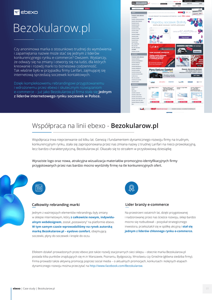 Bezokularow.pl Czy anonimowa marka o stosunkowo trudnej do wymówienia i zapamiętania nazwie może stać się jednym z liderów konkurencyjnego rynku e-commerce? Owszem. Wystarczy, że odważy się na zmiany i otworzy się na ludzi, dla których kreowanie i rozwój marki to biznesowa codzienność. Tak właśnie było w przypadku firmy Larifari, zajmującej się internetową sprzedażą soczewek kontaktowych. Dzięki kompleksowemu rebrandingowi przygotowanemu i wdrożonemu przez ebexo i skutecznym rozwiązaniom e-commerce – już jako Bezokularow.pl firma stała się jednym z liderów internetowego rynku soczewek w Polsce. Współpraca na linii ebexo - Bezokularow.pl Współpraca trwa nieprzerwanie od kilku lat. Genezą i fundamentem dynamicznego rozwoju firmy na trudnym, konkurencyjnym rynku, stała się zaproponowana przez nas zmiana nazwy z trudnej Larifari na nieco prowokacyjną, lecz bardzo charakterystyczną, Bezokularow.pl. Okazało się to strzałem w przysłowiową dziesiątkę. Wyraziste logo oraz nowa, atrakcyjna wizualizacja materiałów promocyjno-identyfikacyjnych firmy przygotowanych przez nas bardzo mocno wyróżniły firmę na tle konkurencyjnych ofert. Całkowity rebranding marki Lider branży e-commerce Jednym z ważniejszych elementów rebrandingu były zmiany Na przestrzeni ostatnich lat, dzięki przygotowanej w sklepie internetowym, który z całkowicie nowym, indywidu- i nadzorowanej przez nas ścieżce rozwoju, sklep bardzo alnym webdesignem, został „postawiony” na platformie ebexo. mocno się rozbudował – pozyskał strategicznego W tym samym czasie wprowadziliśmy na rynek autorską inwestora, przekształcił się w spółkę akcyjną i stał się markę Bezokularow.pl – eyelove comfort, obejmującą jednym z liderów chłonnego rynku e-commerce. soczewki, płyny do soczewek i krople do oczu. Efektem działań prowadzonych przez ebexo jest także rozwój stacjonarnych sieci sklepu – obecnie marka Bezokularow.pl posiada kilka punktów znajdujących się m.in Warszawie, Poznaniu, Bydgoszczy, Wrocławiu czy Gnieźnie (główna siedziba firmy). Firma prowadzi także aktywną promocję poprzez social media – o aktualnych promocjach, konkursach i kolejnych etapach dynamicznego rozwoju można przeczytać na http://www.facebook.com/Bezokularow. ebexo | Case study | Bezokularow.pl 01 O współpracy z ebexo mówi pomysłodawca i właściciel marki Bezokularow.pl, Wojciech Kyciak Choć współpracujemy ze sobą kilka lat, do dziś trudno mi sklasyfikować ebexo. Jest to system naczyń połączonych - z jednej strony jest to kreatywna agencja, z drugiej są to znawcy zasad rozwoju marki, z trzeciej skuteczna agencja namingowa, a z czwartej system rozwiązań e-commerce z dużą ilością przydatnych funkcjonalności. Kilka lat temu przekonali mnie do swoich pomysłów i postanowiłem im zaufać – jako biznesowym specjalistom i jako ludziom. W efekcie powstała doskonale prosperująca, nowoczesna marka. Ostatnie kilka lat pokazało mi, że nie warto szukać wsparcia ze strony wielu firm specjalizujących się w zbliżonych do siebie dziedzinach. Gdzie kucharek sześć, tam o wiele większe prawdopodobieństwo nieskoordynowanych i niespójnych działań, generujących dużo większe koszty, na które nie mogę sobie pozwolić. Nie wspominając już o problemach z tożsamością marki. Zaufałem jednej firmie i nie żałuję. Z ebexo jest i taniej, i szybciej, i – co najważniejsze – skuteczniej. ebexo | Case study | Bezokularow.pl 02