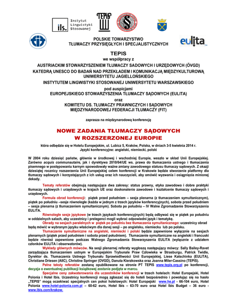 POLSKIE TOWARZYSTWO TŁUMACZY PRZYSIĘGŁYCH I SPECJALISTYCZNYCH TEPIS we współpracy z AUSTRIACKIM STOWARZYSZENIEM TŁUMACZY SADOWYCH I URZĘDOWYCH (ÖVGD) KATEDRĄ UNESCO DO BADAŃ NAD PRZEKŁADEM I KOMUNIKACJĄ MIĘDZYKULTUROWĄ UNIWERSYTETU JAGIELLOŃSKIEGO INSTYTUTEM LINGWISTYKI STOSOWANEJ UNIWERSYTETU WARSZAWSKIEGO pod auspicjami EUROPEJSKIEGO STOWARZYSZENIA TŁUMACZY SĄDOWYCH (EULITA) oraz KOMITETU DS. TŁUMACZY PRAWNICZYCH I SĄDOWYCH MIĘDZYNARODOWEJ FEDERACJI TŁUMACZY (FIT) zaprasza na międzynarodową konferencję NOWE ZADANIA TŁUMACZY SĄDOWYCH W ROZSZERZONEJ EUROPIE która odbędzie się w Hotelu Europejskim, ul. Lubicz 5, Kraków, Polska, w dniach 3-5 kwietnia 2014 r. Języki konferencyjne: angielski, niemiecki, polski W 2004 roku dziesięć państw, głównie w środkowej i wschodniej Europie, weszło w skład Unii Europejskiej. Zarówno acquis communautaire, jak i dyrektywa 2010/64/UE ws. prawa do tłumaczenia ustnego i tłumaczenia pisemnego w postępowaniu karnym spowodowały ważne zmiany zawodowego statusu tłumaczy sądowych. Z okazji dziesiątej rocznicy rozszerzenia Unii Europejskiej celem konferencji w Krakowie będzie stworzenie platformy dla tłumaczy sądowych i korzystających z ich usług oraz ich nauczycieli, aby omówić wyzwania i osiągnięcia minionej dekady. Tematy referatów obejmują następujące dwa zakresy: status prawny, etyka zawodowa i dobre praktyki tłumaczy sądowych i urzędowych w krajach UE oraz doskonalenie zawodowe i kształcenie tłumaczy sądowych i urzędowych. Formuła obrad konferencji: piątek przed południem – sesja plenarna (z tłumaczeniem symultanicznym), piątek po południu –sesje równoległe (każda w jednym z trzech języków konferencyjnych), sobota przed południem – sesja plenarna (z tłumaczeniem symultanicznym). Sobota po południu – IV Walne Zgromadzenie Stowarzyszenia EULITA. Równoległe sesje językowe (w trzech językach konferencyjnych) będą odbywać się w piątek po południu w oddzielnych salach, aby uczestnicy i prelegenci mogli wybrać odpowiedni język i tematykę. Obrady na sesjach paralelnych w piątek po południu bez tłumaczenia symultanicznego: uczestnicy obrad będą mówić w wybranym języku właściwym dla danej sesji – po angielsku, niemiecku lub po polsku. Tłumaczenie symultaniczne na angielski, niemiecki i polski będzie zapewnione wyłącznie na sesjach plenarnych (piątek przed południem i sobota przed południem). Tłumaczenie symultaniczne na angielski i francuski będzie również zapewnione podczas Walnego Zgromadzenia Stowarzyszenia EULITA (wyłącznie z udziałem członków EULITA i obserwatorów). Wykłady głównych mówców. Na sesji plenarnej referaty wygłoszą następujący mówcy: Sally Bailey-Ravet zarządzająca tłumaczeniem ustnym w Europejskim Trybunale Praw Człowieka w Strasburgu, Patrick Twidle, Dyrektor ds. Tłumaczenia Ustnego Trybunału Sprawiedliwości Unii Europejskiej, Liese Katschinka (EULITA), Christiane Driesen (AIIC), Christine Springer (OVGD), Danuta Kierzkowska oraz Joanna Miler-Cassino (TEPIS). Pełne teksty referatów zostaną opublikowane na stronie PT TEPIS www.tepis.org.pl po konferencji, decyzja o ewentualnej publikacji książkowej zostanie podjęta w marcu. Specjalne ceny zakwaterowania dla uczestników konferencji w trzech hotelach: Hotel Europejski, Hotel Polonia i Hotel Ibis. Uczestnicy konferencji mogą zgłaszać się do hoteli bezpośrednio i powołując się na hasło „TEPIS” mogą oczekiwać specjalnych cen pokoi hotelowych: Hotel Europejski www.he.pl - 66-104 euro, Hotel Polonia www.hotel-polonia.com.pl – 60-62 euro, Hotel Ibis – 63-70 euro oraz Hotel Ibis Budget – 36 euro - www.ibis.com/krakow. POLSKIE TOWARZYSTWO TŁUMACZY PRZYSIĘGŁYCH I SPECJALISTYCZNYCH RAMOWY PROGRAM MIĘDZYNARODOWEJ KONFERENCJI „NOWE ZADANIA TŁUMACZY SĄDOWYCH W ROZSZERZONEJ EUROPIE” Czwartek 3 kwietnia 2014 r. 19.00 – Spotkanie powitalne, Kawiarnia Jama Michalika, ul. Florianska 45 Piątek, 4 kwietnia 2014 r. 9.00 – 13.30 – Sesja plenarna, sala konferencyjna Hotelu Europejskiego, ul. Lubicz 5 13.30 – 15.00 – Lunch w restauracji Hotelu Europejskiego. Stoisko wydawnictwa Translegis 15.00 – 18.00 – Obrady w sesjach paralelnych: angielskiej, niemieckiej i polskiej 20.00 – 22.00 – Kolacja galowa, Restauracja Hawełka, Rynek Główny 34 Widok na Rynek Główny w Krakowie z Restauracji Hawełka Sobota, 5 kwietnia 2014 r. 10.00 – 13.00 – Zamknięcie sesji plenarnej, sala konferencyjna Hotelu Europejskiego 13.00 – 14.00 Lunch dla uczestników WZ EULITA, restauracja Hotelu Europejskiego 14.00 – 17.00 – VI Walne Zgromadzenie Stowarzyszenia EULITA, sala konferencyjna Hotelu Europejskiego 17.00 – Zwiedzanie miasta może zostać zorganizowane na prośbę uczestników, patrz www.seekrakow.com Uwaga: wycieczki zorganizowane do Muzeum Aschwitz-Birkenau trwają 6-7 godz. od godz. 10.00 Wycieczka do Kopalni Soli Wieliczka trwa 4-5 godz. od godz. 11.00