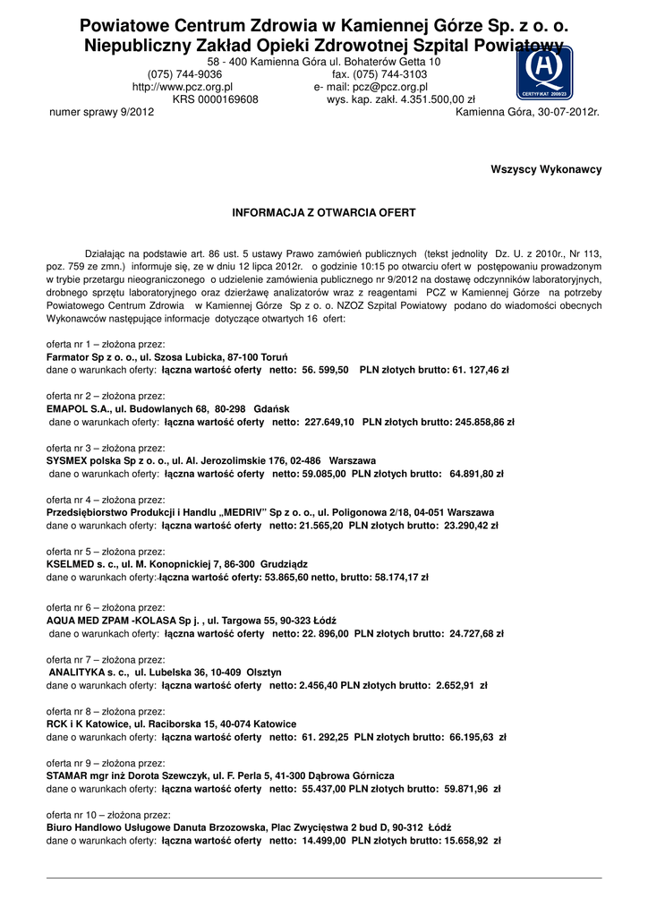 Powiatowe Centrum Zdrowia w Kamiennej Górze Sp. z o. o. Niepubliczny Zakład Opieki Zdrowotnej Szpital Powiatowy 58 - 400 Kamienna Góra ul. Bohaterów Getta 10 (075) 744-9036 fax. (075) 744-3103 http://www.pcz.org.pl e- mail: [email protected] KRS 0000169608 wys. kap. zakł. 4.351.500,00 zł numer sprawy 9/2012 Kamienna Góra, 30-07-2012r. Wszyscy Wykonawcy INFORMACJA Z OTWARCIA OFERT Działając na podstawie art. 86 ust. 5 ustawy Prawo zamówień publicznych (tekst jednolity Dz. U. z 2010r., Nr 113, poz. 759 ze zmn.) informuje się, ze w dniu 12 lipca 2012r. o godzinie 10:15 po otwarciu ofert w postępowaniu prowadzonym w trybie przetargu nieograniczonego o udzielenie zamówienia publicznego nr 9/2012 na dostawę odczynników laboratoryjnych, drobnego sprzętu laboratoryjnego oraz dzierżawę analizatorów wraz z reagentami PCZ w Kamiennej Górze na potrzeby Powiatowego Centrum Zdrowia w Kamiennej Górze Sp z o. o. NZOZ Szpital Powiatowy podano do wiadomości obecnych Wykonawców następujące informacje dotyczące otwartych 16 ofert: oferta nr 1 – złożona przez: Farmator Sp z o. o., ul. Szosa Lubicka, 87-100 Toruń dane o warunkach oferty: łączna wartość oferty netto: 56. 599,50 PLN złotych brutto: 61. 127,46 zł oferta nr 2 – złożona przez: EMAPOL S.A., ul. Budowlanych 68, 80-298 Gdańsk dane o warunkach oferty: łączna wartość oferty netto: 227.649,10 PLN złotych brutto: 245.858,86 zł oferta nr 3 – złożona przez: SYSMEX polska Sp z o. o., ul. Al. Jerozolimskie 176, 02-486 Warszawa dane o warunkach oferty: łączna wartość oferty netto: 59.085,00 PLN złotych brutto: 64.891,80 zł oferta nr 4 – złożona przez: Przedsiębiorstwo Produkcji i Handlu „MEDRIV” Sp z o. o., ul. Poligonowa 2/18, 04-051 Warszawa dane o warunkach oferty: łączna wartość oferty netto: 21.565,20 PLN złotych brutto: 23.290,42 zł oferta nr 5 – złożona przez: KSELMED s. c., ul. M. Konopnickiej 7, 86-300 Grudziądz dane o warunkach oferty: łączna wartość oferty: 53.865,60 netto, brutto: 58.174,17 zł oferta nr 6 – złożona przez: AQUA MED ZPAM -KOLASA Sp j. , ul. Targowa 55, 90-323 Łódź dane o warunkach oferty: łączna wartość oferty netto: 22. 896,00 PLN złotych brutto: 24.727,68 zł oferta nr 7 – złożona przez: ANALITYKA s. c., ul. Lubelska 36, 10-409 Olsztyn dane o warunkach oferty: łączna wartość oferty netto: 2.456,40 PLN złotych brutto: 2.652,91 zł oferta nr 8 – złożona przez: RCK i K Katowice, ul. Raciborska 15, 40-074 Katowice dane o warunkach oferty: łączna wartość oferty netto: 61. 292,25 PLN złotych brutto: 66.195,63 zł oferta nr 9 – złożona przez: STAMAR mgr inż Dorota Szewczyk, ul. F. Perla 5, 41-300 Dąbrowa Górnicza dane o warunkach oferty: łączna wartość oferty netto: 55.437,00 PLN złotych brutto: 59.871,96 zł oferta nr 10 – złożona przez: Biuro Handlowo Usługowe Danuta Brzozowska, Plac Zwycięstwa 2 bud D, 90-312 Łódź dane o warunkach oferty: łączna wartość oferty netto: 14.499,00 PLN złotych brutto: 15.658,92 zł Powiatowe Centrum Zdrowia w Kamiennej Górze Sp. z o. o. Niepubliczny Zakład Opieki Zdrowotnej Szpital Powiatowy 58 - 400 Kamienna Góra ul. Bohaterów Getta 10 (075) 744-9036 fax. (075) 744-3103 http://www.pcz.org.pl e- mail: [email protected] KRS 0000169608 wys. kap. zakł. 4.351.500,00 zł oferta nr 11 – złożona przez: MEDLAB Products Sp z o. o., ul. Gałczyńskiego 8, 05-090 Raszyn dane o warunkach oferty: łączna wartość oferty netto: 72.933,00 PLN złotych brutto: 78.767,64 zł oferta nr 12 – złożona przez: Roche Diagnostic Polska Sp z o. o., ul. Wybrzeże Gdyńskie 6 B, 01-531 Warszawa dane o warunkach oferty: łączna wartość oferty netto: 263.362,98 PLN złotych brutto: 285.908,13 zł oferta nr 13 – złożona przez: MEDAN, ul. Korczoka 32, 44-103 Gliwice dane o warunkach oferty: łączna wartość oferty netto: 35.364,00 PLN złotych brutto: 38.193,12 zł oferta nr 14 – złożona przez: PZ CORMAY S.A., ul. Wiosenna 22, 05-092 Łomianki dane o warunkach oferty: łączna wartość oferty: 77.570,00 netto; brutto: 84.341,85 zł oferta nr 15 – złożona przez: HORIBA ABX Sp z o. o., Wał Miedzeszyński 598, 03-994 Warszawa dane o warunkach oferty: łączna wartość oferty netto: 74.233,00 PLN złotych brutto: 80.855,64 zł oferta nr 16 – złożona przez: Abbott Laboratories Poland Sp z o. o., ul. Postępu 21 B, 02-676 Warszawa dane o warunkach oferty: łączna wartość oferty netto: 152.655,00 PLN złotych brutto: 165.534,90 zł Kwota, jaką Zamawiający zamierza przeznaczyć na sfinansowanie zamówienia wynosi 551.422,47 PLN . Grupa II podgrupa A pakiet nr 1 odczynniki biochemiczne, osocza kontrolne, kalibratory Cena – 100% EMAPOL Wartość pakietu netto w PLN złotych 99.546,98 Wartość pakietu brutto w PLN złotych 107.510,73 Łączna liczba pkt Grupa II podgrupa A pakiet nr 3 odczynniki lateksowe Cena – 100% STAMAR Dąbrowa Górnicza EMAPOL MEDAN AQUA MED Łódź Wartość pakietu netto w PLN złotych 12.909,00 12.630,00 21.036,00 17.664,00 Wartość pakietu brutto w PLN złotych 13.941,72 13.640,40 22.718,88 19.077,12 Łączna liczba pkt Powiatowe Centrum Zdrowia w Kamiennej Górze Sp. z o. o. Niepubliczny Zakład Opieki Zdrowotnej Szpital Powiatowy 58 - 400 Kamienna Góra ul. Bohaterów Getta 10 (075) 744-9036 fax. (075) 744-3103 http://www.pcz.org.pl e- mail: [email protected] KRS 0000169608 wys. kap. zakł. 4.351.500,00 zł Grupa II podgrupa A pakiet nr 4 odczynniki koagulologiczne Cena – 100% KSELMED EMAPOL Wartość pakietu netto w PLN złotych 44.265,60 50.835,12 Wartość pakietu brutto w PLN złotych 47.806,17 54.901,93 Łączna liczba pkt Grupa II podgrupa A pakiet nr 5 testy do badania kału Cena – 100% STAMAR Dąbrowa Górnicza EMAPOL Wartość pakietu netto w PLN złotych 24.570,00 20.355,00 Wartość pakietu brutto w PLN złotych 26.535,60 21.983,40 Łączna liczba pkt Grupa II podgrupa A pakiet nr 6 testy paskowe do analizy ogólnej mo