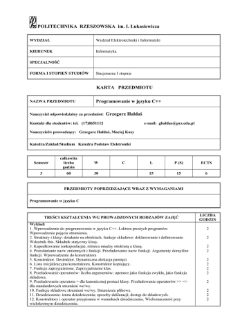 POLITECHNIKA RZESZOWSKA im. I. Łukasiewicza WYDZIAŁ Wydział Elektrotechniki i Informatyki KIERUNEK Informatyka SPECJALNOŚĆ FORMA I STOPIEŃ STUDIÓW Stacjonarne I stopnia KARTA PRZEDMIOTU NAZWA PRZEDMIOTU Programowanie w języku C++ Nauczyciel odpowiedzialny za przedmiot: Grzegorz Hałdaś Kontakt dla studentów: tel. (17)8651112 e-mail: [email protected] Nauczyciel/e prowadzący: Grzegorz Hałdaś, Maciej Kusy Katedra/Zakład/Studium Katedra Podstaw Elektroniki Semestr całkowita liczba godzin W 3 60 30 C L P (S) ECTS 15 15 6 PRZEDMIOTY POPRZEDZAJĄCE WRAZ Z WYMAGANIAMI Programowanie w języku C TREŚCI KSZTAŁCENIA WG PROWADZONYCH RODZAJÓW ZAJĘĆ Wykład: 1. Wprowadzenie do programowania w języku C++. Lektura prostych programów. Wprowadzenie pojęcia strumienia. 2. Struktury i klasy: działanie na obiektach, funkcje składowe: deklarowanie i definiowanie. Wskaźnik this. Składnik statyczny klasy. 3. Kapsułkowanie (enkapsulacja), różnica między strukturą a klasą. 4. Przesłanianie nazw zmiennych i funkcji. Przeładowanie nazw funkcji. Argumenty domyślne funkcji. Wprowadzenie do konstruktora 5. Konstruktor. Destruktor. Dynamiczna alokacja pamięci. 6. Lista inicjalizacyjna konstruktora. Konstruktor kopiujący. 7. Funkcje zaprzyjaźnione. Zaprzyjaźnienie klas. 8. Przeładowanie operatorów: liczba argumentów; operator jako funkcja zwykła, jako funkcja składowa. 9. Przeładowanie operatora = dla kanonicznej postaci klasy. Przeładowanie operatorów >> << dla standardowych strumieni we/wy. 10. Funkcje składowe strumieni we/wy. Strumienie plikowe. 11. Dziedziczenie: istota dziedziczenia; sposoby deklaracji; dostęp do składowych. 12. Konstruktory i operator przypisania w warunkach dziedziczenia. Wieloznaczność przy wielokrotnym dziedziczeniu. LICZBA GODZIN 2 2 2 2 2 2 2 2 2 2 2 2 13. Funkcje wirtualne. Wirtualny destruktor. 14. Klasa abstrakcji. Wirtualna klasa podstawowa. 15. Wzorce (szablony) klas. 2 2 2 Ćwiczenia: Laboratorium: 1. Zajęcia wprowadzające. Zapoznanie się ze środowiskiem pracy. 2. Definiowanie klasy. 3. Rozbudowa klasy. 4. Konstruktor kopiujący i funkcje operatorowe. 5. Operacje strumieniowe. 6. Centrum sterowania, opracowania interfejsu obsługi klasy. 7. Dziedziczenie i funkcje wirtualne. 8. Zaliczenie. 2 2 2 2 2 2 2 1 Projekt: Zestawy zadań projektowych. 15 Dyżury dydaktyczne (konsultacje): w terminach podanych w harmonogramie pracy jednostki EFEKTY KSZTAŁCENIA - UMIEJĘTNOŚCI KSZTAŁCENIA Student powinien posiąść podstawową wiedzę z zakresu języka C++. FORMA I WARUNKI ZALICZENIA PRZEDMIOTU (RODZAJU ZAJĘĆ) Laboratorium: średnia ocen za opracowane programy i odpowiedzi ustne na poszczególnych zajęciach. Projekt: ocena z obrony zrealizowanych zadanych zagadnień projektowych. Wykład: egzamin w formie testu. WYKAZ LITERATURY PODSTAWOWEJ Delannoy C.: Ćwiczenia z języka C++. WNT, 1993 Grębosz J.: Symfonia C++. Oficyna Kallimach, 1993 Hansen T.L.: C++: zadania i odpowiedzi. WNT, 1994 Kernighan B.W., Ritche D.M.: ANSI C. WNT, 1994 Lippman S.B.: Podstawy języka C++. WNP, 1994 Stroustrup B.: Język C++. WNT, 1994 Stroustrup B.: Projektowanie i rozwój języka C++. WNT, 1996 Vandevoorde D., Język C++. Ćwiczenia i rozwiązania, WNT, 2001. WYKAZ LITERATURY UZUPEŁNIAJĄCEJ Coad P., Yourdon E., Analiza obiektowa, Oficyna Wydawnicza Read Me, Warszawa 1994. Coad P., Yourdon E., Projektowanie obiektowe, Oficyna Wydawnicza Read Me, Warszawa 1994. Coad P., Nicola J., Programowanie obiektowe, Oficyna Wydawnicza Read Me, Warszawa 1993. Grębosz J.: Pasja C++. Oficyna Kallimach, 1997.Grębosz J.: Pasja C++. Oficyna Kallimach, 1997 Meyers Scott, Język C++ bardziej efektywny, WNT, Warszawa 1998. Lippman Stanley B., Model obiektu w C++, WNT, Warszawa 1999. Liberty Jesse, C++. Księga eksperta, Wyd. Helion, Gliwice 1999. Podpis nauczyciela odpowiedzialnego za przedmiot Podpis kierownika (zakładu/studium) katedry Data i podpis dziekana właściwego wydziału