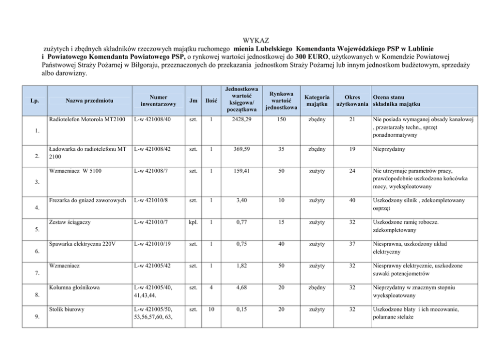 WYKAZ zużytych i zbędnych składników rzeczowych majątku ruchomego mienia Lubelskiego Komendanta Wojewódzkiego PSP w Lublinie i Powiatowego Komendanta Powiatowego PSP, o rynkowej wartości jednostkowej do 300 EURO, użytkowanych w Komendzie Powiatowej Państwowej Straży Pożarnej w Biłgoraju, przeznaczonych do przekazania jednostkom Straży Pożarnej lub innym jednostkom budżetowym, sprzedaży albo darowizny. Lp. Nazwa przedmiotu Numer inwentarzowy Jm Ilość Jednostkowa wartość księgowa/ początkowa Rynkowa wartość jednostkowa Kategoria majątku Okres Ocena stanu użytkowania składnika majątku Radiotelefon Motorola MT2100 L-w 421008/40 szt. 1 2428,29 150 zbędny 21 Nie posiada wymaganej obsady kanałowej , przestarzały techn., sprzęt ponadnormatywny Ładowarka do radiotelefonu MT 2100 L-w 421008/42 szt. 1 369,59 35 zbędny 19 Nieprzydatny Wzmacniacz W 5100 L-w 421008/7 szt. 1 159,41 50 zużyty 24 Nie utrzymuje parametrów pracy, prawdopodobnie uszkodzona końcówka mocy, wyeksploatowany Frezarka do gniazd zaworowych L-w 421010/8 szt. 1 3,40 10 zużyty 40 Uszkodzony silnik , zdekompletowany osprzęt Zestaw ściągaczy L-w 421010/7 kpl. 1 0,77 15 zużyty 32 Uszkodzone ramię robocze. zdekompletowany Spawarka elektryczna 220V L-w 421010/19 szt. 1 0,75 40 zużyty 37 Niesprawna, uszkodzony układ elektryczny Wzmacniacz L-w 421005/42 szt. 1 1,82 50 zużyty 32 Niesprawny elektrycznie, uszkodzone suwaki potencjometrów Kolumna głośnikowa L-w 421005/40, 41,43,44. szt. 4 4,68 20 zbędny 32 Nieprzydatny w znacznym stopniu wyeksploatowany Stolik biurowy L-w 421005/50, 53,56,57,60, 63, szt. 10 0,15 20 zużyty 32 Uszkodzone blaty i ich mocowanie, połamane stelaże 1. 2. 3. 4. 5. 6. 7. 8. 9. 65,67,69,72 10. 11. 12. 13. 14. 15. 16. 17. 18. Wór ratowniczy L-w 421011/135 szt. 1 7,52 50 zużyty 30 Brak dopuszczenia do użytkowania Wór ratowniczy L-w 421011/6 szt. 1 4,66 50 zużyty 30 Brak dopuszczenia do użytkowania Hem ZS-03 KWU/H-1 szt. 9 - - - 10 zużyty Pas bojowy KWU/P-1 szt. 3 - 5 zużyty Drukarka OKI Microline 3320 B-w 421009/23 szt. 1 1655,11 100 zbędna Przekroczony okres użytkowania. określony przez producenta 5 9 Nieprzydatna, urządzenie sprawne, częściowo wyeksploatowane, nie użytkowana od 2010 r. Zasilacz automatyczny BF 65 z akumulatorem żelowym B-w 421008/2 szt. 1 750,00 2 zużyty 16 Urządzenie wyeksploatowane, nie wskazane do współpracy z elementami systemu łączności, uszkodzony zasilacz i akumulator. Telefax Panasonic B-w 421008/27 szt. 1 597,13 2 zużyty 12 Telefaks uszkodzony nie skanuje druku , wyeksploatowany. Telefon komórkowy NOKIA 6070 B-w 421008/38 szt. 1 58,56 15 zużyty 8 Telefon jest wyeksploatowany, technicznie przestarzały, bez możliwości zastosowania w sieci obecnego operatora, wyeksploatowana bateria Młot udarowy Ferm B-w 421010/8 szt. 1 446,00 10 zużyty 8 Uszkodzony mechanizm udaru, uszkodzone uzwojenie wirnika. Osoby zainteresowane zamieszczonymi w wykazie składnikami rzeczowymi majątku ruchomego, w celu otrzymania bliższych informacji, mogą kontaktować się z Sekcją Kwatermistrzowsko- techniczną w terminie do dnia 4 marca 2015 r. Telefon kontaktowy (084) 688 00 26. W celu bezpłatnego pozyskania w/w składników majątku przez uprawnione jednostki należy składać pisemne wnioski /wg załączonego wzoru/ do Komendanta Powiatowego PSP w Biłgoraju w terminie do 4 marca 2015 r. W pierwszej kolejności rozpatrywane będą wnioski jednostek ochrony przeciwpożarowej.