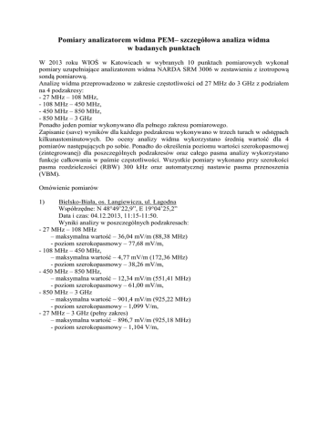 Pomiary analizatorem widma PEM– szczegółowa analiza widma w badanych punktach W 2013 roku WIOŚ w Katowicach w wybranych 10 punktach pomiarowych wykonał pomiary uzupełniające analizatorem widma NARDA SRM 3006 w zestawieniu z izotropową sondą pomiarową. Analizę widma przeprowadzono w zakresie częstotliwości od 27 MHz do 3 GHz z podziałem na 4 podzakresy: - 27 MHz – 108 MHz, - 108 MHz – 450 MHz, - 450 MHz – 850 MHz, - 850 MHz – 3 GHz Ponadto jeden pomiar wykonywano dla pełnego zakresu pomiarowego. Zapisanie (save) wyników dla każdego podzakresu wykonywano w trzech turach w odstępach kilkunastominutowych. Do oceny analizy widma wykorzystano średnią wartość dla 4 pomiarów następujących po sobie. Ponadto do określenia poziomu wartości szerokopasmowej (zintegrowanej) dla poszczególnych podzakresów oraz całego pasma analizy wykorzystano funkcje całkowania w paśmie częstotliwości. Wszystkie pomiary wykonano przy szerokości pasma rozdzielczości (RBW) 300 kHz oraz automatycznej nastawie pasma przenoszenia (VBM). Omówienie pomiarów Bielsko-Biała, os. Langiewicza, ul. Łagodna Współrzędne: N 48°49’22,9”, E 19°04’25,2” Data i czas: 04.12.2013, 11:15-11:50. Wyniki analizy w poszczególnych podzakresach: - 27 MHz – 108 MHz – maksymalna wartość – 36,04 mV/m (88,38 MHz) - poziom szerokopasmowy – 77,68 mV/m, - 108 MHz – 450 MHz, – maksymalna wartość – 4,77 mV/m (172,36 MHz) - poziom szerokopasmowy – 38,26 mV/m, - 450 MHz – 850 MHz, – maksymalna wartość – 12,34 mV/m (551,41 MHz) - poziom szerokopasmowy – 61,00 mV/m, - 850 MHz – 3 GHz – maksymalna wartość – 901,4 mV/m (925,22 MHz) - poziom szerokopasmowy – 1,099 V/m, - 27 MHz – 3 GHz (pełny zakres) – maksymalna wartość – 896,7 mV/m (925,18 MHz) - poziom szerokopasmowy – 1,104 V/m, 1) Opis widma: Analiza widma pola elektrycznego wysokiej częstotliwości w badanym punkcie wykazała, iż głównym źródłem promieniowania są w tym miejscu stacje bazowe telefonii komórkowej pracujące w zakresie 900 MHz w systemie GSM. Największy pik zarejestrowane na częstotliwości 925,188 MHz (operator – P4 Sp. z o.o.) osiągnął wartość 896,7 mV/m co stanowi 81% wartości poziomu szerokopasmowego (scałkowanego) obliczonego dla całego badanego zakresu. Kolejny drugi co do wielkości pik znajduje się w paśmie UMTS 2100 w zakresie częstotliwości zarezerwowanej dla P4 Sp. z o.o., co może świadczyć o bliskim sąsiedztwie instalacji radiokomunikacyjnej należącej do tego operatora. Mysłowice, dz. Larysz, ul. Laryska Współrzędne: N 50°11’53,9”, E 19°07’36,7” Data i czas: 18.04.2013, 11:30-12:00. Wyniki analizy w poszczególnych podzakresach: - 27 MHz – 108 MHz – maksymalna wartość –327,7 mV/m (105,61 MHz) - poziom szerokopasmowy – 688,3 mV/m, - 108 MHz – 450 MHz, – maksymalna wartość – 255,0 mV/m (191,25 MHz) - poziom szerokopasmowy – 269,2 mV/m, - 450 MHz – 850 MHz, – maksymalna wartość – 171,2 mV/m (471,25 MHz) - poziom szerokopasmowy – 231,0 mV/m, - 850 MHz – 3 GHz – maksymalna wartość – 18,75 mV/m (937,79 MHz) - poziom szerokopasmowy – 94,53 mV/m, - 27 MHz – 3 GHz (pełny zakres) – maksymalna wartość – 366,4 mV/m (105,59 MHz) - poziom szerokopasmowy – 834,2 mV/m, 2) Opis widma: Analiza widma pola elektrycznego wysokiej częstotliwości w badanym punkcie wykazała, iż zdecydowanie największy wpływ na kształtowanie się poziomów PEM ma znajdujący się w odległości około 1,3 km Radiowo-Telewizyjne Centrum Nadawcze Kosztowy. Szczegółowa analiza wskazuje, iż spośród wszystkich źródeł PEM zainstalowanych na maszcie RTCN największe poziomy w badanym miejscu emitują nadajniki radiofonii FM. Pomiar wykonywany był w okresie równoległego nadawania programów telewizyjnych w systemie analogowym i cyfrowym. 3) Blachownia, ul. Sienkiewicza Współrzędne: N 500 46' 51,7"E 180 57' 45,0" Data i czas: 09.07.2013, 10:00-11:30. Wyniki analizy w poszczególnych podzakresach: - 27 MHz – 108 MHz – maksymalna wartość – 24,27 mV/m (90,59 MHz) - poziom szerokopasmowy – 69,43 mV/m, - 108 MHz – 450 MHz, – maksymalna wartość – 3,67 mV/m (132,00 MHz) - poziom szerokopasmowy – 40,70 mV/m, - 450 MHz – 850 MHz, – maksymalna wartość – 2,42 mV/m (582,41 MHz) - poziom szerokopasmowy – 29,05 mV/m, - 850 MHz – 3 GHz – maksymalna wartość – 593,7 mV/m (929,53 MHz) - poziom szerokopasmowy – 1,16 V/m, - 27 MHz – 3 GHz (pełny zakres) – maksymalna wartość – 621,6 mV/m (929,56 MHz) - poziom szerokopasmowy – 1,028 V/m, Opis widma: Z analizy widma w badanym punkcie pomiarowym wynika, iż największe poziomy pola elektrycznego osiągane są w zakresach pracy instalacji radiokomunikacyjnych – telefonii komórkowej. Spośród wykorzystywanych systemów telefonii mobilnej największe poziomy zarejestrowano w paśmie GSM 900 MHz. Poza GSM 900 MHz, aktywne są również źródła w pasmach DCS 1800 MHz oraz UMTS 2100 MHz. Pozostałe źródła takie jak radiofonia FM czy telewizja, są widoczne powyżej tła jednak nie stanowią większego udziału w całkowitym poziomie szerokopasmowym. 4) Niegowa, ul. Mirowska Współrzędne: N 500 38' 34,6"E 190 28' 24,2" Data i czas: 17.07.2013, 10:00-11:30. Wyniki analizy w poszczególnych podzakresach: - 27 MHz – 108 MHz – maksymalna wartość – 7,57 mV/m (49,96 MHz) - poziom szerokopasmowy – 50,85 mV/m, - 108 MHz – 450 MHz, – maksymalna wartość – 17,11 mV/m (172,61 MHz) - poziom szerokopasmowy – 44,19 mV/m, - 450 MHz – 850 MHz, – maksymalna wartość – 3,89 mV/m (634,99 MHz) - poziom szerokopasmowy – 31,36 mV/m, - 850 MHz – 3 GHz – maksymalna wartość – 141,7 mV/m (940,39 MHz) - poziom szerokopasmowy – 254,3 mV/m, - 27 MHz – 3 GHz (pełny zakres) – maksymalna wartość – 133,1 mV/m (940,39 MHz) - poziom szerokopasmowy – 265,6 mV/m, Opis widma: Przeprowadzona analiza widma pola wys