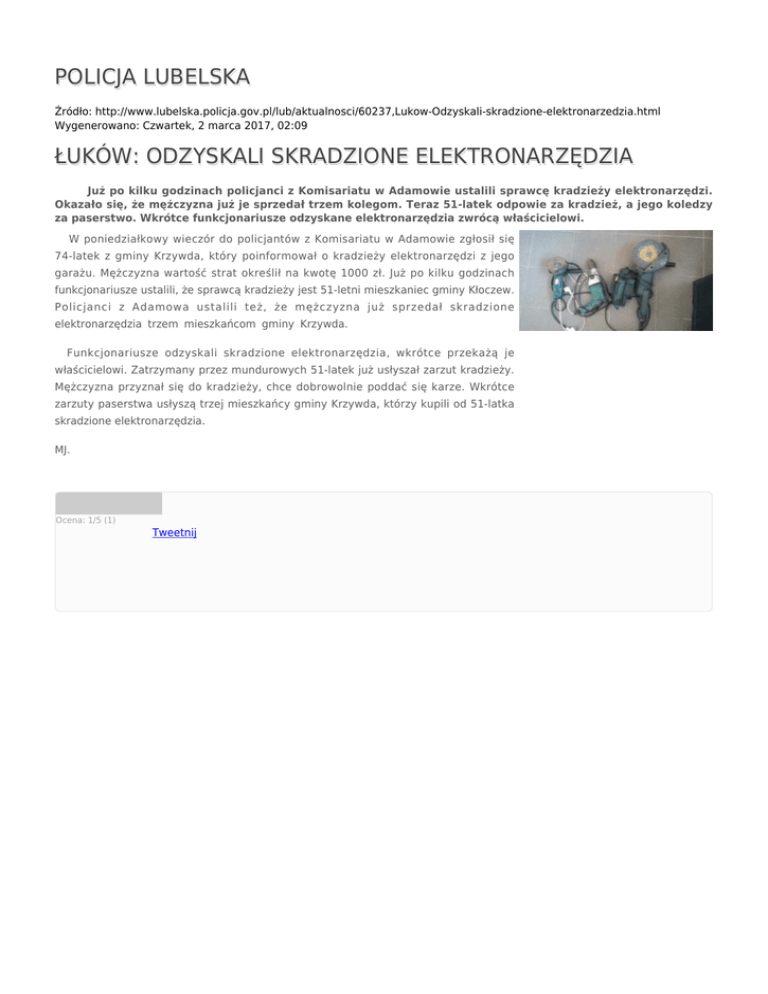 POLICJA LUBELSKA Źródło: http://www.lubelska.policja.gov.pl/lub/aktualnosci/60237,Lukow-Odzyskali-skradzione-elektronarzedzia.html Wygenerowano: Czwartek, 2 marca 2017, 02:09 ŁUKÓW: ODZYSKALI SKRADZIONE ELEKTRONARZĘDZIA Już po kilku godzinach policjanci z Komisariatu w Adamowie ustalili sprawcę kradzieży elektronarzędzi. Okazało się, że mężczyzna już je sprzedał trzem kolegom. Teraz 51-latek odpowie za kradzież, a jego koledzy za paserstwo. Wkrótce funkcjonariusze odzyskane elektronarzędzia zwrócą właścicielowi. W poniedziałkowy wieczór do policjantów z Komisariatu w Adamowie zgłosił się 74-latek z gminy Krzywda, który poinformował o kradzieży elektronarzędzi z jego garażu. Mężczyzna wartość strat określił na kwotę 1000 zł. Już po kilku godzinach funkcjonariusze ustalili, że sprawcą kradzieży jest 51-letni mieszkaniec gminy Kłoczew. Policjanci z Adamowa ustalili też, że mężczyzna już sprzedał skradzione elektronarzędzia trzem mieszkańcom gminy Krzywda. Funkcjonariusze odzyskali skradzione elektronarzędzia, wkrótce przekażą je właścicielowi. Zatrzymany przez mundurowych 51-latek już usłyszał zarzut kradzieży. Mężczyzna przyznał się do kradzieży, chce dobrowolnie poddać się karze. Wkrótce zarzuty paserstwa usłyszą trzej mieszkańcy gminy Krzywda, którzy kupili od 51-latka skradzione elektronarzędzia. MJ. Ocena: 1/5 (1) Tweetnij