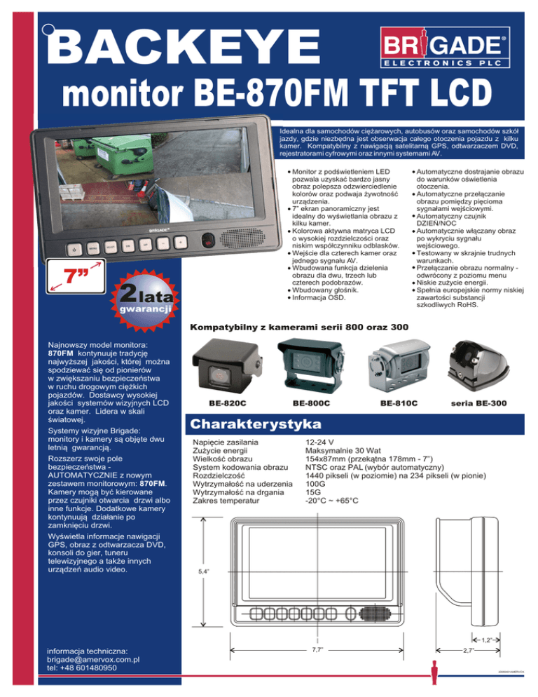 BACKEYE monitor BE-870FM TFT LCD Idealna dla samochodów ciê¿arowych, autobusów oraz samochodów szkó³ jazdy, gdzie niezbêdna jest obserwacja ca³ego otoczenia pojazdu z kilku kamer. Kompatybilny z nawigacj¹ satelitarn¹ GPS, odtwarzaczem DVD, rejestratorami cyfrowymi oraz innymi systemami AV. 7” Monitor z podœwietleniem LED pozwala uzyskaæ bardzo jasny obraz polepsza odzwierciedlenie kolorów oraz podwaja ¿ywotnoœæ urz¹dzenia. 7” ekran panoramiczny jest idealny do wyœwietlania obrazu z kilku kamer. Kolorowa aktywna matryca LCD o wysokiej rozdzielczoœci oraz niskim wspó³czynniku odblasków. Wejœcie dla czterech kamer oraz jednego sygna³u AV. Wbudowana funkcja dzielenia obrazu dla dwu, trzech lub czterech podobrazów. Wbudowany g³oœnik. Informacja OSD. 2 lata gwarancji Automatyczne dostrajanie obrazu do warunków oœwietlenia otoczenia. Automatyczne prze³¹czanie obrazu pomiêdzy piêcioma sygna³ami wejœciowymi. Automatyczny czujnik DZIEÑ/NOC Automatycznie w³¹czany obraz po wykryciu sygna³u wejœciowego. Testowany w skrajnie trudnych warunkach. Prze³¹czanie obrazu normalny odwrócony z poziomu menu Niskie zu¿ycie energii. Spe³nia europejskie normy niskiej zawartoœci substancji szkodliwych RoHS. Kompatybilny z kamerami serii 800 oraz 300 Najnowszy model monitora: 870FM kontynuuje tradycjê najwy¿szej jakoœci, której mo¿na spodziewaæ siê od pionierów w zwiêkszaniu bezpieczeñstwa w ruchu drogowym ciê¿kich pojazdów. Dostawcy wysokiej jakoœci systemów wizyjnych LCD oraz kamer. Lidera w skali œwiatowej. Systemy wizyjne Brigade: monitory i kamery s¹ objête dwu letni¹ gwarancj¹. Rozszerz swoje pole bezpieczeñstwa AUTOMATYCZNIE z nowym zestawem monitorowym: 870FM. Kamery mog¹ byæ kierowane przez czujniki otwarcia drzwi albo inne funkcje. Dodatkowe kamery kontynuuj¹ dzia³anie po zamkniêciu drzwi. Wyœwietla informacje nawigacji GPS, obraz z odtwarzacza DVD, konsoli do gier, tuneru telewizyjnego a tak¿e innych urz¹dzeñ audio video. BE-820C BE-800C BE-810C seria BE-300 Charakterystyka Napiêcie zasilania Zu¿ycie energii Wielkoœæ obrazu System kodowania obrazu Rozdzielczoœæ Wytrzyma³oœæ na uderzenia Wytrzyma³oœæ na drgania Zakres temperatur 12-24 V Maksymalnie 30 Wat 154x87mm (przek¹tna 178mm - 7”) NTSC oraz PAL (wybór automatyczny) 1440 pikseli (w poziomie) na 234 pikseli (w pionie) 100G 15G -20°C ~ +65°C 5,4” 1,2” informacja techniczna: [email protected] tel: +48 601480950 7,7” 2,7” 20080401AMERVOX BACKEYE Kamera BE-810C Idealna dla lekkich oraz ciê¿kich samochodów ciê¿arowych, autobusów oraz samochodów szkó³ jazdy, gdzie niezbêdna jest obserwacja ca³ego otoczenia pojazdu. Automatycznie podnoszona os³ona shutter. Szeœæ diód pracuj¹cych w podczerwieni - niewidoczne dla otoczenia. Pracuje przy skrajnie s³abym oœwietleniu. Bardzo szerokie pole widzenia. Wbudowany mikrofon. Minimalne oœwietlenie: 0.5 lux Zasilanie 12V z modu³u kontrolnego / monitora. Automatyczna migawka elektroniczna. Ca³kowicie wodoodporna (wed³ug normy IP68). Po³¹czenia przewodów (wtyczki i gniazda) ca³kowicie wodoodporne (wed³ug normy IP68). Homologacja europejska na znak CE oraz ‘e’ (EMC) W zestawie z monitorem BE-856DM/EM oraz BE-868M pracuje tylko jedna kamera. Automatyczne podgrzewanie obiektywu przy temperaturze poni¿ej +10°C 2 lata BE-835M BE-856DM oraz BE856EM BE-870EM/FM Charakterystyka Audio Iloœæ pikseli K¹ty widzenia Opcja SHUTTER Napiêcie zasilania Zakres temperatur Wymiary TAK 320.000 92,5° poziom, 68,6° pion, 115° przek¹tna TAK 12 V z modu³u steruj¹cego lub monitora -30°C do +50°C 94 mm x 44 mm x 64 mm 80,4 mm 120,8 mm 109 mm 65,5 mm 84 mm Najnowszy model kamery serii 800 kontynuuje tradycjê najwy¿szej jakoœci, której mo¿na spodziewaæ siê od pionierów w zwiêkszaniu bezpieczeñstwa w ruchu drogowym ciê¿kich pojazdów. Dostawcy wysokiej jakoœci systemów wizyjnych LCD oraz kamer. Lidera w skali œwiatowej. Systemy wizyjne Brigade: monitory i kamery s¹ objête dwu letni¹ gwarancj¹. Rozszerz swoje pole bezpieczeñstwa AUTOMATYCZNIE z now¹ kamer¹ serii: 800. Kamery mog¹ byæ kierowane przez czujniki otwarcia drzwi albo inne funkcje. Dodatkowe kamery kontynuuj¹ dzia³anie po zamkniêciu drzwi. Systemy Brigade mog¹ wyœwietlaæ informacje nawigacji GPS, obraz z odtwarzacza DVD, konsoli do gier, tuneru telewizyjnego a tak¿e innych urz¹dzeñ audio video. Kompatybilna z monitorami serii 800 43 mm gwarancji 20080401AMERVOX
