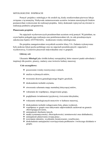 MITOLOGICZNE INSPIRACJE Pomysł projektu z mitologią w tle zrodził się, kiedy zrealizowałam pierwsze lekcje związane z tą tematyką. Niebywałe zainteresowanie uczniów światem starożytnych Greków postanowiłam wykorzystać do realizacji projektu, który doskonale wpisywał się również w realizację podstawy programowej. Planowanie projektu Na zajęciach wychowawczych przedstawiłam uczniom swój pomysł. Wyjaśniłam, na czym będzie polegała jego realizacja oraz poinformowałam ich, że całe przedsięwzięcie zakończone będzie ANTYKIADĄ – konkursem wiedzy mitologicznej. Do projektu zaangażowałam wszystkich uczniów klasy VA. Zadania wykonywane były podczas lekcji języka polskiego oraz na zajęciach pozalekcyjnych i zajęciach z wychowawcą. Uczniowie pracowali indywidualnie oraz w grupach. Główny cel: Ukazanie Mitologii jako źródła kultury europejskiej, które stanowi punkt odwołania i inspiracji dla poetów, pisarzy, malarzy oraz twórców kultury masowej. Cele szczegółowe: poszerzenie wiedzy teoretycznej o mitach, analiza wybranych mitów, tworzenie drzewa genealogicznego bogów greckich, doskonalenie techniki czytania, stworzenie schematu mapy mentalnej dotyczącej mitów, wdrażanie do współpracy, integrowanie grupy, pogłębianie świadomości językowej, ćwiczenia leksykalne, wskazanie mitologicznych motywów w kulturze masowej, doskonalenie techniki redagowania listu, planu wydarzeń, współpraca w grupie oraz nabywanie odpowiednich zachowań na gruncie obowiązujących norm, umiejętność słuchania innych, nauka systematyczności, obowiązkowości, terminowości oraz dokładności, umiejętność planowania swojej pracy , rozwijanie talentów, wyobraźni, kreatywności, wrażliwości, doskonalenie umiejętności rozwiązywania problemów i twórczego działania w grupie. Harmonogram projektu: Lp. Zadanie etapowe 1. Wprowadzenie uczniów w tematykę projektu 2. Zaplanowanie zadań związanych z realizacją projektu: Forma realizacji Spotkanie informacyjne z nauczycielem realizującym projekt Spotkanie z nauczycielem prowadzącym • podział na grupy • przydział obowiązków, zadań • określenie terminów realizacji 3. 4. analiza wybranych mitów gromadzenie informacji przetwarzanie informacji analizowanie, praca twórcza Mariola MitułaBorek lekcje języka polskiego mitów • wskazanie związków frazeologicznych zaczerpniętych z Mitologii • wskazanie inspiracji mitologicznych w malarstwie, literaturze • zwrócenie uwagi na motywy mitologiczne we współczesnym świecie Uczniowie kl.Va zajęcia pozalekcyjne Opracowanie podstawowych informacji związanych z MITOLOGIĄ: • czym jest mit, mitologia – cechy gatunkowe • zapoznanie z treścią wybranych Mariola MitułaBorek Uczniowie kl.Va Prace związane z realizacją poszczególnych zadań: • • • • Odpowiedzialni Mariola MitułaBorek Mariola MitułaBorek lekcje języka polskiego Uczniowie kl.Va 5. Mariola MitułaBorek Prezentacja częściowych efektów pracy: • wskazówki dotyczące „cegiełek” do mapy mentalnej projekty plastyczne cegiełek i akronimów Uczniowie kl.Va • wystawa prac plastycznych – imiona bogów greckich • prezentacja elementów drzewa genealogicznego 6. Zakończenie prac nad: • schematem mapy mentalnej • drzewem genealogicznym 7. Przygotowanie konkursu mitologicznego: • przekazanie uczniom zagadnień • opracowanie testu konkursowego • przygotowanie puzzli mitologicznych • opracowanie krzyżówki mitologicznej 8. prezentacja gotowych prac test konkursowy piramida bogów puzzle Mariola MitułaBorek Tworzenie prezentacji multimedialnej: • wybór najciekawszych zdjęć i prac • segregowanie materiału 9. Prezentacja efektów pracy podczas szkolnego Festiwalu Projektów: Uczniowie kl.Va Uczniowie kl.Va zdjęcia • bogowie greccy – pokaz uczniów przebranych za bogów i herosów Mariola MitułaBorek Uczniowie kl.Va greckich • zaprezentowanie mapy mentalnej i drzewa genealogicznego 10. Projekcja filmu Zmierzch Tytanów film Mariola Mituła Borek 11. Mariola Mituła Borek Ocena pracy: zaangażowanie uczniów podsumowanie doświadczeń zdobytych w realizacji i prezentacji projektu samoocena uczniów, ocena liderów, nauczyciela • • • Samoocena uczniów, ocena nauczyciela Kryteria oceny 1. Wykonanie zadania: Zadanie 1 – Wykonanie plastycznych przedstawień imion bogów greckich (uczeń pamięta, aby odzwierciedlały profesję lub nawiązywały do atrybutu charakterystycznego dla boga) ¾ Zadanie 2– Wykonanie (elementu) drzewa genealogicznego bogów (uczeń pamięta, o poprawnym i estetycznym wykonaniu wylosowanego imienia) ¾ Zadanie 3 – Redagowanie planu wydarzeń do Mitu o Odysie (uczeń pamięta , aby plan został przedstawiony w formie równoważników zdań i przedstawiał wydarzenia w porządku chronologicznym) ¾ Zadanie 4 - Tworzenie listu: ¾ - praca poprawna pod względem kompozycyjnym ( miejscowość, data, nagłówek, podpis, akapity) - praca poprawna pod względem ortograficznym, interpunkcyjnym i stylistycznym ¾ Zadanie 5– Wykonanie cegiełki do mapy mentalnej (uczeń pamięta o estetyce wykonania oraz graficznym elemencie, nawiązującym do informacji) 2. Zaangażowanie oraz aktywne uczestnictwo uczniów w przygotowaniach i podczas prezentacji efektów pracy. 3. Stopień realizacji powierzonych zadań, wywiązywanie się z obowiązków. 4. Współdziałanie i współpraca z członkami grup. 5. Współpraca w grupie: • • • wykonanie zadania, realizacja podjętego zadania w terminie, dbanie o dobrą atmosferę w czasie pracy. Wybór tekstów do analizy Spośród szerokiego wachlarza mitów wybrałam te, które umożliwiają spojrzenie na Mitologię, jako źródło kultury europejskiej, pokazują wyobrażenia starożytnych Greków na temat powstania świata, człowieka, wyjaśniają zagadnienia ludzkiego bytu i pokazują to źródło jako inspirację dla kultury i języka. Skorzystałam również 