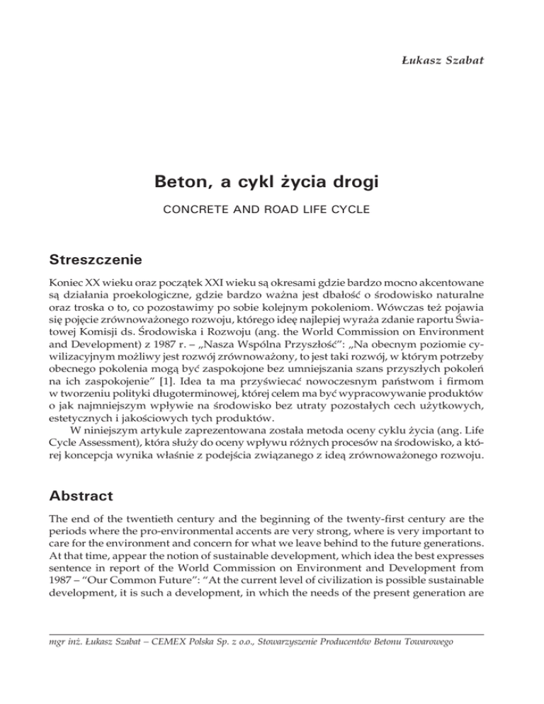 Łukasz Szabat Beton, a cykl życia drogi Concrete and road life cycle Streszczenie Koniec XX wieku oraz początek XXI wieku są okresami gdzie bardzo mocno akcentowane są działania proekologiczne, gdzie bardzo ważna jest dbałość o środowisko naturalne oraz troska o to, co pozostawimy po sobie kolejnym pokoleniom. Wówczas też pojawia się pojęcie zrównoważonego rozwoju, którego ideę najlepiej wyraża zdanie raportu Światowej Komisji ds. Środowiska i Rozwoju (ang. the World Commission on Environment and Development) z 1987 r. – „Nasza Wspólna Przyszłość”: „Na obecnym poziomie cywilizacyjnym możliwy jest rozwój zrównoważony, to jest taki rozwój, w którym potrzeby obecnego pokolenia mogą być zaspokojone bez umniejszania szans przyszłych pokoleń na ich zaspokojenie” [1]. Idea ta ma przyświecać nowoczesnym państwom i firmom w tworzeniu polityki długoterminowej, której celem ma być wypracowywanie produktów o jak najmniejszym wpływie na środowisko bez utraty pozostałych cech użytkowych, estetycznych i jakościowych tych produktów. W niniejszym artykule zaprezentowana została metoda oceny cyklu życia (ang. Life Cycle Assessment), która służy do oceny wpływu różnych procesów na środowisko, a której koncepcja wynika właśnie z podejścia związanego z ideą zrównoważonego rozwoju. Abstract The end of the twentieth century and the beginning of the twenty-first century are the periods where the pro-environmental accents are very strong, where is very important to care for the environment and concern for what we leave behind to the future generations. At that time, appear the notion of sustainable development, which idea the best expresses sentence in report of the World Commission on Environment and Development from 1987 – “Our Common Future”: “At the current level of civilization is possible sustainable development, it is such a development, in which the needs of the present generation are mgr inż. Łukasz Szabat – CEMEX Polska Sp. z o.o., Stowarzyszenie Producentów Betonu Towarowego met without compromising the ability of future generations to meet their own needs” [1]. This idea has guided modern states and businesses to create long-term policy, which aims to be developing products with minimal environmental impact with no loss of other functional characteristics, aesthetic and quality of these products. Life cycle assessment method presented in this article, is a methodology which is used to assess the impact of different processes on the environment and the concept stems from the approach associated with sustainable development. Beton, a cykl życia drogi 1.Wstęp Każdy produkt ma swój cykl życia, w którym możemy wskazać poszczególne fazy jego istnienia, począwszy od fazy pozyskania surowców do jego wytworzenia, aż po ostatnią fazę, jaką jest jego utylizacja i zagospodarowanie wynikających z niej odpadów, dlatego też koncepcja cyklu życia jest bardzo często określana jako podejście „od kołyski aż po grób”. Analiza cyklu życia produktu przeprowadzana jest z dwóch głównych podwodów: –– aby móc zidentyfikować kluczowe obszary procesu, w których będzie można wprowadzić działania korygujące; –– aby móc porównać wpływ różnych rozwiązań na środowisko naturalne i móc wytypować proces / produkt o najmniejszym oddziaływaniu na środowisko. Obydwa te powody są sensem przeprowadzania analizy LCA dla różnych produktów, natomiast ten drugi z nich to jednocześnie treść niniejszego artykułu, czyli analiza cyklu życia betonu, który został zastosowany do budowy drogi oraz porównanie dwóch technologii budowy dróg – technologii betonowej i asfaltowej. Porównanie to będzie dotyczyło zarówno aspektu wpływów na środowisko (LCA), jak również części kosztowej całego procesu życia drogi, czyli porównania kosztów budowy, remontów i utrzymania drogi (LCCA). 2.Uregulowania dotyczące oceny cyklu życia Ocena cyklu życia jest z powodzeniem stosowana już od lat 90. XX wieku [2], jako technika pozwalająca na śledzenie całego cyklu życia, począwszy od wydobycia surowców potrzebnych do wytworzenia konkretnego produktu, aż do ostatecznego unieszkodliwienia odpadów powstałych przy jego recyklingu na końcu życia produktu. W latach 90. XX wieku pojawiły się pierwsze uregulowania normowe dotyczące LCA, które zostały wprowadzone w formie norm ISO i były systematycznie tłumaczone na język polski przez Komitet Techniczny ISO/TC 207 „Zarządzanie Środowiskowe” (PKN). W polskich uregulowaniach normowych zasady, wymagania i wytyczne dotyczące oceny cyklu życia opisane są w dwóch głównych normach związanych z zarządzaniem środowiskowym: –– PN-EN ISO 14040:2009 „Zarządzanie środowiskowe – Ocena Cyklu Życia – Zasady i struktura”. –– PN-EN ISO 14044:2009 „Zarządzanie środowiskowe – Ocena Cyklu Życia – Wymagania i wytyczne”. W Polsce idea wdrażania metodyki wykorzystującej ocenę cyklu życia pojawiła się w obowiązujących dokumentach nawet wcześniej niż pojawiły się polskojęzyczne tłumaczenia norm ISO, tj. m.in. w [3]: –– ustawie Prawo ochrony środowiska z 2001 r. (Dz. U. Nr 62, poz. 627), –– II Polityce Ekologicznej Państwa, przyjętej przez Radę Ministrów w czerwcu 2000 r. i Sejm RP w sierpniu 2001 oraz w Polityce Ekologicznej Państwa na lata 2003–2006 z uwzględnieniem perspektywy na lata 2007–2010 z 2002 r., jak również w Polityce Ekologicznej Państwa na lata 2007–2010 z uwzględnieniem perspektywy na lata 2011–2014 opracowanej w Ministerstwie Środowiska w grudniu 2006 r. –– Strategii Rozwoju Kraju na Lata 2007–2015, przyjętej przez Radę Ministrów 29.11.2006 r. W dokumentach tych propozycja zastosowania LCA obejmowała przede wszystkim ocenę nowych technologii, zielone zamówienia publiczne, gospodarkę odpadami i eko-znakowanie. W kolejnych latach, wraz z opra