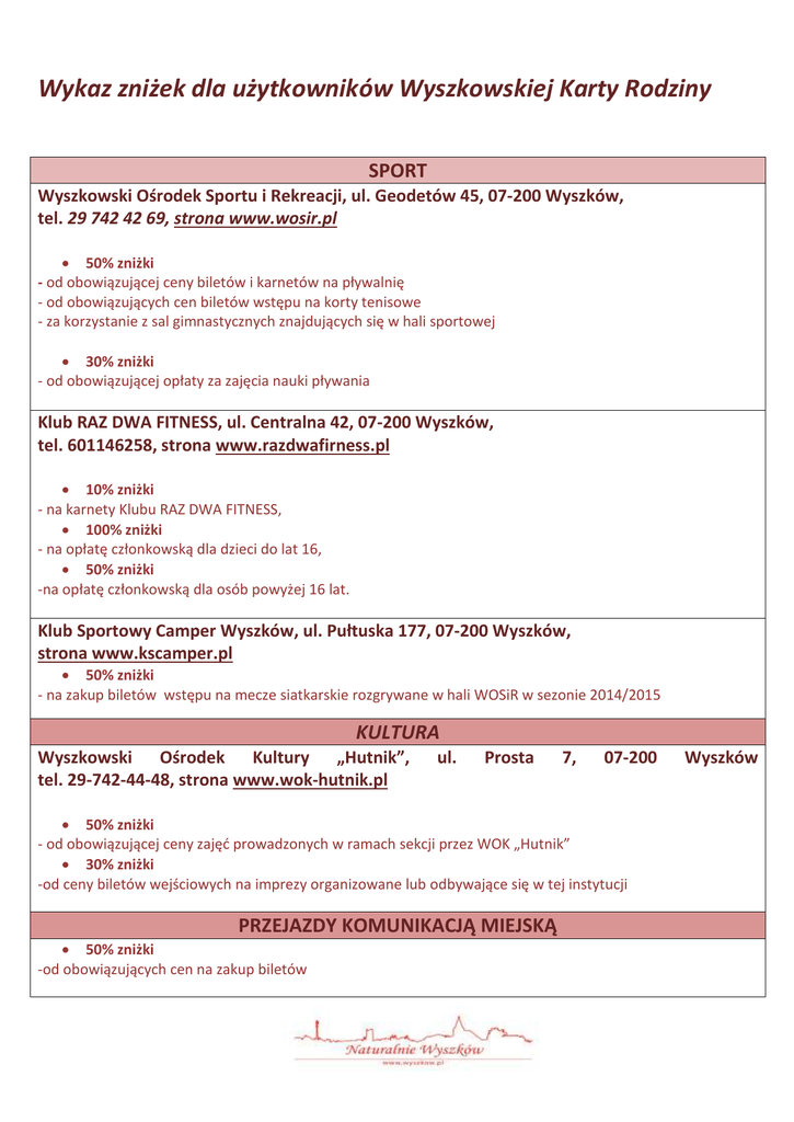 Wykaz zniżek dla użytkowników Wyszkowskiej Karty Rodziny SPORT Wyszkowski Ośrodek Sportu i Rekreacji, ul. Geodetów 45, 07-200 Wyszków, tel. 29 742 42 69, strona www.wosir.pl 50% zniżki - od obowiązującej ceny biletów i karnetów na pływalnię - od obowiązujących cen biletów wstępu na korty tenisowe - za korzystanie z sal gimnastycznych znajdujących się w hali sportowej 30% zniżki - od obowiązującej opłaty za zajęcia nauki pływania Klub RAZ DWA FITNESS, ul. Centralna 42, 07-200 Wyszków, tel. 601146258, strona www.razdwafirness.pl 10% zniżki - na karnety Klubu RAZ DWA FITNESS, 100% zniżki - na opłatę członkowską dla dzieci do lat 16, 50% zniżki -na opłatę członkowską dla osób powyżej 16 lat. Klub Sportowy Camper Wyszków, ul. Pułtuska 177, 07-200 Wyszków, strona www.kscamper.pl 50% zniżki - na zakup biletów wstępu na mecze siatkarskie rozgrywane w hali WOSiR w sezonie 2014/2015 KULTURA Wyszkowski Ośrodek Kultury „Hutnik”, tel. 29-742-44-48, strona www.wok-hutnik.pl ul. Prosta 7, 07-200 50% zniżki - od obowiązującej ceny zajęć prowadzonych w ramach sekcji przez WOK „Hutnik” 30% zniżki -od ceny biletów wejściowych na imprezy organizowane lub odbywające się w tej instytucji PRZEJAZDY KOMUNIKACJĄ MIEJSKĄ 50% zniżki -od obowiązujących cen na zakup biletów Wyszków EDUKACJA, OPIEKA NAD DZIECKIEM Publiczne przedszkola 30% zniżki - w opłatach za świadczenia udzielane przez publiczne przedszkola prowadzone przez Gminę Wyszków, wykraczające poza podstawę programową wychowania przedszkolnego – na każde dziecko. Ulga przysługuje rodzinie, która na bieżąco uiszcza opłaty za świadczenia gminnych przedszkoli wykraczające poza podstawę programową wychowania przedszkolnego.1 Rodziny mogą korzystać tylko z jednej, wybranej przez siebie ulgi, tj. zniżki wynikającej z WKR lub zniżki wynikającej z Uchwały nr IX/53/11 Rady Miejskiej w Wyszkowie z dnia 26 maja 2011 r. w sprawie ustalenia opłat za świadczenia udzielane przez publiczne przedszkola prowadzone przez Gminę Wyszków. Kreatywka, ul. Chopina 9, 07-200 Wyszków, tel. 604-074-408, strona www.kreatywka.pl 20% zniżki - na zajęcia ogólnorozwojowe przy muzyce dla dzieci w wieku od 0 do 4,5 roku Przedszkole Bezpieczny Przedszkolak, ul. Geodetów 76, 07-200 Wyszków 50 % zniżki - w opłatach za przedszkole na jedno dziecko 70 % zniżki - w opłatach za przedszkole na dwoje dzieci WYPOCZYNEK I REKREAZJA Wypożyczalnia kajaków „Kamyk”, ul. Różana 6 Kamieńczyk, 07-202 Wyszków 25% zniżki - na wypożyczenie kajaków „Agroturystyka u Kaflika”, ul. Nadbużna 39, 07-221 Brańszczyk, tel. 503144834, strona www.agroturystykaukaflika.pl 20% zniżki - na noclegi, wynajem kajaków i rowerów USŁUGI LOWELEK.PL, ul. I Armii Wojska Polskiego 97, 07-202 Wyszków 7% zniżki - na zakup rowerów 5% zniżki - na części i akcesoria rowerowe Kancelaria Radcy Prawnego Krzysztof Najmoła, ul. I. Daszyńskiego 21A, 07-200 Wyszków 33% zniżki - na porady i konsultacje prawne z zakresu prawa pracy i ubezpieczeń społecznych (w sprawach skomplikowanych) 50% zniżki - na porady i konsultacje prawne z zakresu prawa pracy i ubezpieczeń społecznych (w sprawach prostych i niewymagających badania dokumentów) P.H.U. Dajmex, ul. Pułtuska 112B, 07-200 Wyszków 3% zniżki - na meble kuchenne, biurka, szafy wnękowe, szafki wolnostojące (do 10 tys zł) 5% zniżki - na meble kuchenne, biurka, szafy wnękowe, szafki wolnostojące (powyżej 10 tys zł) Restauracja "Baśniowa", ul. Poniatowskiego 10, 07-200 Wyszków 20% zniżki - na wszystkie dania z karty menu PSS „Społem” w Wyszkowie 5% zniżki - na całą ofertę towarową w sklepie z odzieżą dziecięcą „Krasnal” PSS Społem, ul. Gen. J. Sowińskiego 61, 07200 Wyszków 10% zniżki - na „danie dnia” w Restauracji „Wyszkowianka” ul. Daszyńskiego 10, 07-200 Wyszków Artykuły biurowe Office Expert , ul. J. Piłsudskiego 101, 07-200 Wyszków 8% zniżki - na artykuły szkolne i biurowe (z wyjątkiem papieru xero, tuszy i tonerów oraz produktów z promocji) AGA hurtownia art. Dziecięcych, ul. 11 Listopada 29, 07-200 Wyszków 10% zniżki - na akcesoria, ubranka oraz zabawki 5% zniżki - na wózki, łóżeczka, foteliki samochodowe Sklep Komputerowy „GLOBAL” , ul. I Armii Wojska Polskiego 39, 07-200 Wyszków 3% zniżki - na komputery, laptopy, drukarki, monitory 8% zniżki - na akcesoria komputerowe 10% zniżki - na tusze, tonery 40% zniżki - na sługi serwisowe Geppa sklep z zabawkami, Galeria Wyszków 2 piętro, ul. Sowińskiego 62, 07-200 Wyszków 7% zniżki - na wszystkie produkty w sklepie (z wyjątkiem produktów będących w promocji) Księgarnia KRAM, ul. Okrzei 73, 07-200 Wyszków 5% zniżki - na podręczniki szkolne 10% zniżki - na książki do czytania i artykuły papiernicze Sklep rowerowy „TRYBIK”, ul. Wąska 13, 07-200 Wyszków 5% zniżki - na rowery i części do rowerów 10% zniżki - na akcesoria rowerowe 20% zniżki - na serwis rowerów DERACOM Komputery Osobiste, ul. 11 listopada 30, 07-200 Wyszków Zniżki nie obejmują produktów przecenionych oraz tych, które są w aktualnych akcjach promocyjnych 40% zniżki - na usługi serwisowe (np. instalacje systemu, konfiguracja, odwirusowanie komputera, przegląd) 10% zniżki - na produkty z przedziału 1-29,99 zł (np. płyty, gry, tusze, zabawki dla dzieci, kable) 6% zniżki - na produkty z przedziału 30-99,99 zł (np. tonery, gry, zabawki, programy, GSM, drobne RTV i AGD) 4% zniżki - na produkty powyżej 100 zł (np. notebooki, aparaty FOTO, telefony GSM, komputery, duże RTV i AGD) Salon Optyczny Beata Kuśmierczyk-Ćwiek, ul. Pułtuska 36, 07-200 Wyszków, ul. I Armii Wojska Polskiego 82A, 07-200 Wyszków 12 % zniżki - na okulary korekcyjne 12 % zniżki - na szkła korekcyjne 10 % zniżki - na soczewki kontaktowe 8 % zniżki - na okulary przeciwsłoneczne 8 % zniżki - na pozostały asortyment Zakład fotograficzny Bogusław Babis, 
