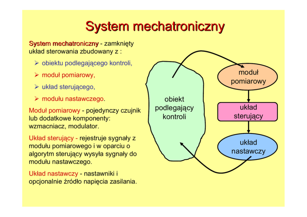 System mechatroniczny System mechatroniczny - zamknięty układ sterowania zbudowany z : ¾ obiektu podlegającego kontroli, moduł pomiarowy ¾ moduł pomiarowy, ¾ układ sterującego, ¾ modułu nastawczego. Moduł pomiarowy - pojedynczy czujnik lub dodatkowe komponenty: wzmacniacz, modulator. Układ sterujący - rejestruje sygnały z modułu pomiarowego i w oparciu o algorytm sterujący wysyła sygnały do modułu nastawczego. Układ nastawczy - nastawniki i opcjonalnie źródło napięcia zasilania. obiekt podlegający kontroli układ sterujący układ nastawczy Typowe ogólne podejścia do projektowania składników systemu mechatronicznego rozważanych oddzielnie: ¾ projektowanie zespołów mechanicznych; mechanicznych ¾ projektowanie zespołów elektronicznych; elektronicznych ¾ projektowanie oprogramowania. oprogramowania Projektowanie zespołów mechanicznych systemu dotyczy zależności przestrzennych i stąd jest samo w sobie procesem trójwymiarowym (3D). 3D Projektowanie zespołów elektronicznych systemu dotyczy przetwarzania sygnału i wzajemnego połączenia elementów dyskretnych i może być traktowane jako proces dwuwymiarowy (2D). 2D Projektowanie oprogramowania dotyczy opracowania algorytmów przetwarzających dane i dlatego (z fizykalnego punktu widzenia) jest bezwymiarowe. W projektowaniu wykorzystuje się: systemów mechatronicznych ¾klasyczną teoria mechaniki, ¾klasyczną teoria elektromagnetyzmu. elektromagnetyzmu Systemy mechatroniczne jako zintegrowane urządzenia wymagają zintegrowanego projektowania. projektowania Mechatroniczne podejście do projektowania charakteryzuje się tym, że system mechaniczny i elektroniczny od samego początku należy traktować jako zintegrowany przestrzennie i funkcjonalnie system całkowity. Postępowanie konwencjonalne Postępowanie mechatroniczne projekt konstrukcji projekt konstrukcji układ mechaniczny elektronika oddzielne elementy układ mechaniczny układ elektroniczny całościowy układ mechatroniczny To, co łatwiej jest rozwiązać mechanicznie, rozwiązuje się środkami mechanicznymi, to zaś, co łatwiej jest rozwiązać elektronicznie − elektronicznymi i komputerowymi. Klasyfikacja systemów mechatronicznych W zależności od technologii produkcji oraz wielkości bloków funkcjonalnych wchodzących w skład systemu mechatronicznego wyróżniamy trzy rodzaje systemów: ¾ klasyczne systemy mechatroniczne, ¾ systemy mikroelektromechaniczne (MEMS – MicroElectroMechanical Systems), ¾ systemy nanooelektromechaniczne (NEMS – NanoElectroMechanical Systems). Systemy mechatroniczne ¾ klasyczne systemy mechatroniczne ¾ systemy mikroelektromechaniczne MEMS ¾ systemy nanooelektromechaniczne NEMS KLASYCZNE SYSTEMY (KONSTRUKCJE) MECHANICZNE MECHANIZMY SYSTEMY MECHATRONICZNE SCHEMAT SYSTEMU MECHATRONICZNEGO WEJŚCIE UKŁAD MECHANICZNY WYJŚCIE CZUJNIKI NASTAWNIKI PROCESOR(y) czujniki temperatury zewnętrznej i wewnętrznej powietrza czujniki napięcia pasów czujniki założenia pasów czujnik poziomu paliwa czujnik oleju czujnik deszczu czujnik temperatury wody chłodzącej czujnik dwutlenku grawimetr czujnik parkowania prędkościomierz odometr tachometr GPS czujniki ciśnienia w ogumieniu system antywłamaniowy czujniki prędkości obrotowej kół czujnik tlenu (O2) Spaliny silnika benzynowego zawierają do 2% tlenu. Kiedy spaliny zawierają 2% tlenu określa się je jako „ubogie”. W przypadku takich spalin tworzą się tlenki azotu. I odwrotnie, kiedy spaliny zawierają prawie 0% tlenu określa się je mianem „bogatych”. Tu dla odmiany powstają węglowodory i tlenek węgla. Napięcie wyjściowe czujnika O2 zależy od wielkości udziału tlenu w spalinach. wtrysk paliwa moduł sterujący silnika recyrkulacja gazów czujnik O2 Uzyskane napięcia przesyłane są do modułu sterującego silnika, a ten reaguje na nie w postaci kalibracji stosunku mieszanki powietrze/benzyna. system ABS ABS (niem. Antiblockiersystem; ang. Anti-Lock Braking System) - układ stosowany w pojazdach mechanicznych w celu zapobiegania blokowaniu się kół podczas hamowania, jako element układu hamulcowego. ABS zapobiega zjawiskom występującym po zablokowaniu kół, takim jak ściąganie samochodu w bok, wirowanie samochodu, utrata kontroli nad kierowaniem samochodem. Typowy system ABS zbudowany jest z układów kontrolujących prędkość obrotową każdego z kół oraz zaworów (układów) zmniejszających ciśnienie oddzielnie w każdym obwodzie hamowania, a w rozbudowanych układach indywidualnie na każdym kole. Działanie zaworów jest sterowane przez system komputerowy na postawie obrotów kół. wycieraczka szyby przedniej kropla deszczu • zjawisko obicia zewnętrznego • dioda elektroluminescencyjna • fotodioda → wzmacniacz→ kontroler→ włącznik wycieraczki, zamykanie okien LED czujnik światła oddalonego szyba fotodioda czujnik światła otaczającego Dioda elektroluminescencyjna, dioda świecąca, LED (ang. lightemitting diode) – dioda zaliczana do półprzewodnikowych przyrządów optoelektronicznych, emitujących promieniowanie w zakresie światła widzialnego, podczerwieni i ultrafioletu. poduszka powietrzna poduszka powietrzna inflator grawimetr poduszka powietrzna inflator grawimetr azot Proces zadziałania poduszki powietrznej zderzenie 3 ms zadziałanie czujnika odpalenie inflatora uwolnienie azotu napełniającego poduszkę 20 ms 35 ms napełnienie poduszki pełne napełnienie poduszki zabezpieczenie pasażera opróżnienie poduszki z azotu koniec procesu 105 ms 40 ms Systemy mechatroniczne ¾ klasyczne systemy mechatroniczne ¾ systemy mikroelektromechaniczne MEMS ¾ systemy nanooelektromechaniczne NEMS Systemy MEMS i NEMS charakterystyka ogólna MEMS (ang. Micro Electro-Mechanical Systems), lub też Mikrosystemy - określenie zintegrowanych układów elektro-mechanicznych, których co najmniej jeden wymiar szczególny znajduje się w skali mikro (0,1 - 100 μm). Różne nazwy dla system