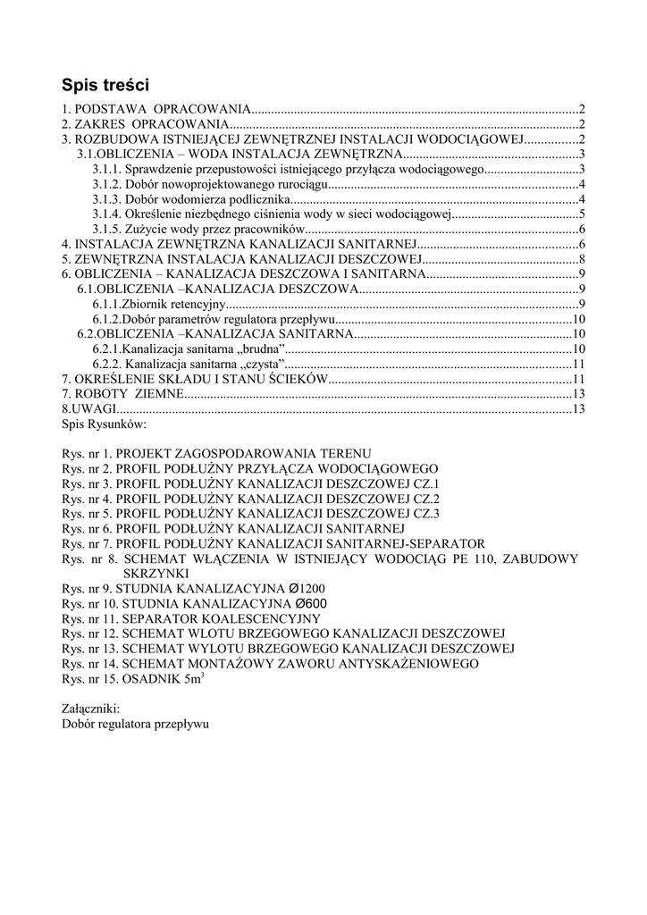 Spis treści 1. PODSTAWA OPRACOWANIA....................................................................................................2 2. ZAKRES OPRACOWANIA...........................................................................................................2 3. ROZBUDOWA ISTNIEJĄCEJ ZEWNĘTRZNEJ INSTALACJI WODOCIĄGOWEJ................2 3.1.OBLICZENIA – WODA INSTALACJA ZEWNĘTRZNA.....................................................3 3.1.1. Sprawdzenie przepustowości istniejącego przyłącza wodociągowego.............................3 3.1.2. Dobór nowoprojektowanego rurociągu............................................................................4 3.1.3. Dobór wodomierza podlicznika........................................................................................4 3.1.4. Określenie niezbędnego ciśnienia wody w sieci wodociągowej.......................................5 3.1.5. ZuŜycie wody przez pracowników...................................................................................6 4. INSTALACJA ZEWNĘTRZNA KANALIZACJI SANITARNEJ.................................................6 5. ZEWNĘTRZNA INSTALACJA KANALIZACJI DESZCZOWEJ................................................8 6. OBLICZENIA – KANALIZACJA DESZCZOWA I SANITARNA..............................................9 6.1.OBLICZENIA –KANALIZACJA DESZCZOWA...................................................................9 6.1.1.Zbiornik retencyjny............................................................................................................9 6.1.2.Dobór parametrów regulatora przepływu........................................................................10 6.2.OBLICZENIA –KANALIZACJA SANITARNA...................................................................10 6.2.1.Kanalizacja sanitarna „brudna”........................................................................................10 6.2.2. Kanalizacja sanitarna „czysta”........................................................................................11 7. OKREŚLENIE SKŁADU I STANU ŚCIEKÓW..........................................................................11 7. ROBOTY ZIEMNE.......................................................................................................................13 8.UWAGI...........................................................................................................................................13 Spis Rysunków: Rys. nr 1. PROJEKT ZAGOSPODAROWANIA TERENU Rys. nr 2. PROFIL PODŁUśNY PRZYŁĄCZA WODOCIĄGOWEGO Rys. nr 3. PROFIL PODŁUśNY KANALIZACJI DESZCZOWEJ CZ.1 Rys. nr 4. PROFIL PODŁUśNY KANALIZACJI DESZCZOWEJ CZ.2 Rys. nr 5. PROFIL PODŁUśNY KANALIZACJI DESZCZOWEJ CZ.3 Rys. nr 6. PROFIL PODŁUśNY KANALIZACJI SANITARNEJ Rys. nr 7. PROFIL PODŁUśNY KANALIZACJI SANITARNEJ-SEPARATOR Rys. nr 8. SCHEMAT WŁĄCZENIA W ISTNIEJĄCY WODOCIĄG PE 110, ZABUDOWY SKRZYNKI Rys. nr 9. STUDNIA KANALIZACYJNA Ø1200 Rys. nr 10. STUDNIA KANALIZACYJNA Ø600 Rys. nr 11. SEPARATOR KOALESCENCYJNY Rys. nr 12. SCHEMAT WLOTU BRZEGOWEGO KANALIZACJI DESZCZOWEJ Rys. nr 13. SCHEMAT WYLOTU BRZEGOWEGO KANALIZACJI DESZCZOWEJ Rys. nr 14. SCHEMAT MONTAśOWY ZAWORU ANTYSKAśENIOWEGO Rys. nr 15. OSADNIK 5m3 Załączniki: Dobór regulatora przepływu OPIS TECHNICZNY DO PROJEKTU WYKONAWCZY BUDYNKU ZAPLECZA WARSZTATOWO-GARAśOWEGO PORTU LOTNICZEGO IM. WŁ. REYMONTA W ŁODZI UL. GEN. S. MACZKA 35 94-328 ŁÓDŹ obręb G-21 dz. ew. 4/59 1. PODSTAWA OPRACOWANIA • • • • • Zlecenie Inwestora; Mapa sytuacyjno-wysokościowa do celów projektowych; Projekt zagospodarowania; Projekt drogowy; Obowiązujące normy i przepisy. 2. ZAKRES OPRACOWANIA Projekt swoim zakresem obejmuje rozbudowę zewnętrznej instalacji wodociągowej i kanalizacyjnej na terenie Portu Lotniczego im. Władysława Reymonta na cele zasilania budynku zaplecza warsztatowo-garaŜowego: ● ● ● zewnętrzna instalacja wodociągowa dla nowoprojektowanego budynku na cele socjalne i gospodarcze zewnętrzna instalacja kanalizacji sanitarnej zewnętrzna instalacja kanalizacji deszczowej 3. ROZBUDOWA WODOCIĄGOWEJ ISTNIEJĄCEJ ZEWNĘTRZNEJ INSTALACJI Do projektowanego budynku zaplecza warsztatowo-garaŜowego przewiduje się doprowadzenie wody z istniejącej zewnętrznej instalacji wodociągowej znajdującej się na terenie Portu Lotniczego im. Władysława Reymonta - Ø110 wykonanej z PE. Woda będzie wykorzystywana do celów socjalnych pracowników zatrudnionych w nowoprojektowanym budynku oraz celów gospodarczych (myjnia, warsztaty) Podłączenie do istniejącej instalacji wodociągowej naleŜy wykonać za pomocą opaski do nawiercania rurociągów PE Ø110, np. firmy Hawle typ Haku nr kat.5230 - Ø110/dn80 za którą naleŜy zamontować zwęŜkę dwu kołnierzową L=200mm - dn80/65 np. firmy Hawle nr kat. 540, a następnie zasuwę kołnierzową, miękko uszczelniającą, klinową z kołnierzem i króćcem do zgrzania PE np. firmy Hawle nr kat. 4090E2. Zasuwę naleŜy wyposaŜyć w obudowę teleskopową oraz skrzynkę uliczną Instalację zaprojektowano z rur PE 80 SDR11 PN10 Ø 75 x 6,8 mm. Instalację oznakować na całej długości taśmą lokalizacyjno - ostrzegawczą koloru biało niebieskiego z wkładką metalową, prowadzoną 20cm nad wierzchem rury wodociągowej. Instalację prowadzić ze spadkiem podanym na profilu podłuŜnym. Zestaw wodomierzowy na cele socjalne zamontować w nowoprojekowanym budynku - wyposaŜyć w zawory odcinające za i przed wodomierzem. Za zaworem odcinającym umieścić zawór antyskaŜeniowy typ EA-251. Przy braku zagłębienia 1,5 m zastosować ocieplenie z ŜuŜla wielkopiecowego 30cm przykrytego papą. 3.1.OBLICZENIA – WODA INSTALACJA ZEWNĘTRZNA 3.1.1. Sprawdzenie przepustowości istniejącego przyłącza wodociągowego Istniejące przyłącze Ø100 zasila: ● ● ● ● ● ● Terminal nr 1 Terminal nr 2 Budynki aeroklubu Budynek LSP Budynek kontroli ruchu lotniczego (w faz