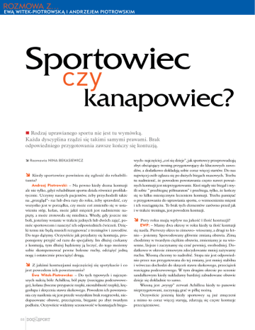 Rozmowa z… Ewą Witek-PiotrowskĄ i AndrzejEM PiotrowskiM Sportowiec kanapowiec? n Rodzaj uprawianego sportu nie jest tu wymówką. Każda dyscyplina rządzi się takimi samymi prawami. Brak odpowiedniego przygotowania zawsze kończy się kontuzją. Rozmawia Nina Bekasiewicz Kiedy sportowiec powinien się zgłosić do rehabilitanta? Andrzej Piotrowski: – Na pewno kiedy dozna kontuzji ale nie tylko, gdyż rehabilitant sportu działa również profilaktycznie. Uczymy naszych pacjentów, żeby przychodzili także na „przegląd”- raz lub dwa razy do roku, żeby sprawdzić, czy wszystko jest w porządku, czy może coś zmieniło się w ustawieniu stóp, kolan, może jakiś mięsień jest nadmiernie napięty, a może zrotowała się miednica. Wtedy, gdy jeszcze nie boli, jesteśmy wstanie w trakcie jednych lub dwóch zajęć, pomóc sportowcom i nauczyć ich odpowiednich ćwiczeń. Dzięki temu nie będą musieli rezygnować z treningów i zawodów. Do tego dążymy. Oczywiście jak przydarzy się kontuzja, proponujemy przyjść od razu do specjalisty. Im dłużej czekamy z kontuzją, tym dłużej będziemy ją leczyć, do tego możemy sobie skompensować pewne bolesne ruchy, odciążyć jedną nogę i ostatecznie przeciążyć drugą. Z jakimi kontuzjami najczęściej się spotykacie i co jest powodem ich powstawania? Ewa Witek-Piotrowska: – Do tych typowych i najczęstszych należą bóle Achillesa, ból pięty (rozcięgna podeszwowego), kolana (boczne przyparcie rzepki, niestabilność rzepki), kręgosłupa i skręcenia stawu skokowego. Powodem ich powstawania czy nasilenia się jest przede wszystkim brak rozgrzewki, niedopasowane obuwie, przeciążenia, bieganie po zbyt twardym podłożu. Oczywiście widzimy sezonowość w kontuzjach biego88 wych- najczęściej „coś się dzieje”, jak sportowcy przeprowadzają zbyt obciążający trening przygotowujący do kluczowych zawodów, a dodatkowo dokładają sobie coraz więcej startów. Do nas najwięcej osób zgłasza się po dużych biegach masowych. Trzeba tu nadmienić, że powodem powstawania często nawet poważnych kontuzji jest nieprzygotowanie. Ktoś nigdy nie biegał i myśli sobie ” przebiegnę półmaraton” i przebiega, tylko, że kończy się to kilku miesięcznym leczeniem kontuzji. Trzeba pamiętać o przygotowaniu do uprawiania sportu, o wzmocnieniu mięsni i ich rozciągnięciu. To brak tych elementów zarówno przed jak i w trakcie treningu, jest powodem kontuzji. Pory roku mają wpływ na jakość i ilość kontuzji? EWP: – Mamy dwa okresy w roku kiedy ta ilość kontuzji się nasila. Pierwszy okres to zimowo- wiosenny, a drugi to letnio – jesienny. Spowodowany głównie zmianą obuwia. Zimą chodzimy w twardym ciężkim obuwiu, zmieniamy je na wiosenne, lżejsze i zaczynamy się czuć pewniej, swobodniej. Dodatkowo w okresie zimowym zdecydowanie mniej zażywamy ruchu. Wiosną chcemy to nadrobić. Stopa nie jest odpowiednio przez nas przygotowana do tej zmiany, jest mniej stabilna i wówczas dochodzi do skręceń stawu skokowego, przeciążeń rozcięgna podeszwowego. W tym drugim okresie po sezonie sandałkowym kiedy nakładamy bardziej zabudowane obuwie dzieje się dokładnie to samo. Wiosną jest „wysyp” zerwań Achillesa kiedy to panowie nieprzygotowani, zaczynają grać w piłkę nożną. Oczywiście jesienią kiedy sportowcy są już zmęczeni a mimo to coraz więcej starują, zdarzają się częste kontuzje przeciążeniowe. Rozmowa z… Ewą Witek-PiotrowskĄ i AndrzejEM PiotrowskiM A jaki wpływ na kontuzję ma zmiana podłoża. Po Ewa Witek Piotrowska bieganiu na hali przenosimy się na podłoże trawiaste. Co się wówczas dzieje? EWP: – Podłoże halowe jest bardzo twarde. Biega się po nim zdecydowanie szybciej niż po trawie. Brak odpowiedniego obuwia i przygotowania się do tej zmiany powoduje skręcenia stawu skokowego, bóle kręgosłupa i naderwanie głównie ścięgna Achillesa, które jest największym ścięgnem naszego organizmu, a jednocześnie najczęściej uszkadzanym. Fizjoterapeutka z wieloletnim doświadczeniem, mgr biologii o specjalizacji antropologia. Tancerka, instruktorka tańca, świadomości ciała, tańca dla osób niepełnosprawnych. Aktywny sportowiec, biega w barwach Entre.pl team, razem z mężem jeździ na nartach, rowerze. Zajmuje się rehabilitacją, diagnostyką stóp i biomechaniki biegania. Specjalizuje się w leczeniu urazów sportowych, schorzeniach Achillesa, stawu skokowego i stopy, kolana, mięśni i kręgosłupa. Co jest powodem tych uszkodzeń? EWP: – Przyczyn jest wiele. Pierwsza i najważniejsza to niewłaściwie prowadzony trening bez ćwiczeń rozciągających. Kolejne to duże przeciążenia, brak czasu na wypoczynek i regenerację, przykurcz mięśni łydki, zaburzenie napięć w taśmach mięśniowo – powięziowych. Używanie zbyt ciasnego ugniatającego piętę obuwia też znacząco wpływa na stan ścięgna. Andrzej Piotrowski Wspinacz, instruktor wspinaczki, biegacz, narciarz i kolarz. Doświadczony masażysta i instruktor sportu, przygotowuje do powrotu do sportu. Jest specjalistą w doborze butów biegowych, biomechanice biegania. Marek Zawadka www.klinikarehabilitacji.pl 89 Rozmowa z… Ewą Witek-PiotrowskĄ i AndrzejEM PiotrowskiM Ćwiczenia ogólnorozwojowe 1.Stabilizacja tułowia. Stopy oparte na piłce, ręce na podłodze. Podnoszenie nogi, ręki do góry. Brzuch nie może opaść w dół. Bardzo trudne i wymagające ćwiczenie, wzmacniające „centrum”- mięsień poprzeczny brzucha, mięśnie grzbietu. Ćwiczenie będzie pomocne przy bieganiu, utrzymując mięśnie miednicy i tułowia w prawidłowym napięciu. Dzięki temu możemy uniknąć problemów z kręgosłupem. Nie polecamy wykonywać tego ćwiczenia, jeżeli jesteście początkujący. 2.Wzmacnianie brzucha. Zabawne i przyjemne ćwiczenie w parach, polegające na podnoszeniu piłki i przekazywaniu jej partnerowi. Wzmacnianie mięśni brzucha jest niezbędne dla praw