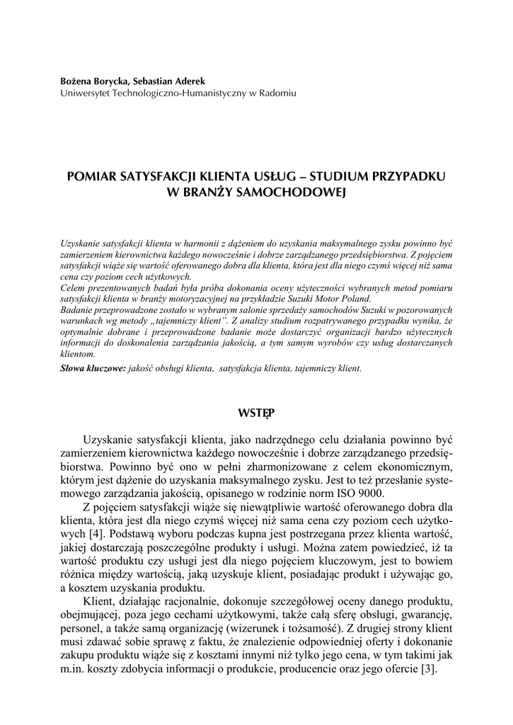 Bożena Borycka, Sebastian Aderek Uniwersytet Technologiczno-Humanistyczny w Radomiu POMIAR SATYSFAKCJI KLIENTA USŁUG – STUDIUM PRZYPADKU W BRANŻY SAMOCHODOWEJ Uzyskanie satysfakcji klienta w harmonii z dążeniem do uzyskania maksymalnego zysku powinno być zamierzeniem kierownictwa każdego nowocześnie i dobrze zarządzanego przedsiębiorstwa. Z pojęciem satysfakcji wiąże się wartość oferowanego dobra dla klienta, która jest dla niego czymś więcej niż sama cena czy poziom cech użytkowych. Celem prezentowanych badań była próba dokonania oceny użyteczności wybranych metod pomiaru satysfakcji klienta w branży motoryzacyjnej na przykładzie Suzuki Motor Poland. Badanie przeprowadzone zostało w wybranym salonie sprzedaży samochodów Suzuki w pozorowanych warunkach wg metody „tajemniczy klient”. Z analizy studium rozpatrywanego przypadku wynika, że optymalnie dobrane i przeprowadzone badanie może dostarczyć organizacji bardzo użytecznych informacji do doskonalenia zarządzania jakością, a tym samym wyrobów czy usług dostarczanych klientom. Słowa kluczowe: jakość obsługi klienta, satysfakcja klienta, tajemniczy klient. WSTĘP Uzyskanie satysfakcji klienta, jako nadrzędnego celu działania powinno być zamierzeniem kierownictwa każdego nowocześnie i dobrze zarządzanego przedsiębiorstwa. Powinno być ono w pełni zharmonizowane z celem ekonomicznym, którym jest dążenie do uzyskania maksymalnego zysku. Jest to też przesłanie systemowego zarządzania jakością, opisanego w rodzinie norm ISO 9000. Z pojęciem satysfakcji wiąże się niewątpliwie wartość oferowanego dobra dla klienta, która jest dla niego czymś więcej niż sama cena czy poziom cech użytkowych [4]. Podstawą wyboru podczas kupna jest postrzegana przez klienta wartość, jakiej dostarczają poszczególne produkty i usługi. Można zatem powiedzieć, iż ta wartość produktu czy usługi jest dla niego pojęciem kluczowym, jest to bowiem różnica między wartością, jaką uzyskuje klient, posiadając produkt i używając go, a kosztem uzyskania produktu. Klient, działając racjonalnie, dokonuje szczegółowej oceny danego produktu, obejmującej, poza jego cechami użytkowymi, także całą sferę obsługi, gwarancję, personel, a także samą organizację (wizerunek i tożsamość). Z drugiej strony klient musi zdawać sobie sprawę z faktu, że znalezienie odpowiedniej oferty i dokonanie zakupu produktu wiąże się z kosztami innymi niż tylko jego cena, w tym takimi jak m.in. koszty zdobycia informacji o produkcie, producencie oraz jego ofercie [3]. 90 ZESZYTY NAUKOWE AKADEMII MORSKIEJ W GDYNI, nr 88, listopad 2015 Warto podkreślić, że jednym z fundamentalnych elementów nowoczesnej kultury organizacyjnej zarządzania w przedsiębiorstwie opartego na jakości, zwanego TQM (Total Quality Management), jest troska o zaspokojenie potrzeb nie tylko klienta zewnętrznego, ale i tzw. klienta wewnętrznego, czyli pracownika firmy biorącego udział w łańcuchu tworzenia wartości. Zwracając uwagę na ważność dostrzegania potrzeb klienta wewnętrznego i poprawność przebiegu łańcucha tworzenia wartości dodanej na każdym stanowisku pracy, w nowoczesnej filozofii zarządzania przyjęło się twierdzenie, że dostarczanie najlepszych usług klientom wewnętrznym jest podstawą dostarczania usług na takim samym poziomie klientom zewnętrznym [1]. Każdy zarządzający w przedsiębiorstwie powinien zatem znać wymagania kompleksowe zarówno swego klienta zewnętrznego, jak i klienta wewnętrznego. Przedsiębiorstwo winno więc określać formę organizacyjną i wszystko to, co pozwoli spełniać oczekiwania obu tych grup klientów. Ponadto nie można zapomnieć, że w dobrze i nowocześnie zarządzanym przedsiębiorstwie należy odpowiednio analizować oraz optymalizować koszty i efekty działalności poszczególnych obszarów łańcucha wartości. 1. ISTOTA SATYSFAKCJI KLIENTA Satysfakcja klienta jest związana ściśle z jakością określonego produktu, a wynika ze skonfrontowania tego, co klient otrzymał, z tym, czego oczekiwał. Ogólnie rzecz biorąc, satysfakcja może być zarówno przyjemnością, jak i rozczarowaniem z użytkowania produktu. W przypadku niespełnienia oczekiwań jest to rozczarowanie, a zgodność z oczekiwaniami wywołuje zadowolenie lub nawet zachwycenie w przypadku przekroczenia oczekiwań [3]. Nie można jednak popełnić błędu utożsamiania jakości z satysfakcją, gdyż nie są to pojęcia synonimiczne. Analizując etymologię słowa „satysfakcja”, trzeba zauważyć dwa jej człony: satis – dostatecznie oraz facere – robić. Chcąc stworzyć na podstawie powyższego definicję, można określić satysfakcję jako tworzenie dostatecznie akceptowanej wartości. Nie jest to jednak określenie do końca trafne. W początkowych fazach tworzonych koncepcji satysfakcji mówiono, iż stanowi ona niezadowolenie bądź zadowolenie z użytkowanego produktu. Właściwsze jednak wydaje się tutaj (analogicznie do zagadnienia produktowego) kontinuum emocji odczuwanych względem danego produktu. Przykładowo rozczarowanie zwiększa niezadowolenie, natomiast radość – zadowolenie klienta. Można zatem powiedzieć, iż satysfakcja jest to emocjonalna reakcja na spostrzeganą wartość. Natomiast jakość jest to zbiór inherentnych właściwości postrzeganych przez klienta, przy czym jakość usług można postrzegać jako ewaluację ich atrybutów kontrolowanych przez usługodawcę. Widać teraz wyraźnie, iż jakość i satysfakcja nie są sobie tożsame. Z powyższych rozważań wynika, że jakość usług to zbiór atrybutów charakteryzujących się raczej obiektywną ich oceną przez klientów, natomiast satysfakcja B. Borycka, S. Aderek, Pomiar satysfakcji klienta usług – studium przypadku w branży samochodowej 91 jest znacznie szerszą kategorią zawierającą wszelkie przemyślenia klienta i emocjonalne odczucia odnośnie do ś