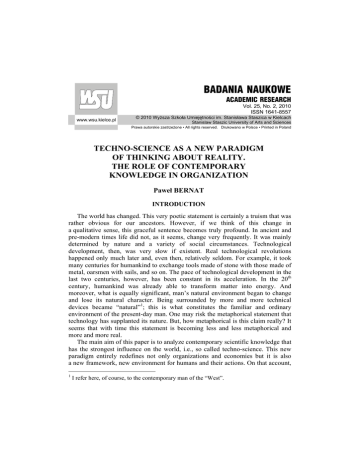 BADANIA NAUKOWE ACADEMIC RESEARCH Vol. 25, No. 2, 2010 ISSN 1641-8557 www.wsu.kielce.pl © 2010 Wyższa Szkoła Umiejętności im. Stanisława Staszica w Kielcach Stanislaw Staszic University of Arts and Sciences Prawa autorskie zastrzeżone • All rights reserved. Drukowano w Polsce • Printed in Poland TECHNO-SCIENCE AS A NEW PARADIGM OF THINKING ABOUT REALITY. THE ROLE OF CONTEMPORARY KNOWLEDGE IN ORGANIZATION Paweł BERNAT INTRODUCTION The world has changed. This very poetic statement is certainly a truism that was rather obvious for our ancestors. However, if we think of this change in a qualitative sense, this graceful sentence becomes truly profound. In ancient and pre-modern times life did not, as it seems, change very frequently. It was mainly determined by nature and a variety of social circumstances. Technological development, then, was very slow if existent. Real technological revolutions happened only much later and, even then, relatively seldom. For example, it took many centuries for humankind to exchange tools made of stone with those made of metal, oarsmen with sails, and so on. The pace of technological development in the last two centuries, however, has been constant in its acceleration. In the 20th century, humankind was already able to transform matter into energy. And moreover, what is equally significant, man’s natural environment began to change and lose its natural character. Being surrounded by more and more technical devices became “natural”1; this is what constitutes the familiar and ordinary environment of the present-day man. One may risk the metaphorical statement that technology has supplanted its nature. But, how metaphorical is this claim really? It seems that with time this statement is becoming less and less metaphorical and more and more real. The main aim of this paper is to analyze contemporary scientific knowledge that has the strongest influence on the world, i.e., so called techno-science. This new paradigm entirely redefines not only organizations and economies but it is also a new framework, new environment for humans and their actions. On that account, 1 I refer here, of course, to the contemporary man of the “West”. 20 Paweł Bernat there is a brief depiction of modern form of technology and its philosophy to be found in the first parts of the paper, which is followed by introduction of the techno-science phenomenon. The further elucidation of technology consists of the discussion regarding its neutrality and autonomy and proper examination of technology as superstructure, the various usages of the word, and new human environment that, as it shall be argued is nowadays more cultural (technology determined) than natural. The article is concluded with a section that in a direct way addresses how this new technology-based environment (techno-science) translates into new qualities for organization. Organization, in this paper, is being considered in its very general and abstractive sense following the definition proposed by Kotarbiński, namely, as such a cooperation of the parts that contributes to the success of the whole2. This broad definition covers both social and economic, less or more institutionalized assemblies, associations and structures. 1. TECHNOLOGY AND ITS PHILOSOPHY Technology reveals itself as a complex phenomenon. The definition, or rather the elucidation of this phenomenon should consist of three basic elements. Namely, (1) technology must have some concrete component, some material element, in order that it may be considered technology; (2) it must also contain some set of praxes – uses – the components of which humans can make of; and finally (3) there must exist a relation between the technologies and the humans who use, design, make or modify the technologies3. Let us consider how for example archery, which was independently developed at many points in history and in different parts of the globe, fulfills these three conditions. For, we have an artifact (1), i.e., a bow and arrows, which was used as a weapon (2), and was deeply culturally embedded (3) – the Anglo-Saxon bow differs in size and the way of shooting from the one used by certain tribes in jungle. The latter used a pinch technique to fire the arrow while the Anglo-Saxons longbow was fired by a four-finger bowstring pull. In other words, one can see the same technology differently embedded, but the praxes, which extended human capacities, are instantiated in each cultural variant4. It is also very important to understand the difference between technology and any calculative and rational technique, which may be (though not necessarily) improved by the application of a technology. My technique of swimming the dolphin style might get better when I see a recording of myself swimming and analyze it frame-by-frame. 2 See: T. Kotarbiński, Traktat o dobrej robocie, Wrocław – Warszawa 1958. D. Ihde, Philosophy of Technology. An Introduction, Paragon House, New York 1993, s. 47. 4 Ibidem, s. 50. 3 Techno-Science as a New Paradigm of Thinking About Reality 21 Philosophy of technology is one of the most recent of the sub-specializations in philosophy. In spite of the fact that the philosophy of technology as such appears in the works of Heidegger and Dewey at the beginning of 20th century, the 1970s and 1980s have seen a virtual explosion of philosophical works on technology, which have exclusively dealt with the nature of technology and its effects on human life and society5. However, as Peter Kroes writes, the philosophy of technology as a coherent field of research does not yet exist6. It is generally stated that the philosophy of technology deals with the nature of technology and its effects on human life and society: the subject [of philosophy of technology] covers studies from almost every branch of thinking in philosophy and deals with a great variety of topics because of a lack of consensus about the primary meaning of the term ‘technology’,