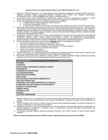 Zasady zwrotu towaru pełnowartościowego w sieci TESCO (Polska) Sp. z o.o. 1. 2. 3. 4. 5. 6. 7. 8. Klienci sieci TESCO (Polska) Sp. z o.o. mogą dokonać zwrotu wszystkich zakupionych w sklepach TESCO* towarów, z wyjątkiem produktów objętych gwarancją satysfakcji produktów marki TESCO oraz artykułów wykluczonych, wymienionych w pkt. 8, w terminie 30 dni od daty zakupu, z zastrzeżeniem pkt. 2. W przypadku zwrotu towarów żywnościowych dodatkowym kryterium jest termin przydatności do spożycia – zwrotu towaru żywnościowego można dokonać maksymalnie w ostatnim dniu jego terminu przydatności do spożycia. Zwrotu towaru pełnowartościowego na niniejszych zasadach można dokonać: a. w sklepie TESCO, w którym dany towar został zakupiony*; b. w dowolnym hipermarkecie TESCO; c. w supermarkecie TESCO, pod warunkiem, że zwracany towar znajduje się w ofercie handlowej danego sklepu. Klient może zwrócić towar pełnowartościowy w ciągu 30 dni od dnia zakupu bez podawania przyczyny – otrzymując zwrot ceny produktu. Klient otrzymuje zwrot należności zawsze w takiej samej wartości oraz formie płatności, jaka widnieje na paragonie fiskalnym lub fakturze VAT (zwrot gotówki, zwrot na kartę płatniczą/kredytową należącą do Klienta, którą była dokonana płatność). W przypadku zapłaty za towar przy użyciu bonów towarowych każdego emitenta, należność zostanie wypłacona na kartę podarunkową TESCO. W przypadku, kiedy Klient zwraca towar, za który uzyskał bony/kupony promocyjne podczas zakupu bądź, który objęty był dodatkowym rabatem, wartość zwrotu zostanie pomniejszona o wartość już zrealizowanych bonów/kuponów promocyjnych bądź kwotę rabatu. Powyższa zasada dotyczy również eKuponów, wykorzystywanych w serwisie Ezakupy. Powyższa zasada nie dotyczy bonów i kuponów CLUBCARD, realizowanych w sklepach stacjonarnych. Klient może dokonać zwrotu towaru pod warunkiem łącznego spełnienia następujących warunków: Klient posiada dowód zakupu (paragon fiskalny, faktura VAT); Towar jest w oryginalnym, niezniszczonym opakowaniu fabrycznym; Towar jest w komplecie (także z dodatkowym wyposażeniem, np. pilotem, kablami); Produkt żywnościowy w terminie przydatności do spożycia; Towar nie nosi śladów użytkowania; Karta gwarancyjna jest niepodstemplowana. TESCO (Polska) Sp. z o.o. zastrzega sobie prawo zweryfikowania spełnienia warunków zwrotu towarów, o których mowa powyżej przed podjęciem decyzji w przedmiocie zwrotu towaru pełnowartościowego. Klient może zwrócić każdy towar zakupiony w sklepie TESCO* z wyjątkiem produktów objętych gwarancją satysfakcji produktów marki TESCO oraz poniższych kategorii artykułów (artykuły wykluczone): LISTA WYKLUCZONYCH PRODUKTÓW ALKOHOL PAPIEROSY KWIATY CIĘTE, DONICZKOWE, DRZEWKA, KRZEWY GLUKOMETRY TERMOMETRY ELEKTRYCZNE GOLARKI/STRZYŻARKI SZCZOTECZKI DO ZĘBÓW DEPILATORY DOŁADOWANIA TELEFONÓW KOMÓRKOWYCH OKULARY KOREKCYJNE PROGRAMY I GRY KOMPUTEROWE/GRY NA KONSOLE KOMPUTERY/LAPTOPY/KONSOLE DO GIER/TABLETY APARATY FOTOGRAFICZNE KAMERY WIDEO NAWIGACJE GPS BATERIE TELEFONY KOMÓRKOWE Ponadto, zgodnie z pkt. 2 w przypadku zwrotu towaru żywnościowego dodatkowym kryterium jest termin przydatności do spożycia – zwrotu towaru żywnościowego można dokonać maksymalnie w ostatnim dniu jego terminu przydatności do spożycia. 9. TESCO zastrzega sobie prawo do odmowy przyjęcia zwrotu towaru pełnowartościowego na zasadach określonych w niniejszym regulaminie w uzasadnionych przypadkach. 10. Uprawnienie do zwrotu towaru pełnowartościowego nie narusza uprawnień konsumenckich Klientów w odniesieniu do towarów wadliwych, wynikających z przepisów ustawy o szczególnych warunkach sprzedaży konsumenckiej oraz przepisów Kodeksu Cywilnego. 11. W przypadku produktów objętych gwarancją satysfakcji produktów marki TESCO zasady ich zwrotu określa odrębny regulamin. * Oferta nie dotyczy sklepów partnerskich TESCO express, zlokalizowanych przy stacjach paliw ORLEN Klasyfikacja danych: PUBLICZNE