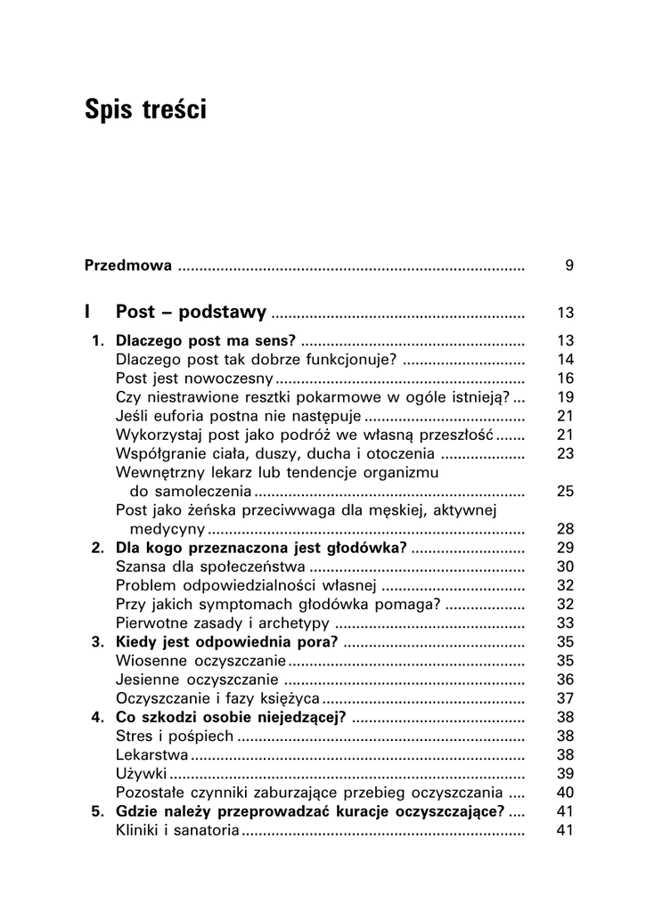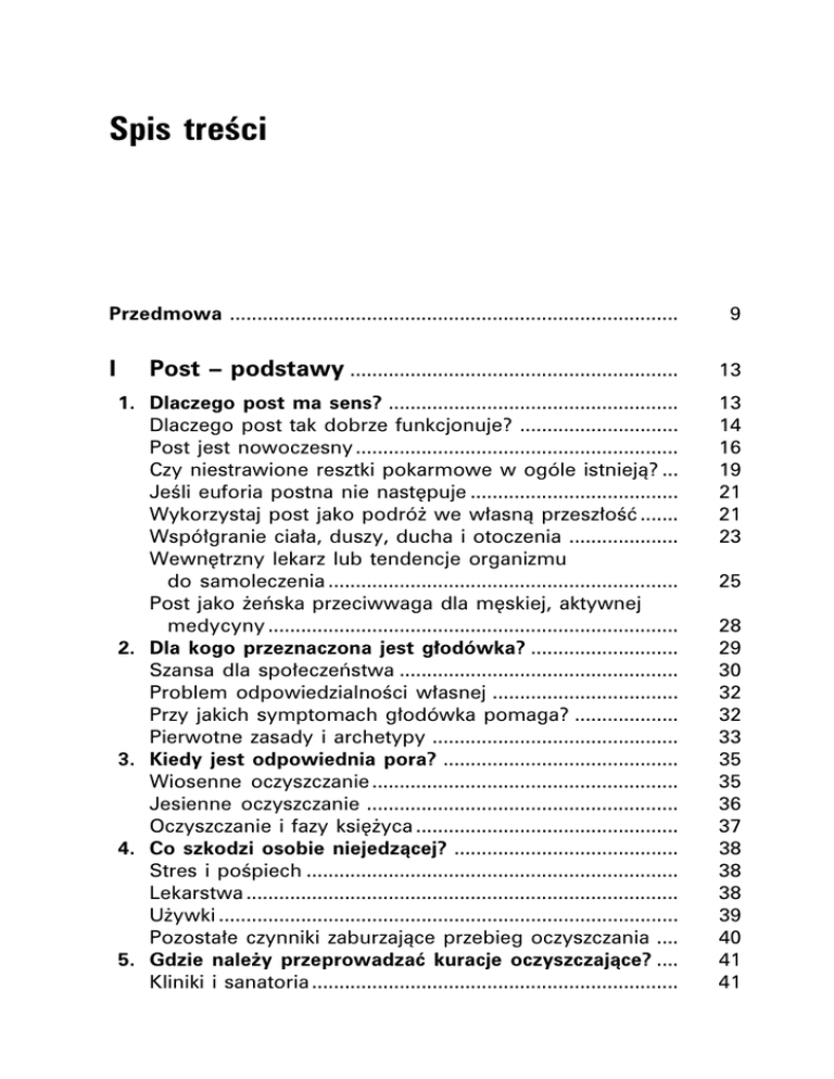 5 Spis treści Przedmowa .................................................................................. I 9 Post – podstawy ............................................................ 13 1. Dlaczego post ma sens? ..................................................... Dlaczego post tak dobrze funkcjonuje? ............................. Post jest nowoczesny ........................................................... Czy niestrawione resztki pokarmowe w ogóle istnieją? ... Jeśli euforia postna nie następuje ...................................... Wykorzystaj post jako podróż we własną przeszłość ....... Współgranie ciała, duszy, ducha i otoczenia .................... Wewnętrzny lekarz lub tendencje organizmu do samoleczenia ................................................................ Post jako żeńska przeciwwaga dla męskiej, aktywnej medycyny ........................................................................... 2. Dla kogo przeznaczona jest głodówka? ........................... Szansa dla społeczeństwa ................................................... Problem odpowiedzialności własnej .................................. Przy jakich symptomach głodówka pomaga? ................... Pierwotne zasady i archetypy ............................................. 3. Kiedy jest odpowiednia pora? ........................................... Wiosenne oczyszczanie ........................................................ Jesienne oczyszczanie ......................................................... Oczyszczanie i fazy księżyca ................................................ 4. Co szkodzi osobie niejedzącej? ......................................... Stres i pośpiech .................................................................... Lekarstwa ............................................................................... Używki .................................................................................... Pozostałe czynniki zaburzające przebieg oczyszczania .... 5. Gdzie należy przeprowadzać kuracje oczyszczające? .... Kliniki i sanatoria ................................................................... 13 14 16 19 21 21 23 25 28 29 30 32 32 33 35 35 36 37 38 38 38 39 40 41 41 6 Seminaria ............................................................................... Post w grupie ........................................................................ Podczas urlopu, w domu czy w czasie pracy? .................. 6. Jak często wolno lub można oczyszczać organizm? ..... Przybieranie na wadze w czasie niejedzenia ..................... 7. Jak długo powinno się lub należy nie jeść? .................... 8. Jakie problemy mogą wystąpić podczas niejedzenia? .. Wahania nastrojów ............................................................... Sen ......................................................................................... Oddziaływanie na miesiączkę .............................................. II 42 42 43 45 46 46 48 48 48 54 Szanse podczas oczyszczania organizmu ......... 57 9. Wewnętrzny spokój ............................................................. Zmienione postrzeganie świata .......................................... Relaks i medytacja ................................................................ Malowanie mandali w celu osiągnięcia skupienia ............ 10. Ruch ....................................................................................... Wellness i fitness .................................................................. Trening wytrzymałościowy .................................................. Rozciąganie się ..................................................................... Quigong i taiji, joga i metoda Feldenkraisa ....................... Żonglowanie i gry ruchowe ................................................ 11. Sposoby wspomagania procesu odtruwania .................. Tepidarium i sauna ............................................................... Przekwaszenie organizmu i głodówka ................................ Oddech łączony w celu pozbywania się złogów i jako psychoterapia .......................................................... Kąpiele ................................................................................... Kąpiele odkwaszające .......................................................... Trening wytrzymałościowy jako sposób na odkwaszenie ................................................................. 12. Odtruwanie, oczyszczanie, uwalnianie na wszystkich płaszczyznach ................................................................... 13. Opieka podczas oczyszczania ............................................ Zewnętrzny i wewnętrzny opiekun ..................................... Komunikacja w grupie osób o tych samych zapatrywaniach .................................................................. Samotna głodówka .............................................................. 14. Pokarm dla duszy w czasie głodówki ............................... 57 57 58 60 61 61 62 63 63 64 65 65 66 67 68 68 68 69 70 70 71 72 72 7 III Typowe objawy procesu oczyszczania .............. 77 15. Skóra i tkanki ....................................................................... Spadek ciśnienia i obwisła skóra ........................................ Post a procesy starzenia ...................................................... Post a przedłużenie życia ..................................................... 16. Symptomy fizyczne i psychiczne ....................................... Pogorszenie widzenia ........................................................... Problemy z żołądkiem .......................................................... Problemy z wagą .................................................................. Obawy .................................................................................... 77 77 78 78 81 81 81 82 84 IV 