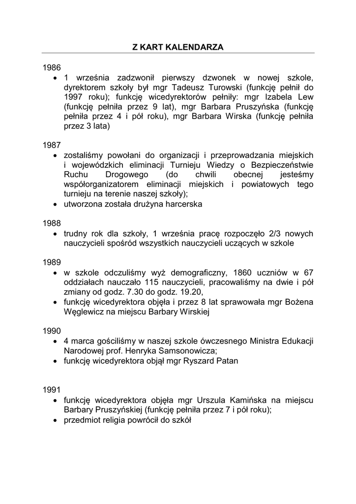 Z KART KALENDARZA 1986 1 września zadzwonił pierwszy dzwonek w nowej szkole, dyrektorem szkoły był mgr Tadeusz Turowski (funkcję pełnił do 1997 roku); funkcję wicedyrektorów pełniły: mgr Izabela Lew (funkcję pełniła przez 9 lat), mgr Barbara Pruszyńska (funkcję pełniła przez 4 i pół roku), mgr Barbara Wirska (funkcję pełniła przez 3 lata) 1987 zostaliśmy powołani do organizacji i przeprowadzania miejskich i wojewódzkich eliminacji Turnieju Wiedzy o Bezpieczeństwie Ruchu Drogowego (do chwili obecnej jesteśmy współorganizatorem eliminacji miejskich i powiatowych tego turnieju na terenie naszej szkoły); utworzona została drużyna harcerska 1988 trudny rok dla szkoły, 1 września pracę rozpoczęło 2/3 nowych nauczycieli spośród wszystkich nauczycieli uczących w szkole 1989 w szkole odczuliśmy wyż demograficzny, 1860 uczniów w 67 oddziałach nauczało 115 nauczycieli, pracowaliśmy na dwie i pół zmiany od godz. 7.30 do godz. 19.20, funkcję wicedyrektora objęła i przez 8 lat sprawowała mgr Bożena Węglewicz na miejscu Barbary Wirskiej 1990 4 marca gościliśmy w naszej szkole ówczesnego Ministra Edukacji Narodowej prof. Henryka Samsonowicza; funkcję wicedyrektora objął mgr Ryszard Patan 1991 funkcję wicedyrektora objęła mgr Urszula Kamińska na miejscu Barbary Pruszyńskiej (funkcję pełniła przez 7 i pół roku); przedmiot religia powrócił do szkół 1992 otwarta została jedna z pierwszych w Koszalinie szkolnych pracowni komputerowych; powołana została pierwsza Rada Szkoły 1993 został wprowadzony przedmiot informatyka; 1994 13 października nadano szkole imię Jana Matejki; przystąpiliśmy do Klubu Szkół Promujących Zdrowie zrzeszonym przy Pomorskim Konsorcjum Zdrowia; utworzony został Uczniowski Klub Sportowy „Osiemnastka”; zajęliśmy I miejsce w Koszalińskiej Olimpiadzie Młodzieży; po raz pierwszy uczniowie naszej szkoły przystąpili do Międzynarodowego Konkursu Matematycznego „Kangur” 1995 nauczyciele naszej innowacyjne szkoły opracowali pierwsze programy 1996 13 października obchodziliśmy jubileusz 10 - lecia szkoły 1997 w czerwcu przyznano po raz pierwszy statuetkę „Janek” najlepszemu absolwentowi szkoły; 1 września dyrektorem szkoły została mgr Bożena Węglewicz (funkcję pełniła do końca 2009 roku), funkcję wicedyrektora ponownie objęła mgr Barbara Wirska i pełniła ją przez 2 lata) 1998 w maju gościliśmy 22 dzieci z Białorusi; we wrześniu gościliśmy wiceministra Wojciecha Książka edukacji narodowej 1999 1 września wprowadzona została reforma systemu edukacji, powstały gimnazja, staliśmy się sześcioklasową szkołą podstawową, wicedyrektorowi Urszuli Kamińskiej powierzono funkcję dyrektora Gimnazjum nr 9, wicedyrektorem została mgr Jolanta Piątkowska (funkcję pełniła przez 7 lat) 2000 szkołę opuścili po raz ostatni ósmoklasiści; 2001 przystąpiliśmy do europejskiego programu „Socrates Comenius”, który realizowaliśmy w ciągu trzech następnych lat; tytuł projektu: „Europejskie migracje, kultury, tradycje”; naszymi partnerami były szkoły we Włoszech, Czechach i Holandii; nauczyciele rozpoczęli staże na kolejne stopnie awansu zawodowego zgodnie z nowym systemem 2002 w maju odbyła się pierwsza edycja Małych Olimpiad Przedmiotowych, których organizatorami były: Szkoła Podstawowa nr 17, 18 i Centrum Edukacji Nauczycieli w Koszalinie; pierwszy egzamin zewnętrzny - sprawdzian w klasach szóstych wicedyrektorem została mgr Maria Kotynia (funkcję pełni do chwili obecnej) 2003 1 września otrzymaliśmy certyfikat „Szkoła z klasą” I edycja konkursu; została utworzona strona internetowa naszej szkoły jako jedna z pierwszych spośród szkolnych witryn w naszym mieście, za którą otrzymaliśmy nagrodę Prezydenta Miasta 5000 zł z przeznaczeniem na zakup komputera przenośnego 2004 13 października świętowaliśmy osiemnaste urodziny naszej Osiemnastki; w ramach Europejskiego Funduszu Społecznego otrzymaliśmy nowoczesną dziesięciostanowiskową pracownię komputerową; nasza szkoła została Koszalińskim Liderem Edukacji 2004 2005 przystąpiliśmy do kolejnego projektu w ramach europejskiego programu „Socrates”; tytuł projektu: „Nasza Siostra Woda”; współpracowaliśmy ze szkołami z Włoch (2 szkoły, w tym jedna z Sycylii), Czech i Holandii; przystąpiliśmy również do programu „Nauczyciel z klasą”; w ramach Europejskiego Funduszu Społecznego otrzymaliśmy centrum multimedialne, cztery stanowiska komputerowe w czytelni szkolnej 2006 otrzymaliśmy tytuł „Zachodniopomorska Szkoła Jakości”; w czerwcu otrzymaliśmy tytuł „Super Szkoła”, w nagrodę otrzymaliśmy pracownię komputerową; 1 września powstał oddział przedszkolny prowadzony przez mgr Małgorzatę Szeligę; przystąpiliśmy do pierwszej edycji programu „Szkoła bez przemocy”; wicedyrektorem została mgr Karina Gajda na miejscu Jolanty Piątkowskiej 2007 ówczesny Minister Edukacji Narodowej wprowadził do szkół szkolne mundurki; w ramach Europejskiego Funduszu Społecznego otrzymaliśmy drugą nowoczesną dziesięciostanowiskową pracownię komputerową 2008 przystąpiliśmy do projektu „Optymistyczna Strefa Oświatowa” 2009 otrzymaliśmy tytuł „Szkoła promująca zdrowie”, otwarty został kompleks boisk sportowych „Orlik 2012” 2010 1 stycznia dyrektorem szkoły została mgr Karina Gajda (funkcję pełni do chwili obecnej); funkcja wicedyrektora została powierzona mgr Krystynie Andrzejewskiej – Gutfrańskiej (pełni ją do chwili obecnej); w ramach projektu Ministerstwa Edukacji Narodowej „Radosna Szkoła” świetlica otrzymała nowoczesne wyposażenie w pomoce do gier i zabaw 2011 w ramach projektu współfinansowanemu przez Unię Europejską „Przeciwdziałanie wykluczeniu cyfrowemu” utworzony został e-kiosk z trzema stanowiskami komputerowymi; szóstoklasiści uzyskali najwyższy wynik sprawdzianu w mie