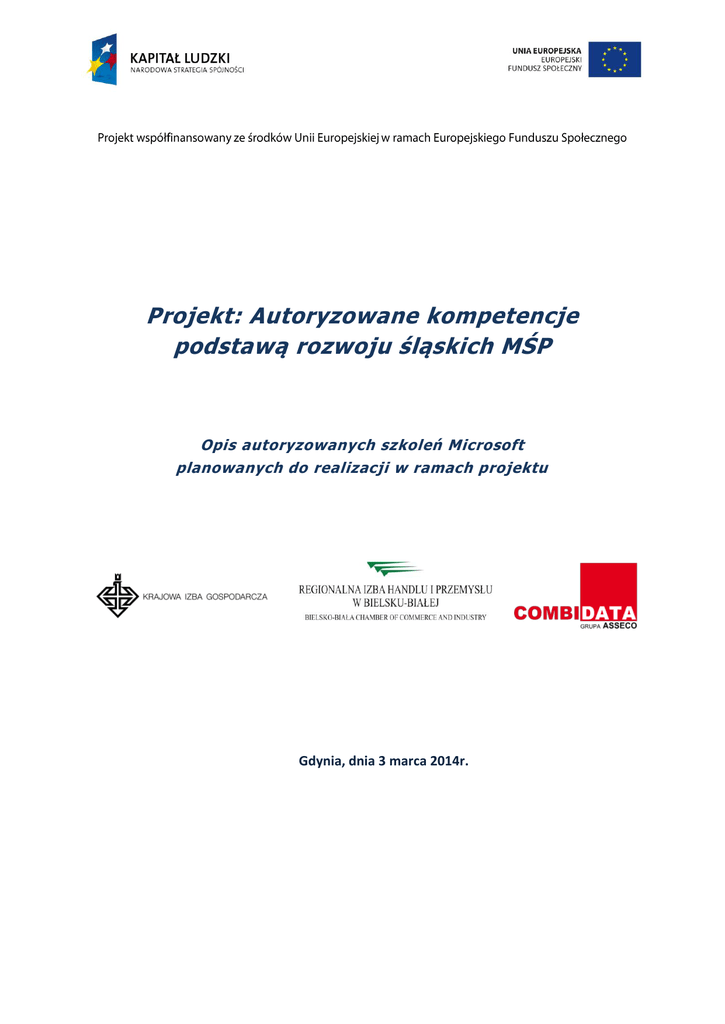 Projekt: Autoryzowane kompetencje podstawą rozwoju śląskich MŚP Opis autoryzowanych szkoleń Microsoft planowanych do realizacji w ramach projektu Gdynia, dnia 3 marca 2014r. Autoryzowane kompetencje podstawą rozwoju śląskich MŚP Spis Treści SZKOLENIE: MS 20411 - ADMINISTROWANIE WINDOWS SERVER 2012 ..................................................... 3 SZKOLENIE: MS 20412 - KONFIGUROWANIE ZAAWANSOWANYCH USŁUG WINDOWS SERVER 2012 ............... 4 SZKOLENIE: MS 20413 - PROJEKTOWANIE I WDRAŻANIE INFRASTRUKTURY SERWEROWEJ.............................. 5 SZKOLENIE: MS 10775 - ADMINISTRACJA BAZAMI DANYCH MICROSOFT SQL SERVER 2012 .......................... 6 SZKOLENIE: MS 10777 - WDRAŻANIE BAZ DANYCH MICROSOFT SQL SERVER 2012 .................................... 8 SZKOLENIE: MS 20687 - KONFIGUROWANIE WINDOWS 8 ....................................................................... 9 SZKOLENIE: MS 10267 - WPROWADZENIE DO PROGRAMOWANIA WEB Z MICROSOFT VISUAL STUDIO 2010. 10 SZKOLENIE: MS 10262 - PROGRAMOWANIE APLIKACJI WINDOWS Z MICROSOFT VISUAL STUDIO 2010 ........ 12 SZKOLENIE: MS 10953 – PROGRAMOWANIE HTML5 ........................................................................... 13 SZKOLENIE: MS 10264 - PROGRAMOWANIE APLIKACJI WEB Z MICROSOFT VISUAL STUDIO 2010 ................ 14 Wysoką jakość szkoleń gwarantuje: Autoryzowane kompetencje podstawą rozwoju śląskich MŚP Szkolenie: MS 20411 - Administrowanie Windows Server 2012 Szkolenie MS 20411- Administrowanie Windows Server 2012 Czas trwania 5 dni Cel kursu: Celem tego szkolenia jest zapoznanie uczestników z zagadnieniami administracji Windows Server 2012, uzyskanie umiejętności pozwalających na implementację i wykorzystanie zasad grupowych w utrzymaniu środowiska stacji roboczych oraz użytkowników infrastruktury scentralizowanej Active Directory. Podczas szkolenia uczestnicy uzyskają również umiejętności z zakresu obsługi usług serwera DNS, serwera NAP, serwera NPS, funkcji FSRM w zarządzaniu plikami, serwera WDS oraz monitorowania Windows Server 2012. Oczekiwane umiejętności słuchaczy: Uczestnicy szkolenia powinni posiadać wiedzę z zakresu instalowania i konfigurowania Windows Server 2008. Uczestnicy szkolenia powinni posiadać umiejętność korzystania z anglojęzycznych materiałów. Lista omawianych tematów: Implementacja infrastruktury zasad grupowych Zarządzanie środowiskiem użytkowników za pomocą zasad grupowych Zarządzanie kontami użytkowników i usług Obsługa i utrzymywanie Active Directory Domain Services (AD DS) Konfiguracja i rozwiązywanie problemów z Domain Name System (DNS) Konfiguracja i rozwiązywanie problemów z dostępem zdalnym Instalacja, konfiguracja i rozwiązywanie problemów z rolą serwera Network Policy Server (NPS) Implementacja Network Access Protection (NAP) Optymalizacja usług serwera plików Konfiguracja szyfrowania i zaawansowanych polityk kontroli Monitorowanie Windows Server 2012 Wdrażanie i utrzymanie obrazów serwera Implementacja zarządzania aktualizacjami Monitorowanie serwera Windows Server 2012 Szkolenia powiązane: Szkolenie poprzedzające MS 20410 - Instalowanie i konfigurowanie Windows Server 2012 Szkolenie następujące MS 20412 - Konfigurowanie zaawansowanych usług Windows Server 2012 Autoryzowane kompetencje podstawą rozwoju śląskich MŚP Szkolenie: MS 20412 - Konfigurowanie zaawansowanych usług Windows Server 2012 Szkolenie MS 20412 - Konfigurowanie zaawansowanych usług Windows Server 2012 Czas trwania 5 dni Cel kursu: Celem szkolenia jest przekazanie uczestnikom wiedzy i umiejętności niezbędnych do wdrażania fundamentalnej infrastruktury Windows Server 2012 w istniejącym środowisku przedsiębiorstwa. Szkolenie koncentruje się na zaawansowanych czynnościach konfiguracyjnych związanych z wdrożeniem, zarządzaniem i utrzymaniem infrastruktury Windows Server 2012. Podczas szkolenia uczestnicy nabywają wiadomości i umiejętności związane z identity management, network load balancing, business continuity, disaster recovery, fault tolerance i rights management. Oczekiwane umiejętności słuchaczy: Uczestnicy szkolenia powinni posiadać wiedzę z zakresu instalowania i konfigurowania Windows Server 2008. Uczestnicy szkolenia powinni posiadać wiedzę z zakresu podstaw administrowania Windows Server 2012. Uczestnicy szkolenia powinni posiadać umiejętność korzystania z anglojęzycznych materiałów. Lista omawianych tematów: Implementacja infrastruktury zasad grupowych Zarządzanie środowiskiem użytkowników za pomocą zasad grupowych Zarządzanie kontami użytkowników i usług Obsługa i utrzymywanie Active Directory Domain Services (AD DS) Konfiguracja i rozwiązywanie problemów z Domain Name System (DNS) Konfiguracja i rozwiązywanie problemów z dostępem zdalnym Instalacja, konfiguracja i rozwiązywanie problemów z rolą serwera Network Policy Server (NPS) Implementacja Network Access Protection (NAP) Optymalizacja usług serwera plików Konfiguracja szyfrowania i zaawansowanych polityk kontroli Monitorowanie Windows Server 2012 Wdrażanie i utrzymanie obrazów serwera Implementacja zarządzania aktualizacjami Monitorowanie serwera Windows Server 2012 Szkolenia powiązane: Szkolenia poprzedzające MS 20410 - Instalowanie i konfigurowanie Windows Server 2012 MS 20411 - Administrowanie Windows Server 2012 Autoryzowane kompetencje podstawą rozwoju śląskich MŚP Szkolenie: MS 20413 - Projektowanie i wdrażanie infrastruktury serwerowej Szkolenie MS 20413 - Projektowanie i wdrażanie infrastruktury serwerowej Czas trwania 5 dni Cel kursu: Ten 5-dniowy kurs prowadzony przez instruktora zapewnia wiedzę i umiejętności potrzebne do planowania, projektowania i wdrażania fizycznego i logicznego infrastruktury Active Directory Domain Services (AD DS) przy pomocy systemu Windows Server 2012. Kurs pomaga zdobyć umiejętności potrzebne przy zarządzaniu rozpoznawaniem nazw, integracją aplikacji, optymalizacj