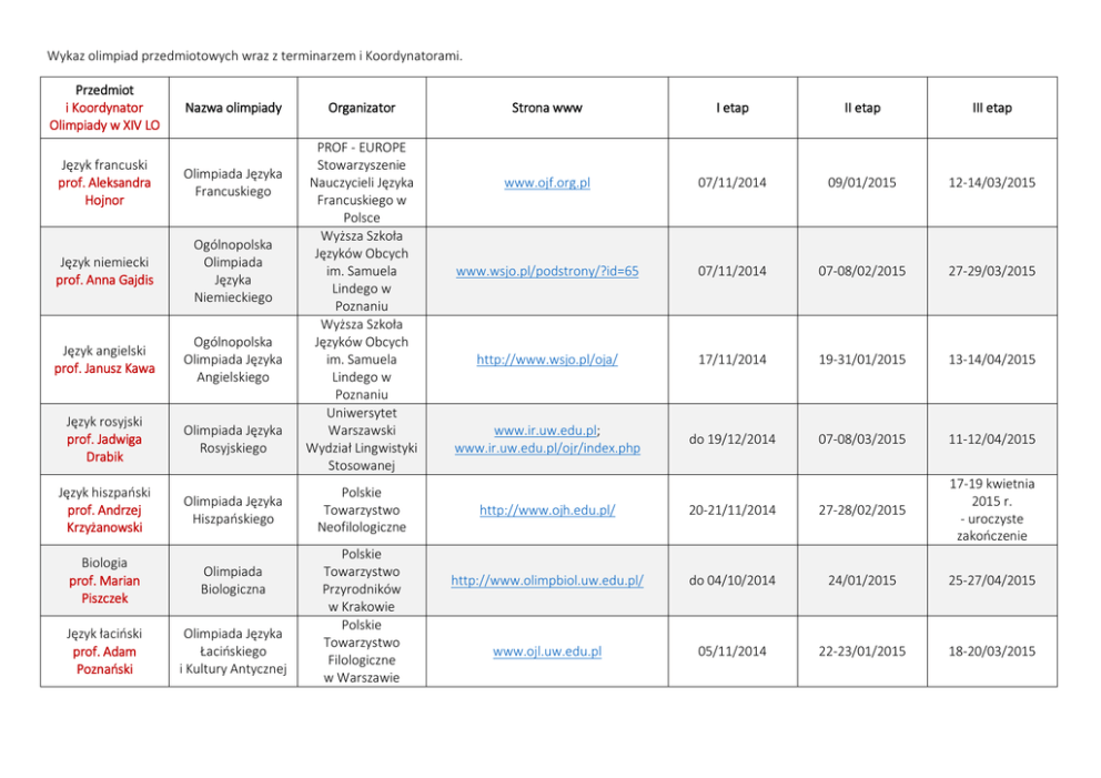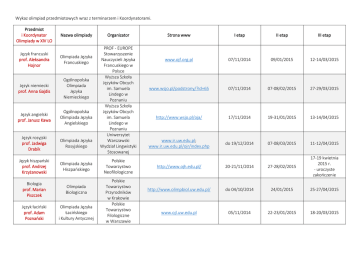 Wykaz olimpiad przedmiotowych wraz z terminarzem i Koordynatorami. Przedmiot i Koordynator Olimpiady w XIV LO Nazwa olimpiady Język francuski prof. Aleksandra Hojnor Olimpiada Języka Francuskiego Język niemiecki prof. Anna Gajdis Ogólnopolska Olimpiada Języka Niemieckiego Język angielski prof. Janusz Kawa Ogólnopolska Olimpiada Języka Angielskiego Język rosyjski prof. Jadwiga Drabik Olimpiada Języka Rosyjskiego Język hiszpański prof. Andrzej Krzyżanowski Olimpiada Języka Hiszpańskiego Biologia prof. Marian Piszczek Olimpiada Biologiczna Język łaciński prof. Adam Poznański Olimpiada Języka Łacińskiego i Kultury Antycznej Organizator PROF - EUROPE Stowarzyszenie Nauczycieli Języka Francuskiego w Polsce Wyższa Szkoła Języków Obcych im. Samuela Lindego w Poznaniu Wyższa Szkoła Języków Obcych im. Samuela Lindego w Poznaniu Uniwersytet Warszawski Wydział Lingwistyki Stosowanej Polskie Towarzystwo Neofilologiczne Polskie Towarzystwo Przyrodników w Krakowie Polskie Towarzystwo Filologiczne w Warszawie Strona www I etap II etap III etap www.ojf.org.pl 07/11/2014 09/01/2015 12-14/03/2015 www.wsjo.pl/podstrony/?id=65 07/11/2014 07-08/02/2015 27-29/03/2015 http://www.wsjo.pl/oja/ 17/11/2014 19-31/01/2015 13-14/04/2015 www.ir.uw.edu.pl; www.ir.uw.edu.pl/ojr/index.php do 19/12/2014 07-08/03/2015 11-12/04/2015 http://www.ojh.edu.pl/ 20-21/11/2014 27-28/02/2015 17-19 kwietnia 2015 r. - uroczyste zakończenie http://www.olimpbiol.uw.edu.pl/ do 04/10/2014 24/01/2015 25-27/04/2015 www.ojl.uw.edu.pl 05/11/2014 22-23/01/2015 18-20/03/2015 Chemia prof. Ludmiła Szteremberg Olimpiada Chemiczna Filozofia prof. Anna Frąszczak Olimpiada Filozoficzna Geografia prof. Andrzej Gościej Olimpiada Geograficzna Fizyka prof. Marian Bąk Olimpiada Fizyczna Historia sztuki lub historia muzyki prof. Magdalena Wacowska Olimpiada Artystyczna Historia prof. Robert Kiniorski Ogólnopolska Olimpiada Historyczna Wiedza o społeczeństwie prof. Anna Rabiega Wiedza o Polsce i Świecie Współczesnym Polskie Towarzystwo Chemiczne w Warszawie Polskie Towarzystwo Filozoficzne w Warszawie Polskie Towarzystwo Geograficzne w Warszawie Polskie Towarzystwo Fizyczne w Warszawie Stowarzyszenie Przyjaciół Olimpiady Artystycznej w Warszawie Polskie Towarzystwo Historyczne w Warszawie Uniwersytet Warszawski www.olchem.edu.pl 29/11/2014 30-31/01/2015 10-11/04/2015 www.ptfilozofia.pl; www.olimpiada.ptfilozofia.pl/index.ht ml 09/2014 30/11/2014 14/02/2015 25/04/2015 http://www.olimpiadageograficzna.ed u.pl/ 05/06-15/11/2014 07-08/02/2015 23-26/04/2015 www.kgof.edu.pl 10/10/2014 – termin wysyłania części I, 14/11/2014 – termin wysyłania części II, 15/12/2014 – ogłoszenie listy zakwalifikowanych do etapu II 11/01/2015 – część teoretyczna, 25/01/2015 – ogłoszenie listy zakwalifikowanych do części doświadczalnej, 15/02/2015 – część doświadczalna, 15/03/2015 – ogłoszenie listy zakwalifikowanych do etapu III 11/04/2015 – część doświadczalna, 12/04/2015 – część teoretyczna, 14/04/2015– ogłoszenie wyników i zakończenie olimpiady Lipiec 2015 olimpiada międzynarodowa www.wilanow-palac.pl 09/12/2014 09-10/02/2015 13-15/04/2015 www.olimpiadahistoryczna.pl 15/09-05/11/2014 10 oraz 1516/01/2015 10-13/04/2015 www.owpsw.edu.pl 28/11/2014 24/01/2015 14-15/03/2015 Język polski prof. Jerzy Biniewicz Olimpiada Literatury i Języka Polskiego Matematyka prof. Daniel Cichoń Olimpiada Matematyczna Informatyka prof. Dawid Matla Olimpiada Informatyczna Instytut Badań Literackich PAN Stowarzyszenie na Rzecz Edukacji Matematycznej w Warszawie Fundacja Rozwoju Informatyki w Warszawie www.olijp.pl 18/12/2014 14/02 i 07/03/2015 15-18/04/2015 www.om.edu.pl 01/09/2014 04/12/2014 21-22/02/2015 14-18/04/2015 www.oi.edu.pl/php/show.php październik/listopa d 2014 02/2015 04/2015 Więcej informacji u Szkolnego Koordynatora Konkursów i Olimpiad (SKKO)