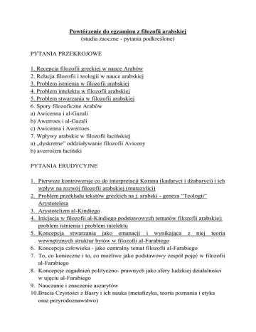 Powtórzenie do egzaminu z filozofii arabskiej (studia zaoczne - pytania podkreślone) PYTANIA PRZEKROJOWE 1. Recepcja filozofii greckiej w nauce Arabów 2. Relacja filozofii i teologii w nauce arabskiej 3. Problem istnienia w filozofii arabskiej 4. Problem intelektu w filozofii arabskiej 5. Problem stwarzania w filozofii arabskiej 6. Spory filozoficzne Arabów a) Awicenna i al-Gazali b) Awerroes i al-Gazali c) Awicenna i Awerroes 7. Wpływy arabskie w filozofii łacińskiej a) „dyskretne” oddziaływanie filozofii Aviceny b) averroizm łaciński PYTANIA ERUDYCYJNE 1. Pierwsze kontrowersje co do interpretacji Koranu (kadaryci i dżabaryci) i ich wpływ na rozwój filozofii arabskiej (mutazylici) 2. Problem przekładu tekstów greckich na j. arabski - geneza “Teologii” Arystotelesa 3. Arystotelizm al-Kindiego 4. Inicjacja w filozofii al-Kindiego podstawowych tematów filozofii arabskiej: problem istnienia i problem intelektu 5. Koncepcja stwarzania jako emanacji i wynikająca z niej teoria wewnętrznych struktur bytów w filozofii al-Farabiego 6. Koncepcja człowieka - jako centralny temat filozofii al-Farabiego 7. To, co konieczne i to, co możliwe jako podstawowy zespół pojęć w filozofii al-Farabiego 8. Koncepcje zagadnień polityczno- prawnych jako sfery ludzkiej działalności w ujęciu al-Farabiego 9. Nauczanie i znaczenie aszarytów 10.Bracia Czystości z Basry i ich nauka (metafizyka, teoria poznania i etyka oraz przyrodoznawstwo) 11.Arystotelizm Awicenny 12.Problem stwarzania w filozofii Awicenny 13.Bóg w filozofii Awicenny 14.Kosmologia Awicenny 15.Fizyka Awicenny 16.Poznanie intelektualne w filozofii Awicenny 17.Logika Awicenny 18.Problematyka istnienia w metafizyce Awicenny 19.Rola filozofii w kulturze w ujęciu al-Gazalego 20.Problem wieczności świata w ujęciu al-Gazalego 21.Problem Boga w ujęciu al-Gazalego (problem poznania Boga - mistyka) 22.Problem wolności człowieka w ujęciu al-Gazalego 23.“Szkoła tłumaczy” w Toledo - jej geneza i znaczenie 24.Awempace`go interpretacja filozofii Awicenny 25.Arystotelizm Awerroesa 26.Krytyka al-Gazalego w tekstach Awerroesa 27.Problem relacji wiary i wiedzy w ujęciu Awerroesa 28.Krytyka Awicenny w tekstach Awerroesa 29.Intelekt w filozofii Awerroesa 30.Filozofia historii u Ibn Halduna 31. Filozofia Sigera z Brabancji i jego szkoły 32. Averroizm Boecjusza z Dacji 33. Dyskusje Tomasza z Akwinu z averroizmem łacińskim 34. Potępienia arystotelizmu w II połowie XIII wieku 35. Oddziaływanie al-Gazalego na filozofię europejską