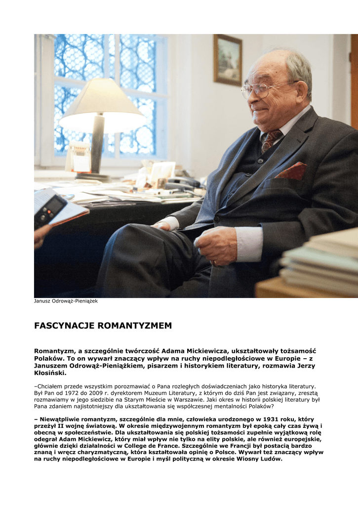 Janusz Odrowąż-Pieniążek FASCYNACJE ROMANTYZMEM Romantyzm, a szczególnie twórczość Adama Mickiewicza, ukształtowały tożsamość Polaków. To on wywarł znaczący wpływ na ruchy niepodległościowe w Europie – z Januszem Odrowąż-Pieniążkiem, pisarzem i historykiem literatury, rozmawia Jerzy Kłosiński. –Chciałem przede wszystkim porozmawiać o Pana rozległych doświadczeniach jako historyka literatury. Był Pan od 1972 do 2009 r. dyrektorem Muzeum Literatury, z którym do dziś Pan jest związany, zresztą rozmawiamy w jego siedzibie na Starym Mieście w Warszawie. Jaki okres w historii polskiej literatury był Pana zdaniem najistotniejszy dla ukształtowania się współczesnej mentalności Polaków? – Niewątpliwie romantyzm, szczególnie dla mnie, człowieka urodzonego w 1931 roku, który przeżył II wojnę światową. W okresie międzywojennym romantyzm był epoką cały czas żywą i obecną w społeczeństwie. Dla ukształtowania się polskiej tożsamości zupełnie wyjątkową rolę odegrał Adam Mickiewicz, który miał wpływ nie tylko na elity polskie, ale również europejskie, głównie dzięki działalności w College de France. Szczególnie we Francji był postacią bardzo znaną i wręcz charyzmatyczną, która kształtowała opinię o Polsce. Wywarł też znaczący wpływ na ruchy niepodległościowe w Europie i myśl polityczną w okresie Wiosny Ludów. –Jeśli romantyzm to dlaczego nie mamy muzeum romantyzmu polskiego? Czy wiedza o polskich romantykach nie została zepchnięta dziś na margines, bo interesują się nią raczej specjaliści. Program szkolny nie wystarczy, aby ich twórczość żyła w szerszym obiegu. – Działa wprawdzie muzeum romantyzmu w Opinogórze, taka jest jego oficjalna nazwa, choć jak wiadomo, to jest muzeum Zygmunta Krasińskiego. W okresie PRL, w tej dawnej rodowej siedzibie Krasińskich ze względów ideologicznych nie można było powołać muzeum jego imienia, stąd ta myląca nazwa. Zgadzam się, że powinno być odrębne muzeum romantyzmu polskiego, choć w sytuacji gdy istnieje Muzeum Literatury zorganizowanie takiej placówki nie byłoby proste. Tym bardziej że mamy już około 100 muzeów poszczególnych pisarzy. Ale rzeczywiście zgromadzenie w jednym miejscu ważnych skarbów polskiej kultury okresu romantyzmu i wyeksponowanie dorobku Mickiewicza, Krasińskiego, Słowackiego Norwida, Chopina i wielu innych już dziś mniej znanych twórców tamtego okresu, dałoby naszemu krajowi możliwość głębszego spojrzenia na własną tradycję. –Na czym polega działalność Muzeum Literatury? – Tak jak w przypadku każdego muzeum nasza działalność polega na zbieraniu dokumentów, opracowaniu i ich eksponowaniu. Jest tu duża, stała wystawa poświęcona Mickiewiczowi, zresztą istnieją szerokie plany modernizacyjne muzeum, ale z uwagi na brak funduszy nie wiem czy wejdą one w życie. – Muzeum nie ma jednej siedziby, jest rozrzucone na kilka budynków, a sale ekspozycyjne są niewielkie, czy to się zmieni? – Będąc jeszcze dyrektorem walczyłem o Pałac Rzeczpospolitej na placu Krasińskich, z którego miał się przenieść dział rękopisów Biblioteki Narodowej po wybudowaniu nowej siedziby, ale tak się nie stało. – Pan sam poświęcił wiele czasu w swoich badaniach właśnie Mickiewiczowi, dlaczego tak ważne jest zebranie wszystkich dokumentów i pamiątek po Mickiewiczu? – Bo jak już podkreśliłem, Mickiewicz był postacią najistotniejszą zarówno dla literatury, ale też kształtowania się narodu i wreszcie odzyskania niepodległości w 1918 roku. Zresztą duże znaczenie miało też podtrzymywanie pamięci o Mickiewiczu w XIX i na początku XX wieku. W tym dziele ma swój wybitny wkład najstarszy syn Adama – Władysław, będący we Francji orędownikiem sprawy polskiej. Zresztą w tym roku w Polsce wyszły tłumaczone jego wspomnienia z tamtego okresu, rzecz bezcenna dla kultury polskiej. – Muzeum Mickiewicza w Paryżu zawiera najwięcej artefaktów z jego życia, nota bene nie ma to muzeum prawie żadnego wsparcia od polskich władz. Jak cenne są tam zbiory? – Tam są najcenniejsze zbiory dotyczące Wielkiej Emigracji. Zrobiliśmy w kraju 2004r wystawę „Skarby kultury polskiej”, na której eksponowaliśmy tamtejsze zbiory, w tym wyjątkowy dokument, akt detronizacji cara z 1831 r. W Paryżu eksponowane są archiwa Adama Czartoryskiego i wydzielone są sale poświęcone Mickiewiczowi. Biblioteka Polska, w nim się mieści to muzeum, to miejsce wyjątkowe, pełniło rolę ośrodka politycznego też w XX wieku, tam przychodzili Władysław Sikorski, Maria Skłodowska-Curie i wielu innych. – Prowadził pan wielokrotnie poszukiwania i badania w Europie, przybliżając nam osiągnięcia polskich pisarzy na emigracji, od Mickiewicza po Gombrowicza. Jakie spotkania i poszukiwania były najbardziej fascynujące dla Pana? – Gdy chodzi o Mickiewicza udało mi się ściągnąć archiwa po Mickiewiczu od jego prawnuka Jerzy Goreckiego, nawet sprowadziliśmy meble z ostatniego mieszkania Mickiewicza w Arsenale, archiwa najmłodszego syna poety – Józefa, zupełnie nieznane. Najcenniejsze rękopisy Mickiewicza są rozproszone po kilku placówkach. Brudnopis „Pana Tadeusza” znajduje się w muzeum w Paryżu, a czystopis w Ossolineum, „Dziadów” w Kórniku, a w naszym muzeum „Grażyny”. Z ważniejszych spotkań wymieniłbym kontakt w 1964 roku z Witoldem Gombrowiczem, pojechałem do niego do Royaumont. Opowiadano o tym, jak jest nieprzystępny, ale jak się okazało była to jedna z moich najmilszych rozmów przeprowadzonych z pisarzami. Cenię sobie spotkania z Miłoszem, zresztą zrobiłem mu wystawę zaraz jak dostał Nobla, na której się sam też pojawił. Również spotkania ze Stanisławem Balińskim w Londynie, jeszcze za jego życia ściągnąłem jego archiwum do Polski. Bardzo cenne materiały zawiera archiwum poety Allana Kosko z Paryża, w tym lis