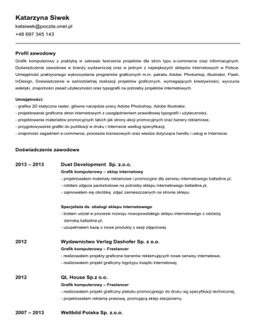 Katarzyna Siwek [email protected] +48 697 345 143 Profil zawodowy Grafik komputerowy z praktyką w zakresie tworzenia projektów dla stron typu e-commerce oraz informacyjnych. Doświadczenie zawodowe w branży wydawniczej oraz w jednym z największych sklepów internetowych w Polsce. Umiejętność praktycznego wykorzystania programów graficznych m.in. pakietu Adobe: Photoshop, Illustrator, Flash, InDesign. Doświadczenie w samodzielnej realizacji projektów graficznych, wymagających kreatywności, wyczucia estetyki, znajomości zasad użyteczności oraz typografii na potrzeby projektów internetowych. Umiejętności: - grafika 2D statyczna raster, główne narzędzie pracy Adobe Photoshop, Adobe Illustrator, - projektowanie graficzne stron internetowych z uwzględnieniem prawidłowej typografii i użyteczności, - projektowanie materiałów promocyjnych takich jak strony akcji promocyjnych oraz banery reklamowe, - przygotowywanie grafiki do publikacji w druku i Internecie według specyfikacji, - znajomość zagadnień e-commerce, procesów biznesowych oraz wiedza dotycząca handlu i usług w Internecie. Doświadczenie zawodowe 2013 – 2013 Duet Development Sp. z.o.o. Grafik komputerowy – sklep internetowy - projektowałam materiały reklamowe i promocyjne dla serwisu internetowego balladine.pl, - robiłam zdjęcia packshotowe na potrzeby sklepu internetowego balladine.pl, - zajmowałam się obróbką zdjęć zamieszczanych na stronie sklepu. Specjalista ds. obsługi sklepu internetowego - brałam udział w procesie rozwoju nowopowstałego sklepu internetowego z odzieżą damską balladine.pl, - uzupełniałam bazę o nowe produkty z sesji zdjęciowej. 2012 Wydawnictwo Verlag Dashofer Sp. z o.o. Grafik komputerowy – Freelancer - realizowałam projekty graficzne banerów reklamujących nowe serwisy internetowe, - realizowałam projekt graficzny logotypu książki internetowej. 2012 QL House Sp.z o.o. Grafik komputerowy – Freelancer - realizowałam projekt graficzny plakatu promocyjnego do druku wg specyfikacji technicznej, - projektowałam reklamę prasową, promującą sklep stacjonarny. 2007 – 2013 Weltbild Polska Sp. z.o.o. 2011-2013 Grafik komputerowy – Sklep internetowy - projektowałam materiały reklamowe i promocyjne dla serwisu internetowego, - przygotowywałam akcje marketingowe, banery wewnętrzne i zewnętrzne dla serwisów weltbild.pl oraz swiatksiazki.pl, - tworzyłam grafikę do publikacji wg specyfikacji technicznej. 2011 - 2013 Specjalista ds. sprzedaży w Internecie - zajmowałam się prezentacją produktów na stronach z akcesoriami do domu i ogrodu, - tworzyłam i opiekowałam się ofertą na stronie internetowej, - przygotowywałam promocje oraz akcje sprzedażowe. 2007-2011 Pracownik bazy produktów - uzupełniałam bazę produktów sklepu internetowego, - wprowadzałam nowości wydawnicze do oferty sklepu. Edukacja 2011-2013 Policealne Studium Plastyczne "Collage" II lata nauki na kierunku grafika komputerowa, zakończone państwowym dyplomem plastyka ze specjalizacją grafika komputerowa 2005-2008 Wyższa Warszawska Szkoła Humanistyczna III lata studiów zaocznych na kierunku kulturoznawstwo (zakończone absolutorium) Dodatkowe umiejętności - dobra znajomość pakietu MS Office, - zdolności manualne (rysunek, malarstwo), - znajomość programów pakietu Adobe (Photoshop, Illustrator, InDesigne, Flash), - dobra znajomość środowiska SAP, - samodzielność, dobra organizacja czasu pracy, systematyczność, kreatywność, umiejętność pracy w zespole, - znajomość środowiska Microsoft Windows i Mac OS, - podstawowa znajomość HTML. Zainteresowania - w wolnych chwilach zajmuję się grafiką, malarstwem oraz śpiewem, - bardzo lubię literaturę grozy oraz książki fantasy i thriller, - interesuję się kinem współczesnym oraz sztuką. Wyrażam zgodę na przetwarzanie moich danych osobowych zawartych w przesłanym CV dla potrzeb niezbędnych w procesie rekrutacji, zgodnie z ustawą z dnia 29.08.1997 roku o Ochronie danych Osobowych (Dz. U. Nr 133 poz. 883)