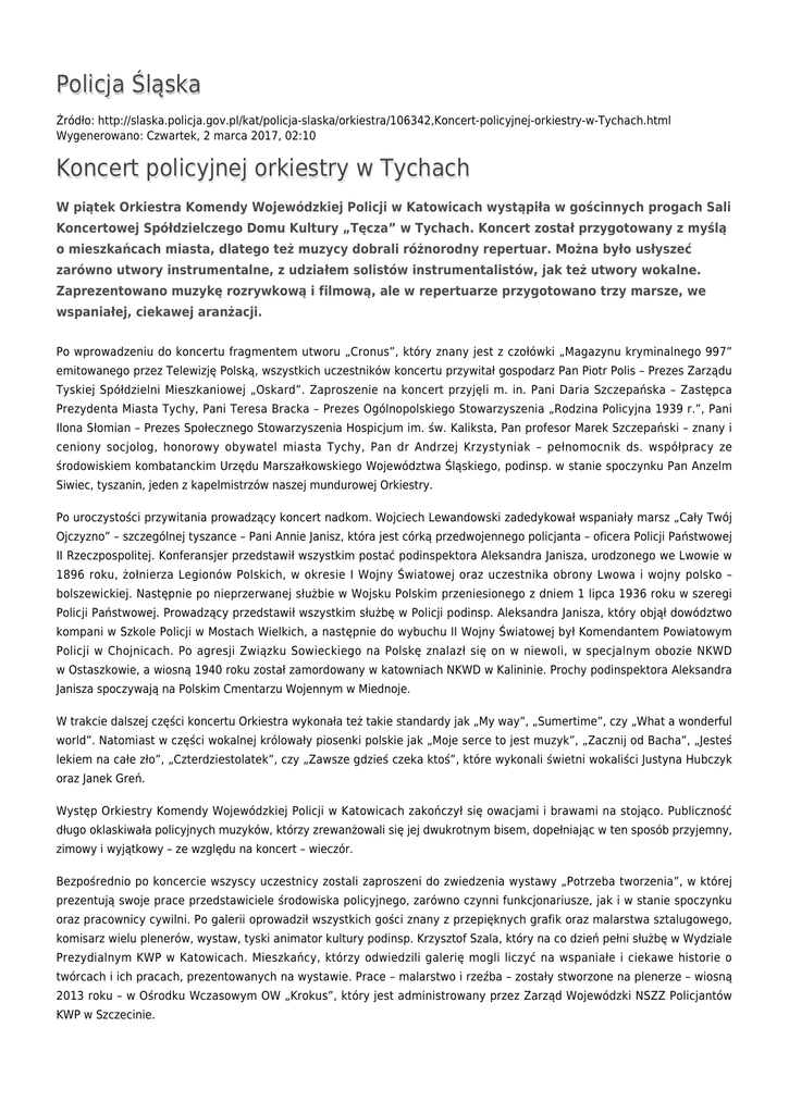 Policja Śląska Źródło: http://slaska.policja.gov.pl/kat/policja-slaska/orkiestra/106342,Koncert-policyjnej-orkiestry-w-Tychach.html Wygenerowano: Czwartek, 2 marca 2017, 02:10 Koncert policyjnej orkiestry w Tychach W piątek Orkiestra Komendy Wojewódzkiej Policji w Katowicach wystąpiła w gościnnych progach Sali Koncertowej Spółdzielczego Domu Kultury „Tęcza” w Tychach. Koncert został przygotowany z myślą o mieszkańcach miasta, dlatego też muzycy dobrali różnorodny repertuar. Można było usłyszeć zarówno utwory instrumentalne, z udziałem solistów instrumentalistów, jak też utwory wokalne. Zaprezentowano muzykę rozrywkową i filmową, ale w repertuarze przygotowano trzy marsze, we wspaniałej, ciekawej aranżacji. Po wprowadzeniu do koncertu fragmentem utworu „Cronus”, który znany jest z czołówki „Magazynu kryminalnego 997” emitowanego przez Telewizję Polską, wszystkich uczestników koncertu przywitał gospodarz Pan Piotr Polis – Prezes Zarządu Tyskiej Spółdzielni Mieszkaniowej „Oskard”. Zaproszenie na koncert przyjęli m. in. Pani Daria Szczepańska – Zastępca Prezydenta Miasta Tychy, Pani Teresa Bracka – Prezes Ogólnopolskiego Stowarzyszenia „Rodzina Policyjna 1939 r.”, Pani Ilona Słomian – Prezes Społecznego Stowarzyszenia Hospicjum im. św. Kaliksta, Pan profesor Marek Szczepański – znany i ceniony socjolog, honorowy obywatel miasta Tychy, Pan dr Andrzej Krzystyniak – pełnomocnik ds. współpracy ze środowiskiem kombatanckim Urzędu Marszałkowskiego Województwa Śląskiego, podinsp. w stanie spoczynku Pan Anzelm Siwiec, tyszanin, jeden z kapelmistrzów naszej mundurowej Orkiestry. Po uroczystości przywitania prowadzący koncert nadkom. Wojciech Lewandowski zadedykował wspaniały marsz „Cały Twój Ojczyzno” – szczególnej tyszance – Pani Annie Janisz, która jest córką przedwojennego policjanta – oficera Policji Państwowej II Rzeczpospolitej. Konferansjer przedstawił wszystkim postać podinspektora Aleksandra Janisza, urodzonego we Lwowie w 1896 roku, żołnierza Legionów Polskich, w okresie I Wojny Światowej oraz uczestnika obrony Lwowa i wojny polsko – bolszewickiej. Następnie po nieprzerwanej służbie w Wojsku Polskim przeniesionego z dniem 1 lipca 1936 roku w szeregi Policji Państwowej. Prowadzący przedstawił wszystkim służbę w Policji podinsp. Aleksandra Janisza, który objął dowództwo kompani w Szkole Policji w Mostach Wielkich, a następnie do wybuchu II Wojny Światowej był Komendantem Powiatowym Policji w Chojnicach. Po agresji Związku Sowieckiego na Polskę znalazł się on w niewoli, w specjalnym obozie NKWD w Ostaszkowie, a wiosną 1940 roku został zamordowany w katowniach NKWD w Kalininie. Prochy podinspektora Aleksandra Janisza spoczywają na Polskim Cmentarzu Wojennym w Miednoje. W trakcie dalszej części koncertu Orkiestra wykonała też takie standardy jak „My way”, „Sumertime”, czy „What a wonderful world”. Natomiast w części wokalnej królowały piosenki polskie jak „Moje serce to jest muzyk”, „Zacznij od Bacha”, „Jesteś lekiem na całe zło”, „Czterdziestolatek”, czy „Zawsze gdzieś czeka ktoś”, które wykonali świetni wokaliści Justyna Hubczyk oraz Janek Greń. Występ Orkiestry Komendy Wojewódzkiej Policji w Katowicach zakończył się owacjami i brawami na stojąco. Publiczność długo oklaskiwała policyjnych muzyków, którzy zrewanżowali się jej dwukrotnym bisem, dopełniając w ten sposób przyjemny, zimowy i wyjątkowy – ze względu na koncert – wieczór. Bezpośrednio po koncercie wszyscy uczestnicy zostali zaproszeni do zwiedzenia wystawy „Potrzeba tworzenia”, w której prezentują swoje prace przedstawiciele środowiska policyjnego, zarówno czynni funkcjonariusze, jak i w stanie spoczynku oraz pracownicy cywilni. Po galerii oprowadził wszystkich gości znany z przepięknych grafik oraz malarstwa sztalugowego, komisarz wielu plenerów, wystaw, tyski animator kultury podinsp. Krzysztof Szala, który na co dzień pełni służbę w Wydziale Prezydialnym KWP w Katowicach. Mieszkańcy, którzy odwiedzili galerię mogli liczyć na wspaniałe i ciekawe historie o twórcach i ich pracach, prezentowanych na wystawie. Prace – malarstwo i rzeźba – zostały stworzone na plenerze – wiosną 2013 roku – w Ośrodku Wczasowym OW „Krokus”, który jest administrowany przez Zarząd Wojewódzki NSZZ Policjantów KWP w Szczecinie. Należy dodać, że obydwie imprezy - zarówno koncert policyjnej Orkiestry, jak i wystawa „Potrzeba tworzenia” - mogły odbyć się w Spółdzielczym Domu Kultury „Tęcza” dzięki osobistym staraniom i zaproszeniu wystosowanym przez Panią Barbarę Konieczną Kierownik Działu Społeczno – Kulturalnego TSM „Oskard”. Dlatego też prowadzący w trakcie koncertu zadedykował Pani Barbarze melodię z utworu „What a wonderful world”, który był wykonywany przez Louisa Armstronga, a opiewa piękno codziennego życia. Ocena: 5/5 (1) Tweetnij