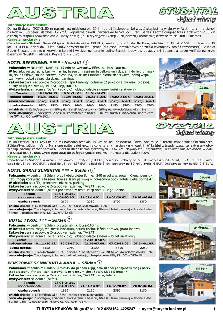 Informacje narciarskie: Dolina Stubaital (937-3150 m n.p.m) jest oddalona ok. 30 km od od Insbrucka. Jej wizytówką jest największy w Austrii teren narciarski na lodowcu Stubaier-Gletcher (12 km²). Popularne ośrodki narciarskie to Schlick, Elfer i Serles. Łączna długość tras zjazdowych -138 km o różnym stopniu zaawansowania. Trasy obsługuje 20 wyciągów i kolejek. Najbardziej znane miejscowości to Neustift i Fulpmes. Karnety narciarskie: Cena karnetu Stubaier Super-Skipass: 6 dni dorośli – 228 EUR, seniorzy od 65 lat–194 Euro, młodzież do 18 lat -160Euro, dzieci do 15 lat – 114 EUR, dzieci do 10 lat i osoby powyżej 80 lat – gratis (dla osób uprawnionych do zniżki wymagany dowód tożsamości). Stubaier Super-Skipass obejmuje wszystkie kolejki i wyciągi na terenie doliny Stubai, lodowiec, dojazdy ski busami, a także wejście na kryte baseny w Neustift i Fulmpes. Key-card – 2 Euro. HOTEL BERGJUWEL **** - Neustift 1 Położenie: w Neustift - Dorf, ok. 15 min od wyciągów Elfer, ski bus- 300 m. W hotelu: restauracja, bar, winiarnia, basen z masażem bąbelkowym i dyszami do hydromasażu, sauna fińska, sauna parowa, biosauna, solarium i masaże płatne dodatkowo, pokój wypoczynkowy, pokój zabaw dla dzieci, parking. Zakwaterowanie: pokoje 2-osobowe i apartamenty rodzinne (2 pokojowe dla max. 6 osób). Każdy pokój z łazienką, TV-SAT, sejf, balkon. Wyżywienie: śniadania (bufet, kącik bio) i obiadokolacje (menu+ bufet sałatkowy) Termin sobota-sobota zakwaterowanie 18.10-20.12. 03.01-10.01. 10.01-31.01. 11.04-10.05. 31.01-14.03. 28.03-11.04. 14.02-21.02. 14.03-28.03. pokój pokój pokój pokój pokój apart apart apart apart 1 basen apart osoba dorosła 2450 2850 2200 2600 2600 2990 3150 3500 2300 2700 zniżki: dz. 4-12 lat/dostawka - 45%; dz. 12-15 lat/dostawka - 25%; os. dorosła/dostawka - 8%. cena obejmuje: 7 noclegów, 2 posiłki, korzystanie z basenu, sauny, taksa klimatyczna, ubezpieczenie NW, KL, OC WARTA SKI. 1 Informacje narciarskie: Dolina Oetztal (800-3250 m n.p.m) położona jest ok. 70 km na od Innsbrucka. Ötztal obejmuje 3 tereny narciarskie: Ötz/Hochötz, Sölden/Hochsölden i Vent. Mają one najbardziej urozmaicone tereny narciarskie w Austrii. W każdej z trzech części tej ski-areny obowiązuje osobny karnet narciarski. Łączna długość tras zjazdowych - 147 km. Największą i najbardziej „ruchliwą” miejscowością w dolinie Otztal jest Solden. Życie tętni tutaj do późnych godzin nocnych. Polecana dla osób młodych. Karnety narciarskie: Cena karnetu Solden Ski Area: 6 dni dorośli – 228/253,50 EUR, seniorzy (kobiety od 60 lat; mężczyźni od 65 lat) – 215,50 EUR, młodzież do 18 lat –190 EUR, dzieci do 15 lat –127 EUR, dzieci do 3 lat i seniorzy po 80 roku życia -6 EUR. Depozyt za key-cards: 2,5 EUR. HOTEL GARNI SUNSHINE *** – Sölden 1 Położenie: w centrum Sölden, przy hotelu Liebe Sonne, 200 m od wyciągów. Klienci pensjonatu mogą korzystać z basenu, fitness, łaźni parowej w położonym obok hotelu Liebe Sonne 4*. W obiekcie: sala TV, przechowalnia nart, parking. Zakwaterowanie: pokoje 2-osobowe, łazienka, TV-SAT, radio. Wyżywienie: śniadania (bufet) podawane w restauracji hotelu Liege Sonne. Termin sobota-sobota 03.01-24.01. 06.04-03.05. 24.01-14.02. 14.02-28.02. basen 28.02-06.04. osoba dorosła 2190 2350 2790 2350 zniżki: dziecko 4-12 lat/dostawka -55%; os. dorosła/dostawka -10% cena obejmuje: 7 noclegów, śniadania, korzystanie z basenu, fitness i łaźni parowej w hotelu Liebe Sonne, ubezpieczenie NW, KL, OC WARTA Ski. basen 2 HOTEL TYROL *** – Sölden Położenie: w centrum Sölden, przystanek ski busa-100 m. W hotelu: restauracja, wellness: biosauna, sauna fińska, łaźnia parowa, grota lodowa Zakwaterowanie: pokoje 2-osobowe, łazienka, TV-SAT. Wyżywienie: śniadania (bufet, kącik bio) i obiadokolacje (menu + bufet sałatkowy) wellness Termin sobota-sobota 01.11-20.12. 10.01-17.01. 17.01-07.02. 21.03-07.04. 07.02-21.03. 07.04-01.05. osoba dorosła 2150 2950 3100 3300 2250 zniżki: dziecko 2-7 lat/dostawka -45%; dziecko 7-12 lat/dostawka -20%; os. dorosła/dostawka -8%. cena obejmuje: 7 noclegów, śniadania i obiadokolacje, ubezpieczenie NW, KL, OC WARTA Ski. PENSJONAT SONNENVILA ANNA – Sölden 3 Położenie: w centrum Sölden. 3 minuty do gondoli Giggijoch. Klienci pensjonatu mogą korzystać z basenu, fitness, łaźni parowej w położonym obok hotelu Liebe Sonne 4*. Zakwaterowanie: pokoje 2-osobowe, łazienka, TV-SAT, radio, telefon. Wyżywienie: śniadania (bufet). Termin sobota-sobota 03.01-24.01. 06.04-03.05. 24.01-14.02. 14.02-28.02. 28.02-06.04. osoba dorosła 1990 2150 2590 2150 basen zniżki: dziecko 4-12 lat/dostawka -55%; osoba dorosła/dostawka -10% cena obejmuje: 7 noclegów, śniadania, korzystanie z basenu, fitness i łaźni parowej w hotelu Liebe Sonne, parking, ubezpieczenie NW, KL, OC WARTA Ski. TURYSTA KRAKÓW Długa 47 tel. 012 4228164, 4225247 [email protected] 1