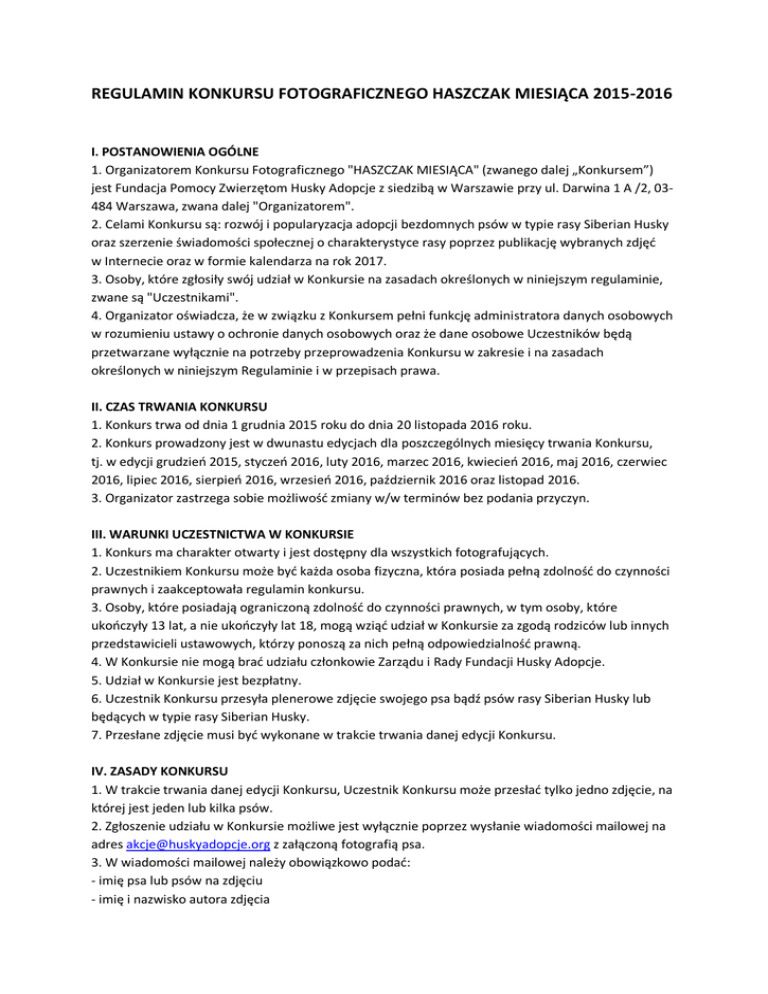 REGULAMIN KONKURSU FOTOGRAFICZNEGO HASZCZAK MIESIĄCA 2015-2016 I. POSTANOWIENIA OGÓLNE 1. Organizatorem Konkursu Fotograficznego "HASZCZAK MIESIĄCA" (zwanego dalej „Konkursem”) jest Fundacja Pomocy Zwierzętom Husky Adopcje z siedzibą w Warszawie przy ul. Darwina 1 A /2, 03484 Warszawa, zwana dalej "Organizatorem". 2. Celami Konkursu są: rozwój i popularyzacja adopcji bezdomnych psów w typie rasy Siberian Husky oraz szerzenie świadomości społecznej o charakterystyce rasy poprzez publikację wybranych zdjęd w Internecie oraz w formie kalendarza na rok 2017. 3. Osoby, które zgłosiły swój udział w Konkursie na zasadach określonych w niniejszym regulaminie, zwane są "Uczestnikami". 4. Organizator oświadcza, że w związku z Konkursem pełni funkcję administratora danych osobowych w rozumieniu ustawy o ochronie danych osobowych oraz że dane osobowe Uczestników będą przetwarzane wyłącznie na potrzeby przeprowadzenia Konkursu w zakresie i na zasadach określonych w niniejszym Regulaminie i w przepisach prawa. II. CZAS TRWANIA KONKURSU 1. Konkurs trwa od dnia 1 grudnia 2015 roku do dnia 20 listopada 2016 roku. 2. Konkurs prowadzony jest w dwunastu edycjach dla poszczególnych miesięcy trwania Konkursu, tj. w edycji grudzieo 2015, styczeo 2016, luty 2016, marzec 2016, kwiecieo 2016, maj 2016, czerwiec 2016, lipiec 2016, sierpieo 2016, wrzesieo 2016, październik 2016 oraz listopad 2016. 3. Organizator zastrzega sobie możliwośd zmiany w/w terminów bez podania przyczyn. III. WARUNKI UCZESTNICTWA W KONKURSIE 1. Konkurs ma charakter otwarty i jest dostępny dla wszystkich fotografujących. 2. Uczestnikiem Konkursu może byd każda osoba fizyczna, która posiada pełną zdolnośd do czynności prawnych i zaakceptowała regulamin konkursu. 3. Osoby, które posiadają ograniczoną zdolnośd do czynności prawnych, w tym osoby, które ukooczyły 13 lat, a nie ukooczyły lat 18, mogą wziąd udział w Konkursie za zgodą rodziców lub innych przedstawicieli ustawowych, którzy ponoszą za nich pełną odpowiedzialnośd prawną. 4. W Konkursie nie mogą brad udziału członkowie Zarządu i Rady Fundacji Husky Adopcje. 5. Udział w Konkursie jest bezpłatny. 6. Uczestnik Konkursu przesyła plenerowe zdjęcie swojego psa bądź psów rasy Siberian Husky lub będących w typie rasy Siberian Husky. 7. Przesłane zdjęcie musi byd wykonane w trakcie trwania danej edycji Konkursu. IV. ZASADY KONKURSU 1. W trakcie trwania danej edycji Konkursu, Uczestnik Konkursu może przesład tylko jedno zdjęcie, na której jest jeden lub kilka psów. 2. Zgłoszenie udziału w Konkursie możliwe jest wyłącznie poprzez wysłanie wiadomości mailowej na adres [email protected] z załączoną fotografią psa. 3. W wiadomości mailowej należy obowiązkowo podad: - imię psa lub psów na zdjęciu - imię i nazwisko autora zdjęcia - oświadczenie o pełnoletniości lub zgoda opiekuna - potwierdzenie akceptacji regulaminu Konkursu 4. Przesyłane zdjęcia mogą zostad wykadrowane ale muszą byd ostre, estetyczne, wysokiej jakości, nieporuszone, poprawnie naświetlone i dodatkowo: - rozmiar pliku minimum około 2MB - dłuższy bok zdjęcia minimum około 2000px - brak nadruków, znaków wodnych, dat, itp. - format pliku JPG bez kompresji, TIF lub RAW - bez widocznego zastosowania filtrów, montażu itp. - bez efektów kolorystycznych/artystycznych 5. Organizator zastrzega sobie prawo odrzucenia nadesłanych fotografii na etapie kwalifikacji na podstawie niezgodności z warunkami Konkursu lub złej jakości technicznej. 6. Nie można zgłaszad do Konkursu zdjęd zgłoszonych do którejkolwiek z wcześniejszych edycji Konkursu. 7. Uczestnik Konkursu, którego zdjęcie zajęło I miejsce w którejkolwiek edycji Konkursu nie może brad udziału w kolejnych edycjach przez najbliższe cztery miesiące. 8. Do Konkursu nie mogą byd zgłaszane zdjęcia z psem, który otrzymał już tytuł HASZCZAKA MIESIĄCA w którejkolwiek z wcześniejszych edycji Konkursu. Nie ma jednak znaczenia otrzymanie tytułu w podobnych konkursach organizowanych w poprzednich latach. 9. Zgłaszanie zdjęd do poszczególnych edycji trwa do 20 dnia każdego miesiąca (z wyjątkiem edycji listopad 2016). V. ROZSTRZYGNIĘCIE POSZCZEGÓLNYCH EDYCJI KONKURSU 1. Spośród wszystkich zgłoszonych w danej edycji zdjęd, Organizator wybierze maksymalnie 10 fotografii, które poddane zostaną głosowaniu Internautów. 2. Do głosowania uprawnieni są zarejestrowani i zalogowani użytkownicy portalu http://forum.huskyadopcje.org. Każdy użytkownik może posiadad tylko jedno konto. Każdy użytkownik może głosowad tylko jeden raz na dane zdjęcie. 3. Głosowanie Internautów trwa maksymalnie 5 dni od chwili opublikowania przez Organizatora wybranych zdjęd. 4. Każdą edycję Konkursu wygrywa fotografia, która otrzyma największą liczbę głosów Internautów. VI. OGŁOSZENIE WYNIKÓW I NAGRODY 1. Wyniki konkursu wraz ze zdjęciami, które zajęły I, II i III miejsce zostaną opublikowane na stronie internetowej Fundacji http://huskyadopcje.org, na forum Fundacji http://forum.huskyadopcje.org i na profilu FB Fundacji. 2. Zwycięskie zdjęcie zostanie opublikowane w kalendarzu na rok 2017, w miesiącu, w którym odniosło sukces. W miarę możliwości, zwycięskie zdjęcie będzie pełnid rolę przewodniego w miesiącu, w których odniosło sukces. Dodatkowo, autor zwycięskiego zdjęcia otrzyma drobne upominki od Organizatora. 3. Organizator zastrzega sobie prawo do własnego wyboru spośród pozostałych zdjęd biorących udział w głosowaniu tych, które zostaną opublikowane w kalendarzu na rok 2017. 4. Zwycięzca Konkursu zostanie poinformowany o wygranej drogą elektroniczną z użyciem adresu email, z którego przysłane zostało zdjęcie do Konkursu. VII. POSTANOWIENIA KOOCOWE 1. Regulamin niniejszego Konkursu dostępny jest na stronie internetowej Organizatora http://huskyadopcje.org i na forum Organizatora http://forum.husky