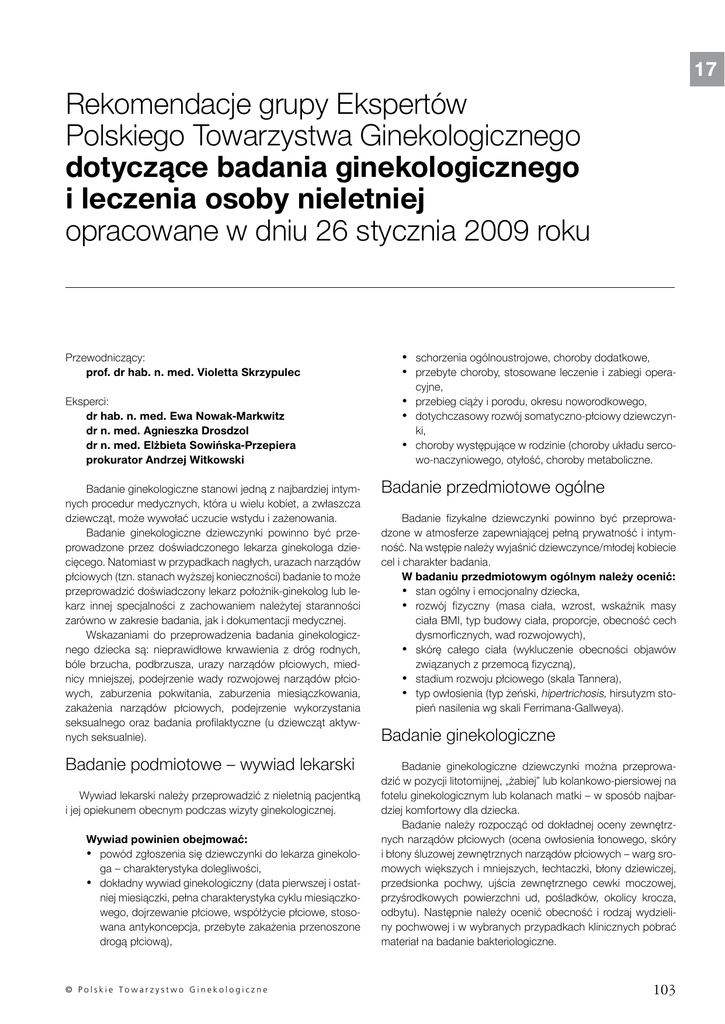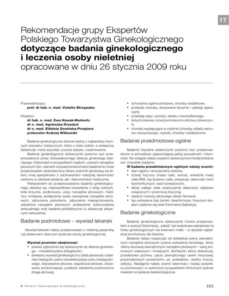 17 Rekomendacje grupy Ekspertów Polskiego Towarzystwa Ginekologicznego dotyczące badania ginekologicznego i leczenia osoby nieletniej opracowane w dniu 26 stycznia 2009 roku Przewodniczący: prof. dr hab. n. med. Violetta Skrzypulec • schorzenia ogólnoustrojowe, choroby dodatkowe, • przebyte choroby, stosowane leczenie i zabiegi opera Eksperci: dr hab. n. med. Ewa Nowak-Markwitz dr n. med. Agnieszka Drosdzol dr n. med. Elżbieta Sowińska-Przepiera prokurator Andrzej Witkowski • przebieg ciąży i porodu, okresu noworodkowego, • dotychczasowy rozwój somatyczno-płciowy dziewczyn cyjne, Badanie ginekologiczne stanowi jedną z najbardziej intym nych procedur medycznych, która u wielu kobiet, a zwłaszcza dziewcząt, może wywołać uczucie wstydu i zażenowania. Badanie ginekologiczne dziewczynki powinno być prze prowadzone przez doświadczonego lekarza ginekologa dzie cięcego. Natomiast w przypadkach nagłych, urazach narządów płciowych (tzn. stanach wyższej konieczności) badanie to może przeprowadzić doświadczony lekarz położnik-ginekolog lub le karz innej specjalności z zachowaniem należytej staranności zarówno w zakresie badania, jak i dokumentacji medycznej. Wskazaniami do przeprowadzenia badania ginekologicz nego dziecka są: nieprawidłowe krwawienia z dróg rodnych, bóle brzucha, podbrzusza, urazy narządów płciowych, mied nicy mniejszej, podejrzenie wady rozwojowej narządów płcio wych, zaburzenia pokwitania, zaburzenia miesiączkowania, zakażenia narządów płciowych, podejrzenie wykorzystania seksualnego oraz badania profilaktyczne (u dziewcząt aktyw nych seksualnie). Badanie podmiotowe – wywiad lekarski Wywiad lekarski należy przeprowadzić z nieletnią pacjentką i jej opiekunem obecnym podczas wizyty ginekologicznej. Wywiad powinien obejmować: • powód zgłoszenia się dziewczynki do lekarza ginekolo ga – charakterystyka dolegliwości, • dokładny wywiad ginekologiczny (data pierwszej i ostat niej miesiączki, pełna charakterystyka cyklu miesiączko wego, dojrzewanie płciowe, współżycie płciowe, stoso wana antykoncepcja, przebyte zakażenia przenoszone drogą płciową), © Polskie Towarzystwo Ginekologiczne ki, • choroby występujące w rodzinie (choroby układu serco wo-naczyniowego, otyłość, choroby metaboliczne. Badanie przedmiotowe ogólne Badanie fizykalne dziewczynki powinno być przeprowa dzone w atmosferze zapewniającej pełną prywatność i intym ność. Na wstępie należy wyjaśnić dziewczynce/młodej kobiecie cel i charakter badania. W badaniu przedmiotowym ogólnym należy ocenić: • stan ogólny i emocjonalny dziecka, • rozwój fizyczny (masa ciała, wzrost, wskaźnik masy ciała BMI, typ budowy ciała, proporcje, obecność cech dysmorficznych, wad rozwojowych), • skórę całego ciała (wykluczenie obecności objawów związanych z przemocą fizyczną), • stadium rozwoju płciowego (skala Tannera), • typ owłosienia (typ żeński, hipertrichosis, hirsutyzm sto pień nasilenia wg skali Ferrimana-Gallweya). Badanie ginekologiczne Badanie ginekologiczne dziewczynki można przeprowa dzić w pozycji litotomijnej, „żabiej” lub kolankowo-piersiowej na fotelu ginekologicznym lub kolanach matki – w sposób najbar dziej komfortowy dla dziecka. Badanie należy rozpocząć od dokładnej oceny zewnętrz nych narządów płciowych (ocena owłosienia łonowego, skóry i błony śluzowej zewnętrznych narządów płciowych – warg sro mowych większych i mniejszych, łechtaczki, błony dziewiczej, przedsionka pochwy, ujścia zewnętrznego cewki moczowej, przyśrodkowych powierzchni ud, pośladków, okolicy krocza, odbytu). Następnie należy ocenić obecność i rodzaj wydzieli ny pochwowej i w wybranych przypadkach klinicznych pobrać materiał na badanie bakteriologiczne. 103 Rekomendacje PTG dotyczące badania ginekologicznego i leczenia osoby nieletniej. 17 U małych dzieci i dziewcząt nieaktywnych seksualnie na leży wykonać badanie dwuręczne zestawione przezodbytnicze w celu oceny narządu rodnego, a w niektórych przypadkach klinicznych (np. krwawienie z dróg rodnych, obecność ciała ob cego w pochwie, podejrzenie wad rozwojowych) można wyko rzystać wzierniki dziecięce (ogrzane, zwilżane 0,9% roztworem NaCl) lub waginoskop. U dziewcząt aktywnych seksualnie na leży przeprowadzić badanie ginekologiczne poprzez wzierniko wanie pochwy (odpowiednio dobrany wziernik pochwowy) oraz badanie dwuręczne zestawione. Zaleca się również w tej grupie pacjentek pobranie rozmazu cytologicznego, najpóźniej do 3 lat po inicjacji seksualnej. W przypadku wyjątkowych wskazań klinicznych (badanie w trybie pilnym, uraz narządów płciowych lub miednicy mniej szej, podejrzenie obecności ciała obcego w pochwie) należy przeprowadzić badanie ginekologiczne po podaniu środków uspokajających lub w znieczuleniu ogólnym. Ostatnią częścią badania ginekologicznego jest badanie ultrasonograficzne narządów miednicy mniejszej pozwalające na ocenę: stopnia rozwoju i prawidłowości narządów płcio wych, grubości endometrium, liczby i wielkości pęcherzyków jajnikowych oraz wykrycie obecności torbieli i guzów jajnika. Badanie ultrasonograficzne można wykonać głowicą prze zbrzuszną przy wypełnionym pęcherzu moczowym lub rektalną (małe dzieci i dziewczęta nieaktywne seksualnie) oraz głowicą dopochwową (dziewczęta aktywne seksualnie). W celu dokładnej diagnostyki ginekologicznej w wybra nych sytuacjach klinicznych można zalecić również dodatkowe badania laboratoryjne (np. hormonalne, markery nowotworo we) lub badania obrazowe (tomografia komputerowa, rezonans magnetyczny). Informacja medyczna Po badaniu ginekologicznym należy poinformować dziew czynkę o wyniku badania i prawidłowości budowy jej narządów płciowych w sposób jak najbardziej dla niej zrozumiały. Mat kę/opiekuna dziecka należy dokładnie poinformować o stanie zdrowia, planowanych procedurach di