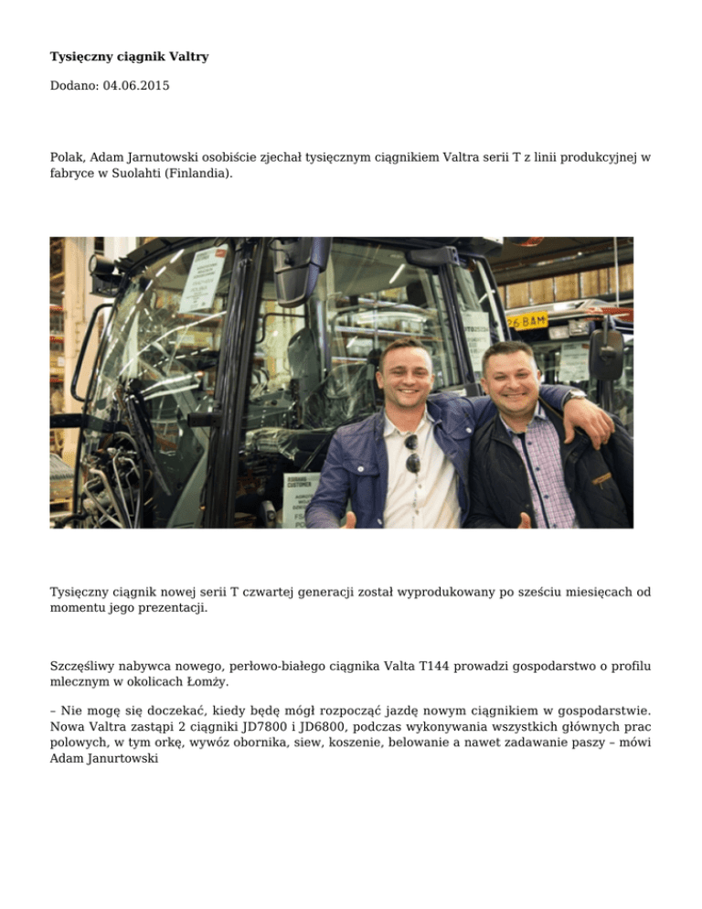 Tysięczny ciągnik Valtry Dodano: 04.06.2015 Polak, Adam Jarnutowski osobiście zjechał tysięcznym ciągnikiem Valtra serii T z linii produkcyjnej w fabryce w Suolahti (Finlandia). Tysięczny ciągnik nowej serii T czwartej generacji został wyprodukowany po sześciu miesięcach od momentu jego prezentacji. Szczęśliwy nabywca nowego, perłowo-białego ciągnika Valta T144 prowadzi gospodarstwo o profilu mlecznym w okolicach Łomży. – Nie mogę się doczekać, kiedy będę mógł rozpocząć jazdę nowym ciągnikiem w gospodarstwie. Nowa Valtra zastąpi 2 ciągniki JD7800 i JD6800, podczas wykonywania wszystkich głównych prac polowych, w tym orkę, wywóz obornika, siew, koszenie, belowanie a nawet zadawanie paszy – mówi Adam Janurtowski Ciekawostki: Od momentu prezentacji nowej serii T w listopadzie 2014 ciągnik otrzymał wiele pozytywnych opinii. Podczas tegorocznych targów SIMA we Francji, ciągnik został nagrodzony tytułem „Maszyna Roku 2015” w kategorii ciągników o mocy od 180-280 KM. Ciągnik zdobył także wyróżnienia podczas tragów w Danii, Polsce i na Litwie. Spośród obecnie zamawianych ciągników 43% stanowią ciągniki T4. Najpopularniejsze modele to T174e Versu, T214 Direct i T234 Versu. Biały perłowy kolor został wybrany kolorem premierowym, gdyż doskonale podkreśla nowy wygląd ciągników a przy okazji stał się najczęściej wybieranym przez klientów kolorem: 28 % wszystkich modeli serii T zostało wyprodukowanych w białym kolorze. W dalszej kolejności największą popularnością cieszy się kolor czarny metalik – 18 % i czerwony metalik – 17 %. Opr: KG Zdjęcia/informacje: agco Komentarze (0) Nie dodano jeszcze żadnego komentarza.