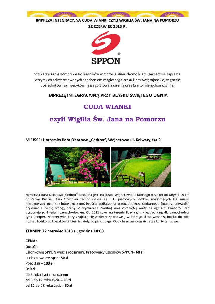 IMPREZA INTEGRACYJNA CUDA WIANKI CZYLI WIGILIA ŚW. JANA NA POMORZU 22 CZERWIEC 2013 R. Stowarzyszenie Pomorskie Pośredników w Obrocie Nieruchomościami serdecznie zaprasza wszystkich zainteresowanych spędzeniem magicznego czasu Nocy Świętojańskiej w gronie pośredników i sympatyków naszego Stowarzyszenia oraz branży nieruchomości na: IMPREZĘ INTEGRACYJNĄ PRZY BLASKU ŚWIĘTEGO OGNIA CUDA WIANKI czyli Wigilia Św. Jana na Pomorzu MIEJSCE: Harcerska Baza Obozowa „Cedron”, Wejherowo ul. Kalwaryjska 9 Harcerska Baza Obozowa „Cedron” położona jest na skraju Wejherowa oddalonego o 30 km od Gdyni i 15 km od Zatoki Puckiej. Baza Obozowa Cedron składa się z 13 piętrowych domków mieszczących 100 miejsc noclegowych, pola namiotowego z możliwością podłączenia prądu, zaplecza sanitarnego (toalety, umywalki, prysznice z ciepłą wodą), sceny (o wymiarach 7m/8m) oraz osłoniętej wiaty na ognisko. Ponadto Baza dysponuje parkingiem samochodowym. Od 2011 roku na terenie Bazy czynny jest parking dla samochodów typu Camper. Naprzeciwko bazy znajduje się zaplecze sportowe , w którego skład wchodzą boisko do piłki nożnej, boisko do koszykówki, bieżnia, stoły do ping-ponga. Obok bazy znajdują się także korty tenisowe. TERMIN: 22 czerwiec 2013 r., godzina 18:00 CENA: Dorośli: Członkowie SPPON wraz z rodzinami, Pracownicy Członków SPPON– 60 zł osoby towarzyszące - 80 zł Pozostali – 100 zł Dzieci: do 5 roku życia - za darmo od 5 do 12 roku życia – 30 zł od 12 do 18 roku życia– 60 zł IMPREZA INTEGRACYJNA CUDA WIANKI CZYLI WIGILIA ŚW. JANA NA POMORZU 22 CZERWIEC 2013 R. Cena zawiera: - udział w imprezie - ognisko, karaoke (zostań gwiazdą wieczoru!) - wyżywienie PRZYKŁADOWE MENU: -żurek z jajkiem - kiełbasa z ogniska lub grilla - karkówka z grilla - szaszłyk - chleb wiejski (smalec, skwarki) - napoje bezalkoholowe - kawa, herbata Cena nie zawiera usługi noclegowej. Na teren obiektu można wnieść swój alkohol. NOCLEGI Na terenie obiektu znajduje się możliwość wynajęcia miejsc noclegowych w domkach o standardzie tzw.: „bieszczadzkim”. Cena pojedynczej rezerwacji wynosi 30 zł brutto od osoby za dobę. W przypadku noclegów grupowych cena ustalana jest indywidualnie. IMPREZA INTEGRACYJNA CUDA WIANKI CZYLI WIGILIA ŚW. JANA NA POMORZU 22 CZERWIEC 2013 R. Domki składają się z dwóch kondygnacji z osobnymi wejściami. Pierwsze piętro to pomieszczenie składające się z 8 łóżek , półek na ubrania i stołu z krzesłami. Drugie piętro (w zależności od domku) składa się z 4 lub 5 łóżek, półki na ubrania, stołu z krzesłami. Każde łóżko wyposażone jest w materac i dwa koce. Dla osób nie posiadających śpiwora istnieje możliwość wypożyczenia pościeli – koszt 6 zł/osoba. Łazienki znajdują się na zewnątrz. Kontakt do organizatora: Justyna Dombrzalska Martyna Wińska +48 501 614 120 [email protected]
