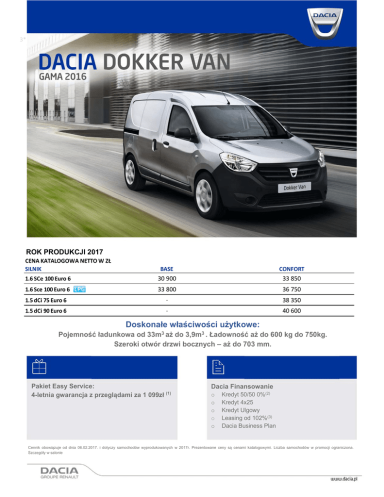 3* ROK PRODUKCJI 2017 CENA KATALOGOWA NETTO W ZŁ SILNIK BASE CONFORT 1.6 SCe 100 Euro 6 30 900 33 850 1.6 Sce 100 Euro 6 33 800 36 750 1.5 dCi 75 Euro 6 ‐ 38 350 1.5 dCi 90 Euro 6 ‐ 40 600 Doskonałe właściwości użytkowe: Pojemność ładunkowa od 33m3 aż do 3,9m3 . Ładowność aż do 600 kg do 750kg. Szeroki otwór drzwi bocznych – aż do 703 mm. Pakiet Easy Service: 4-letnia gwarancja z przeglądami za 1 099zł (1) Dacia Finansowanie o o o o o Kredyt 50/50 0%(2) Kredyt 4x25 Kredyt Ulgowy Leasing od 102%(3) Dacia Business Plan Cennik obowiązuje od dnia 06.02.2017. i dotyczy samochodów wyprodukowanych w 2017r. Prezentowane ceny są cenami katalogowymi. Liczba samochodów w promocji ograniczona. Szczegóły w salonie Base Confort ● ‐ ‐ ‐ ‐ ● 290 1 100 ● 210 ● 415 210 ‐ ● 1 100 ● 0 ‐ ● ‐ 1 500 Gumowa wykła dzi na podłogowa s trefy ła dunkowej (poza 1.6 LPG) ‐ 220 Tyl ne pa nel e ś ci a nek bocznych i os łony na dkol i (poza 1.6 LPG) 8 podłogowych uchwytów do mocowa ni a ła dunku 2 uchwyty do mocowa ni a ła dunku na ś ci a ni e po s troni e bocznych drzwi przes uwa nych i 3 uchwyty po s troni e przeci wnej ‐ ● 210 ● ‐ ● 600kg 750kg ● ● ● ● ● 370 ‐ ●/‐(LPG) ● 370 690 ●/‐(LPG) Pra we boczne drzwi przes uwa ne (ni eprzes zkl ona l ewa boczna ś cia nka i ni eprzes zkl one tyl ne drzwi ) ● ● Przes zkl one pra we boczne drzwi przes uwa ne z otwi era ną s zybą ‐ 210 2 przes uwa nych, bocznych drzwi z otwi era nymi s zyba mi ‐ 1260 Tyl ne , a s ymetryczne, pełne drzwi dwus krzydłowe Dwus krzydłowe, a s ymetryczne, przes zkl one drzwi tyl ne z podgrzewa ną s zybą i wyci era czką s zyby Drzwi l ewe przes uwne pełne ● ● ‐ 350 ‐ 1050 Drzwi l ewe przes uwne przes zkl one ‐ 1260 ● ‐ ● 530 ‐ ●/‐(1.6 84 LPG) ‐ 530 ‐ ‐ P P WYGLĄD ZEWNĘTRZNY Przedni i tyl ny zderza k w kol orze s za rym Przedni i tyl ny zderza k w kol orze na dwozi a Boczne l i s twy ochronne w kol orze ci emnos za rym Cza rne rel i ngi da chowe Lus terka zewnętrzne w kol orze na dwozi a Sta l owe obręcze kół 14" z mi ni koła pa ki em Obręcze kół 15" z koła pa ki em pełnym La ki er meta l i zowa ny SIEDZENIA I WYSTRÓJ WNĘTRZA Ta pi cerka ze s kóry ekol ogi cznej Ta pi cerka ma teri a łowa PRZEGRODY OCHRONNE Obrotowa przegroda kra towa montowa na w zes ta wi eni u z wyjmowa nym fotel em pa s a żera Da ci a Ea s y Sea t STREFA ŁADUNKOWA Ła downoś ć BEZPIECZEŃSTWO CZYNNE I BIERNE ABS z ukła dem ws poma ga ni a na głego ha mowa nia ® Sys tem kontrol i toru ja zdy ESC z funkcją za pobi ega ni a poś l i zgowi kół przy rus za ni u (ASR) Czołowa podus zka powi etrzna ki erowcy Czołowa podus zka powi etrzna pa s a żera Podus zki przedni e boczne Koło za pa s owe DRZWI I SZYBY PROWADZENIE POJAZDU I INSTRUMENTY KONTROLNE Ws poma ga ni e ukła du ki erowni czego Ogra ni czni k prędkoś ci Komputer pokła dowy (ogól ny i dzienny l i czni k ki l ometrów, przebi eg od os ta tni ego ta nkowa ni a , i l oś ć zużytego pa l i wa , ś redni e zużyci e pa l i wa , za s i ęg na pozos ta łym za pa s i e pa l i wa , ś redni a prędkoś ć, przebi eg pozos ta ły do na s tępnego przegl ądu) Ra da r cofa ni a WIDOCZNOŚĆ Refl ektory przeci wmgłowe El ekryczni e s terowa ne i podgrzewa ne l us terka ws teczne Base Confort ‐ ‐ 60 ‐ ‐ ‐ ‐ P P 60 P P 300 2080 ‐ P 530 ‐ ‐ 740 ‐ 1590 ‐ ‐ ‐ ‐ 580 820 580 1500 KOMFORT Centra l na bl oka da drzwi El ektryczni e podnos zone s zyby przedni e Przenoś na popi el ni czka /za pa l ni czka Ki erowni ca z regul a cją w pi oni e Fotel ki erowcy z regul a cją w pi oni e Podłoki etni k przedni Ręczna kl i ma tyza cja SCHOWKI Za myka ny s chowek w des ce rozdzi el czej RADIOODTWARZACZE I MULTIMEDIA Da ci a Pl ug&Mus i c: Ra di oodbi orni k 1 DIN USB, Gni a zdo ja ck, ® Bl uetooth Da ci a Pl ug&Ra di o: Ra di oodbi orni k CD‐MP3 2 DIN USB, Gni a zdo ja ck, Bl uetooth® Da ci a Medi a Na v Evol uti on: wbudowa ny s ys tem na wi ga cji z 7" dotykowym ekra nem, obejmujący ra di oodbi orni k, złącze Bl uetooth z możl i woś ci ą podłączeni a przenoś nych odtwa rza czy PAKIETY Look El ektryczny Pra ktyczny 2 Komfortowy ● = seryjne ○ = w opcji P = element pakietu ‐ = niedostępne Niektóre opcje wymagają zamówienia innych opcji lub wykluczają się wzajemnie. Szczegóły u Autoryzowanych Partnerów Dacii. Pakiet Country Nr ref. 7711566701 W skład pakietu wchodzą: - belka do standardowego haka hol. z wiązką 7- biegunową - zestaw do montażu haka - zestaw chlapaczy. Cena z montażem: 2 317 1 854 zł Pakiet Comfort Nr ref. 7711566702 W skład pakietu wchodzą: - dywaniki gumowe - podłokietnik centralny. Cena z montażem: 1 066 852 zł Pakiet Wood Nr ref. 7711566703 W skład pakietu wchodzą: - drewniana podłoga - drewniane wyłożenie ścian - drewniane osłony kół wewnątrz. Cena z montażem: 1 617 1 294 zł Stalowa galeryjka dachowa Nr ref. 8201149914 Niezbędna do bezpiecznego przewożenia ciężkich ładunków na dachu. Cena: 1 450 zł Prezentowane ceny pakietów są cenami brutto z montażem. Użyte zdjęcia służą do celów poglądowych i mogą się różnić od rzeczywistego wyglądu produktów. Pełna oferta pakietów akcesoriów dostępna jest u Autoryzowanych Partnerów Dacii. SILNIK 7 1.6 SCe 100 1.6 SCe 100 LPG benzyna mech. 5b Euro 6 H4M 738 1 598 78 x 83,6 4/16 75(102) 5 500 156 4000 benzyna LPG mech. 5b Euro 6 H4M 740 1598 79,5x80,5 4/16 75 (102) / LPG : 72 (98) 5500 150 4000 Pal i wo Typ s krzyni bi egów Norma emi s ji s pal i n Typ s i l ni ka (cm3) Pojemnoś ć s kokowa Średni ca cyl i ndra x s kok tłoka (mm) Li czba cyl i ndrów / za worów Ma ks yma l na moc kW EWG (KM) Prędkoś ć obrotowa przy ma ks yma l nej mocy Ma ks yma l ny moment obrotowy EWG (mkg) Prędkoś ć obrotowa przy ma ks yma l nym momenci e Typ wtrys ku wi el opunktowy Wol nos s ący/doładowa ny Ukła d wol nos s ąc