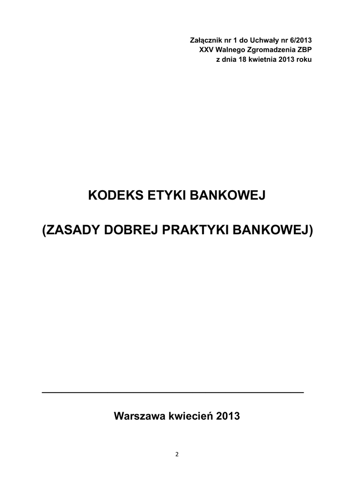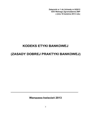 Załącznik nr 1 do Uchwały nr 6/2013 XXV Walnego Zgromadzenia ZBP z dnia 18 kwietnia 2013 roku KODEKS ETYKI BANKOWEJ (ZASADY DOBREJ PRAKTYKI BANKOWEJ) ________________________________________ Warszawa kwiecień 2013 2 SPIS TREŚCI Postanowienia ogólne Kodeksu Etyki Bankowej CZĘŚĆ A Kodeks Dobrych Praktyk Bankowych Rozdział I Relacje z Klientami Zasady postępowania ze skargami i reklamacjami Klientów Rozdział II Relacje z pracownikami Rozdział III Relacje pomiędzy (konkurentami) bankami oraz innymi instytucjami Rozdział IV Relacje z partnerami biznesowymi Rozdział V Relacje ze środowiskiem lokalnym Rozdział VI Zasady przetwarzania danych osobowych Część B Kodeks Etyki Pracownika Banku Rozdział I Podstawowe zasady postępowania pracownika banku Rozdział II Relacje wewnętrzne Rozdział III Relacje zewnętrzne Postanowienia końcowe Kodeksu Etyki Bankowej 3 finansowymi Postanowienia ogólne Kodeksu Etyki Bankowej 1. Mechanizmy rynkowe są koniecznymi, lecz niewystarczającymi wyznacznikami działalności banków. Stąd niezbędne jest uwzględnienie także wartości etycznych w procesie podejmowania decyzji ekonomicznych. 2. Kodeks Etyki Bankowej, zwany dalej „Kodeksem”, stanowi zbiór zasad postępowania związanych z działalnością banków, które odnoszą się odpowiednio do banków, osób w nich zatrudnionych oraz osób, za których pośrednictwem banki wykonują czynności bankowe. Kodeks Etyki Bankowej składa się z dwóch części: Kodeksu Dobrych Praktyk Bankowych (A) oraz Kodeksu Etyki Pracownika Banku (B). 3. Banki, jako instytucje zaufania publicznego w swojej działalności kierują się przepisami prawa, rekomendacjami Komisji Nadzoru Finansowego, uchwałami samorządu bankowego, normami przewidzianymi w Kodeksie oraz dobrymi zwyczajami kupieckimi. Banki i ich pracownicy oraz osoby, za których pośrednictwem banki wykonują czynności bankowe, uwzględniają zasady: profesjonalizmu, rzetelności, rzeczowości, staranności i najlepszej wiedzy. 4. Banki, poprzez swoją działalność, powinny przyczyniać się do społecznoekonomicznego rozwoju kraju oraz wzrostu zamożności społeczeństwa poprzez społecznie odpowiedzialne prowadzenie biznesu, wprowadzanie innowacyjnych rozwiązań i wspieranie rozwoju edukacji społeczeństwa. 5. Fundamentalną zasadą, na której banki i ich pracownicy powinni budować swoje relacje z otoczeniem jest odpowiedzialność społeczna. Realizując strategię biznesową banki powinny kierować się nie tylko uwarunkowaniami ekonomicznymi, ale również słusznymi interesami swoich Klientów, pracowników, akcjonariuszy, partnerów biznesowych, a także lokalnego środowiska. 6. Kodeks Etyki Bankowej uwzględnia treść norm zawartych w Kanonie Dobrych Praktyk Rynku Finansowego. 7. Postanowienia ogólne Kodeksu Etyki Bankowej oraz Postanowienia końcowe Kodeksu Etyki Bankowej mają zastosowanie zarówno do Kodeksu Dobrych Praktyk Bankowych (część A) jak i do Kodeksu Etyki Pracownika Banku (część B). 4 CZĘŚĆ A. KODEKS DOBRYCH PRAKTYK BANKOWYCH Rozdział I 1. Relacje z Klientami 1.1. W stosunkach z Klientami banki postępują z uwzględnieniem szczególnego zaufania jakim są darzone oraz wysokich wymagań co do rzetelności, solidności i wiarygodności, traktując wszystkich swoich Klientów z należytą starannością. 1.2. W relacjach z Klientami bank powinien kierować się uczciwością, odpowiedzialnością, profesjonalizmem oraz innowacyjnością. 1.3. Bank w stosunkach z Klientami i przy wykonywaniu czynności na rzecz Klientów, powinien działać zgodnie z zawartymi umowami, w granicach dobrze pojętego interesu własnego i z uwzględnieniem interesów Klientów. Bank nie może wykorzystywać swego profesjonalizmu w sposób naruszający interesy Klientów. 1.4. Bank, jako podmiot oferujący usługi innych instytucji finansowych (emitentów), takie jak np. polisy ubezpieczeniowe, jednostki funduszy inwestycyjnych, powinien zapewnić Klientom pełną, rzetelną informację o tym produkcie, jego emitencie i warunkach procesu reklamacyjnego oraz w miarę możliwości wspierać Klientów w wypadku zgłaszania reklamacji, biorąc pod uwagę, że opinie o produkcie są jednocześnie odnoszone do banku jako oferenta. 1.5. Zasady działania banku w stosunkach z Klientami, informacje o świadczonych usługach, a także umowy, dokumenty bankowe i pisma kierowane do Klientów, powinny być formułowane w sposób precyzyjny, zrozumiały i przejrzysty. 1.6. Bank, informując Klientów o rodzajach i warunkach świadczonych usług (także w reklamach), stara się wyjaśnić różnice pomiędzy poszczególnymi oferowanymi usługami i produktami ze wskazaniem zarówno korzyści, które dana usługa lub produkt zapewniają, jak również związanego z nimi ryzyka, umożliwiając Klientowi dokonanie świadomego wyboru. 1.7. Akcje promocyjne banków powinny rzetelnie, jednoznacznie informować Klientów o oferowanych produktach i usługach, a forma ich prezentowania nie powinna wprowadzać w błąd. 1.8. Każdy Klient powinien być traktowany z należytym szacunkiem oraz nie może być dyskryminowany ze względu na jakiekolwiek jego cechy bądź przekonania. 5 1.9. Oferta banku powinna być zróżnicowana i dostosowana do potrzeb różnych grup Klientów. 1.10 W swojej działalności bank powinien uwzględniać poszanowanie godności ludzkiej, zwłaszcza w obszarach obsługi Klienta, działań promocyjnych i marketingowych oraz windykacji należności. 2. Zasady postępowania ze skargami/reklamacjami Klientów 2.1. Bank zapewnia Klientom dostęp do informacji o obowiązujących w banku procedurach składania i rozpatrywania skarg/reklamacji. 2.2. Skargi/reklamacje na działalność banku, składane przez Klientów powinny być rozpatrywane rzetelnie, w sposób obiektywny, w możliwie najkrótszych terminach i nie dłuższych niż w obowiązujących rekomendacjach. 2.3. Banki powinny dążyć do polubownego załatwiania sp