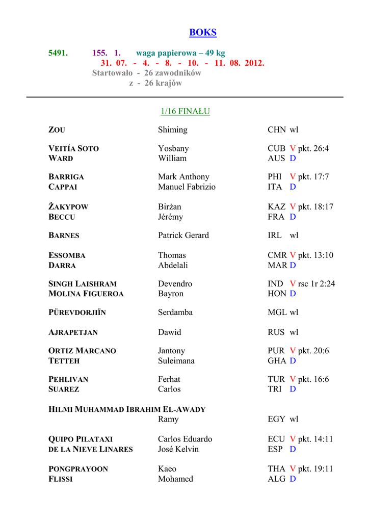 BOKS 5491. 155. 1. waga papierowa – 49 kg 31. 07. - 4. - 8. - 10. - 11. 08. 2012. Startowało - 26 zawodników z - 26 krajów _________________________________________________________________________ 1/16 FINAŁU ZOU Shiming CHN wl VEITÍA SOTO WARD Yosbany William CUB V pkt. 26:4 AUS D BARRIGA CAPPAI Mark Anthony Manuel Fabrizio PHI V pkt. 17:7 ITA D śAKYPOW BECCU BirŜan Jérémy KAZ V pkt. 18:17 FRA D BARNES Patrick Gerard IRL wl ESSOMBA DARRA Thomas Abdelali CMR V pkt. 13:10 MAR D SINGH LAISHRAM MOLINA FIGUEROA Devendro Bayron IND V rsc 1r 2:24 HON D PÜREVDORJIÏN Serdamba MGL wl AJRAPETJAN Dawid RUS wl ORTIZ MARCANO TETTEH Jantony Suleimana PUR V pkt. 20:6 GHA D PEHLIVAN SUAREZ Ferhat Carlos TUR V pkt. 16:6 TRI D HILMI MUHAMMAD IBRAHIM EL-AWADY Ramy EGY wl QUIPO PILATAXI DE LA NIEVE LINARES Carlos Eduardo José Kelvin ECU V pkt. 14:11 ESP D PONGPRAYOON FLISSI Kaeo Mohamed THA V pkt. 19:11 ALG D ALEKSANDROW EMIŁOW MAQUINA Aleksandăr Juliano Fernando Gento BUL V pkt. 22:7 MOZ D SIN Jong-Hun KOR wl _________________________________________________________________________ 1/8 FINAŁU ZOU VEITÍA SOTO Shiming Yosbany CHN V pkt. 14:11 CUB D śAKYPOW BARRIGA BirŜan Mark Anthony KAZ V pkt. 17:16 PHI D BARNES ESSOMBA Patrick Gerard Thomas IRL V pkt. 15:10 CMR D SINGH LAISHRAM PÜREVDORJIÏN Devendro Serdamba IND V pkt. 16:11 MGL D AJRAPETJAN ORTIZ MARCANO Dawid Jantony RUS V pkt. 15:13 PUR D PEHLIVAN Ferhat HILMI MUHAMMAD IBRAHIM EL-AWADY Ramy TUR V pkt. 20:6 PONGPRAYOON QUIPO PILATAXI THA V pkt. 10:6 ECU D Kaeo Carlos Eduardo EGY D ALEKSANDROW EMIŁOW Aleksandăr BUL V pkt. 15:14 SIN Jong-Hun KOR D _________________________________________________________________________ ĆWIERĆFINAŁ ZOU śAKYPOW Shiming BirŜan CHN V pkt. 13:10 KAZ D BARNES SINGH LAISHRAM Patrick Gerard Devendro IRL V pkt. 23:18 IND D AJRAPETJAN PEHLIVAN Dawid Ferhat RUS V pkt. 19:11 TUR D PONGPRAYOON Kaeo THA V pkt. 16:10 ALEKSANDROW EMIŁOW Aleksandăr BUL D _________________________________________________________________________ PÓŁFINAŁY ZOU BARNES Shiming Patrick Gerard CHN V pkt. +15:15 IRL D Kaeo THA V pkt. 13:12 PONGPRAYOON AJRAPETJAN Dawid RUS D _________________________________________________________________________ FINAŁ ZOU Shiming CHN V pkt. 13:10 PONGPRAYOON Kaeo THA D _________________________________________________________________________ 1.ZOU Shiming CHN 2.PONGPRAYOON Kaeo THA 3.BARNES Patrick Gerard IRL 3.AJRAPETJAN Dawid RUS 5.śAKYPOW BirŜan KAZ 5.SINGH LAISHRAM Devendro IND 5.PEHLIVAN Ferhat TUR 5.ALEKSANDROW EMIŁOW Aleksandăr BUL _________________________________________________________________________ 5492. 156. 2. waga musza – 52 kg 30. 07. - 3. - 7. - 10. - 12. 08. 2012. Startowało - 26 zawodników z - 26 krajów _________________________________________________________________________ 1/16 FINAŁU AŁOJAN Michaił RUS wl BRAHIMI WOODS Samir Jackson Darren ALG V pkt. 14:12 AUS D HENRIQUES NETO PAK Julião Jong Chol BRA V pkt. 12:8 PRK D CINTRON OCASIO OTENG Jeyvier Oteng PUR V pkt. 14:12 BOT D ŁATIPOW śasurbek UZB wl YAHIA MAHMUD ABDELAAL Hesham NJANGIRU Benson EGY V pkt. 19:15 KEN D NYAMBAYARYN MƏMIŞZADƏ Tögstsogt Elvin MGL V pkt. 18:11 AZE D PICARDI Vincenzo ITA wl WARREN Rau'Shee USA wl OUBAALI FAISAL Nordine Ajmal FRA V pkt. 22:9 AFG D MICAH LAVIGILANTE Duke Jason GHA V pkt. 18:14 MRI D CONLAN Michael IRL wl BUTDEE EKER Chatchai Selçuk THA V pkt. 24:10 TUR D RAMÍREZ CARRAZANA SUSA Robeisy Eloy Katsuaki CUB V pkt. 19:7 JPN D SULEJMENOW N’TUVE Iljas Salomo Salum Suötani KAZ V pkt. 13:8 SWE D SELBY Andrew Christopher GBR wl _________________________________________________________________________ 1/8 FINAŁU AŁOJAN BRAHIMI Michaił Samir RUS V pkt. 14:9 ALG D CINTRON OCASIO HENRIQUES NETO Jeyvier Julião PUR V pkt. 18:13 BRA D ŁATIPOW śasurbek YAHIA MAHMUD ABDELAAL Hesham UZB V pkt. 21:11 EGY D NYAMBAYARYN PICARDI Tögstsogt Vincenzo MGL V pkt. 17:16 ITA D OUBAALI WARREN Nordine Rau'Shee FRA V pkt. 19:18 USA D CONLAN MICAH Michael Duke IRL V pkt. 19:8 GHA D RAMÍREZ CARRAZANA BUTDEE Robeisy Eloy Chatchai CUB V pkt. 22:10 THA D SELBY Andrew Christopher GBR V pkt. 19:15 SULEJMENOW Iljas KAZ D _________________________________________________________________________ ĆWIERĆFINAŁY AŁOJAN CINTRON OCASIO Michaił Jeyvier RUS V pkt. 23:13 PUR D NYAMBAYARYN ŁATIPOW Tögstsogt śasurbek MGL V pkt. 15:10 UZB D CONLAN OUBAALI Michael Nordine IRL V pkt. 22:18 FRA D RAMÍREZ CARRAZANA Robeisy Eloy CUB V pkt. 16:11 SELBY Andrew Christopher GBR D _________________________________________________________________________ PÓŁFINAŁY NYAMBAYARYN AŁOJAN Tögstsogt Michaił MGL V pkt. 15:11 RUS D RAMÍREZ CARRAZANA Robeisy Eloy CUB V pkt. 20:10 CONLAN Michael IRL D _________________________________________________________________________ FINAŁ RAMÍREZ CARRAZANA Robeisy Eloy CUB V pkt. 17:14 NYAMBAYARYN Tögstsogt MGL D _________________________________________________________________________ 1.RAMÍREZ CARRAZANA Robeisy Eloy CUB 2.NYAMBAYARYN Tögstsogt MGL 3.AŁOJAN Michaił RUS 3.CONLAN Michael IRL 5.CINTRON OCASIO Jeyvier PUR 5.ŁATIPOW śasurbek UZB 5.OUBAALI Nordine FRA 5.SELBY Andrew Christopher GBR _________________________________________________________________________ 5493. 157. 3. waga kogucia – 56 kg 28. 07. - 1. - 5. - 10. - 11. 08. 2012. Startowało - 27 zawodników z - 27 krajów _________________________________________________________________________ 1/16 FINAŁU ÁLVAREZ ESTRADA Lázaro Jorge CUB wl DIAZ ISZCZENKO Joseph Pedroza, Jr. Pawło USA V pkt. 19:9 UKR D WODOPJANOW MELIÁN Siergiej Alberto Ezequiel RUS V pkt. 12:5 ARG D VIEIRA DE JESUS SZAIMOW Robenilson Orzubek BRA V pkt. 13:7 UZB D NEVIN CEYLAN John Joseph Dennis Villy IRL V pkt. 21:6 DEN D ABUTALIPOW SLAMANA Kanat Wessam KAZ V pkt. 15:7 SYR D VALDÉZ FIERRO THAPA Óscar Rafael Shiva MEX V pkt. 14:9 IND D YUNUSOV Anvar TJK wl CAMPBELL Luke GBR wl PARRINELLO MATHEUS Jahyn Vittorio Jonas ITA V p