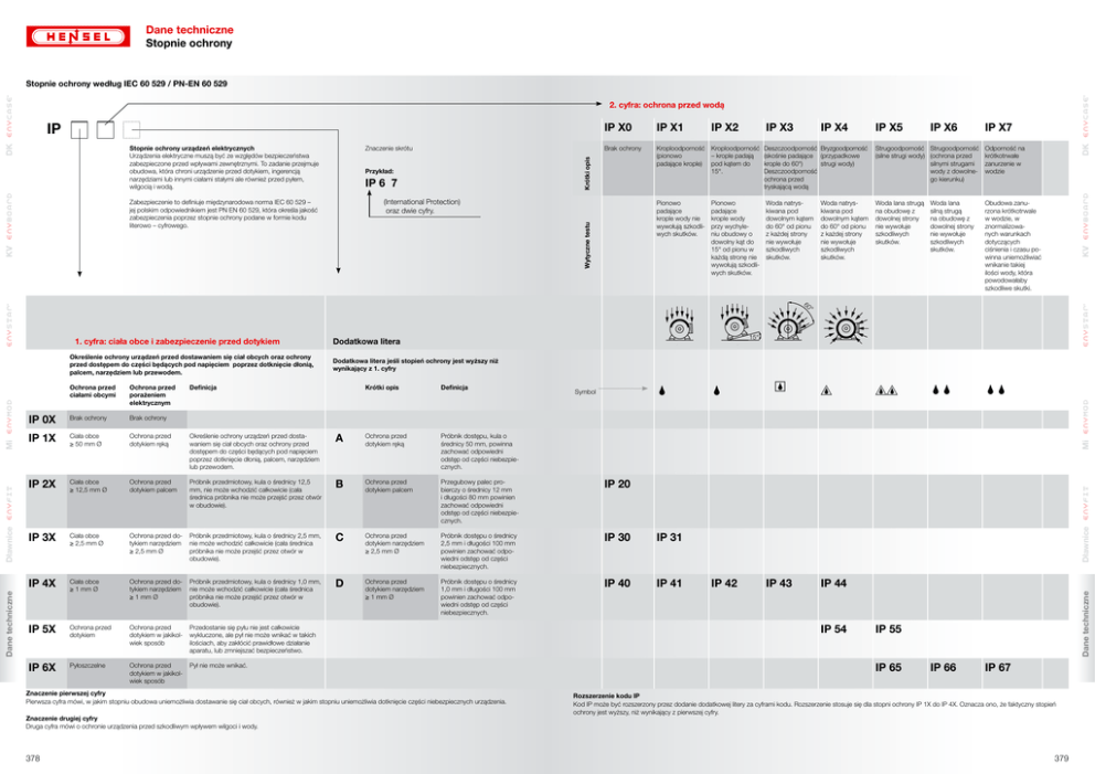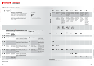 Dane techniczne Stopnie ochrony Stopnie ochrony według IEC 60 529 / PN-EN 60 529 2. cyfra: ochrona przed wodą IP X2 Przykład: IP 6 7 Brak ochrony Kroploodporność (pionowo padające krople) Kroploodporność – krople padają pod kątem do 15°. Pionowo padające krople wody nie wywołują szkodliwych skutków. Pionowo padające krople wody przy wychyleniu obudowy o dowolny kąt do 15° od pionu w każdą stronę nie wywołują szkodliwych skutków. (International Protection) oraz dwie cyfry. KV Wytyczne testu Zabezpieczenie to definiuje międzynarodowa norma IEC 60 529 – jej polskim odpowiednikiem jest PN EN 60 529, która określa jakość zabezpieczenia poprzez stopnie ochrony podane w formie kodu literowo – cyfrowego. IP X3 IP X4 Deszczoodporność Bryzgoodporność (skośnie padające (przypadkowe krople do 60°) strugi wody) Deszczoodporność ochrona przed tryskającą wodą Woda natryskiwana pod dowolnym kątem do 60° od pionu z każdej strony nie wywołuje szkodliwych skutków. IP X5 IP X6 Strugoodporność Strugoodporność Odporność na (silne strugi wody) (ochrona przed krótkotrwałe silnymi strugami zanurzenie w wody z dowolne- wodzie go kierunku) Woda natryskiwana pod dowolnym kątem do 60° od pionu z każdej strony nie wywołuje szkodliwych skutków. Woda lana strugą na obudowę z dowolnej strony nie wywołuje szkodliwych skutków. Woda lana silną strugą na obudowę z dowolnej strony nie wywołuje szkodliwych skutków. Obudowa zanurzona krótkotrwale w wodzie, w znormalizowanych warunkach dotyczących ciśnienia i czasu powinna uniemożliwiać wnikanie takiej ilości wody, która powodowałaby szkodliwe skutki. IP 66 IP 67 Dane techniczne Ochrona przed porażeniem elektrycznym Definicja Krótki opis Definicja IP 0X Brak ochrony Brak ochrony IP 1X Ciała obce ≥ 50 mm Ø Ochrona przed dotykiem ręką Określenie ochrony urządzeń przed dostawaniem się ciał obcych oraz ochrony przed dostępem do części będących pod napięciem poprzez dotknięcie dłonią, palcem, narzędziem lub przewodem. A Ochrona przed dotykiem ręką Próbnik dostępu, kula o średnicy 50 mm, powinna zachować odpowiedni odstęp od części niebezpiecznych. IP 2X Ciała obce ≥ 12,5 mm Ø Ochrona przed dotykiem palcem Próbnik przedmiotowy, kula o średnicy 12,5 mm, nie może wchodzić całkowicie (cała średnica próbnika nie może przejść przez otwór w obudowie). B Ochrona przed dotykiem palcem Przegubowy palec probierczy o średnicy 12 mm i długości 80 mm powinien zachować odpowiedni odstęp od części niebezpiecznych. IP 20 IP 3X Ciała obce ≥ 2,5 mm Ø Ochrona przed dotykiem narzędziem ≥ 2,5 mm Ø Próbnik przedmiotowy, kula o średnicy 2,5 mm, nie może wchodzić całkowicie (cała średnica próbnika nie może przejść przez otwór w obudowie). C Ochrona przed dotykiem narzędziem ≥ 2,5 mm Ø Próbnik dostępu o średnicy 2,5 mm i długości 100 mm powinien zachować odpowiedni odstęp od części niebezpiecznych. IP 30 IP 31 IP 4X Ciała obce ≥ 1 mm Ø Ochrona przed dotykiem narzędziem ≥ 1 mm Ø Próbnik przedmiotowy, kula o średnicy 1,0 mm, nie może wchodzić całkowicie (cała średnica próbnika nie może przejść przez otwór w obudowie). D Ochrona przed dotykiem narzędziem ≥ 1 mm Ø Próbnik dostępu o średnicy 1,0 mm i długości 100 mm powinien zachować odpowiedni odstęp od części niebezpiecznych. IP 40 IP 41 IP 5X Ochrona przed dotykiem Ochrona przed dotykiem w jakikolwiek sposób Przedostanie się pyłu nie jest całkowicie wykluczone, ale pył nie może wnikać w takich ilościach, aby zakłócić prawidłowe działanie aparatu, lub zmniejszać bezpieczeństwo. IP 6X Pyłoszczelne Ochrona przed dotykiem w jakikolwiek sposób Pył nie może wnikać. Znaczenie pierwszej cyfry Pierwsza cyfra mówi, w jakim stopniu obudowa uniemożliwia dostawanie się ciał obcych, również w jakim stopniu uniemożliwia dotknięcie części niebezpiecznych urządzenia. Znaczenie drugiej cyfry Druga cyfra mówi o ochronie urządzenia przed szkodliwym wpływem wilgoci i wody. 378 Symbol Mi Ochrona przed ciałami obcymi Dodatkowa litera jeśli stopień ochrony jest wyższy niż wynikający z 1. cyfry Dławnice Dławnice Mi Określenie ochrony urządzeń przed dostawaniem się ciał obcych oraz ochrony przed dostępem do części będących pod napięciem poprzez dotknięcie dłonią, palcem, narzędziem lub przewodem. Dodatkowa litera IP 42 IP 43 IP 44 IP 54 Dane techniczne 1. cyfra: ciała obce i zabezpieczenie przed dotykiem IP X7 DK Znaczenie skrótu IP X1 KV Stopnie ochrony urządzeń elektrycznych Urządzenia elektryczne muszą być ze względów bezpieczeństwa zabezpieczone przed wpływami zewnętrznymi. To zadanie przejmuje obudowa, która chroni urządzenie przed dotykiem, ingerencją narzędziami lub innymi ciałami stałymi ale również przed pyłem, wilgocią i wodą. IP X0 Krótki opis DK IP IP 55 IP 65 Rozszerzenie kodu IP Kod IP może być rozszerzony przez dodanie dodatkowej litery za cyframi kodu. Rozszerzenie stosuje się dla stopni ochrony IP 1X do IP 4X. Oznacza ono, że faktyczny stopień ochrony jest wyższy, niż wynikający z pierwszej cyfry. 379 Dane techniczne Stopnie ochrony Wymagania wg DIN VDE 0100 cz. 737 - zapewnienie stopnia ochrony DK 1.1. Minimalne wymagania dla urządzeń: 1. Wymaganie ochrona przed wodą wszystkich urządzeń elektrycznych przez odpowiednią osłonę (2-ga cyfra). Stopień ochrony IP X 1 Na zewnątrz pod osłoną Stopień ochrony IP X 3 Na zewnątrz bez osłony KV Wewnątrz Stopień ochrony IP X 1 1.2. Minimalne wymagania dla urządzeń elektrycznych pracujących w trudnych warunkach: Stopień ochrony IP X 4 ochrona przed przypadkową strugą wody przy okazyjnym myciu obiektu np. gospodarczego Stopień ochrony IP X 5 Mi ochrona przed strugą niebezpośrednią wody przy stałym narażeniu Dławnice np. myjnie pojazdów Stopień ochrony IP X 5 i dodatkowe wyjaśnienie producenta: ochrona przed bezpoś
