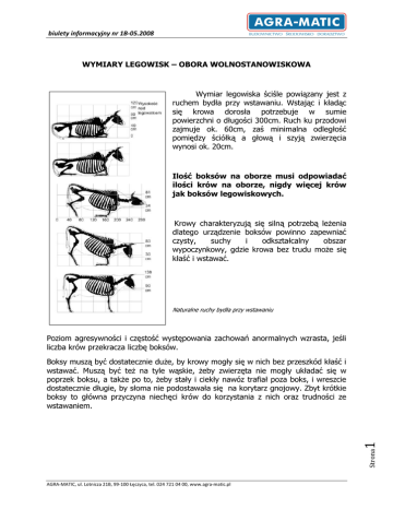 biulety informacyjny nr 1B-05.2008 WYMIARY LEGOWISK – OBORA WOLNOSTANOWISKOWA Wymiar legowiska ściśle powiązany jest z ruchem bydła przy wstawaniu. Wstając i kładąc się krowa dorosła potrzebuje w sumie powierzchni o długości 300cm. Ruch ku przodowi zajmuje ok. 60cm, zaś minimalna odległość pomiędzy ściółką a głową i szyją zwierzęcia wynosi ok. 20cm. Ilość boksów na oborze musi odpowiadać ilości krów na oborze, nigdy więcej krów jak boksów legowiskowych. Krowy charakteryzują się silną potrzebą leŜenia dlatego urządzenie boksów powinno zapewniać czysty, suchy i odkształcalny obszar wypoczynkowy, gdzie krowa bez trudu moŜe się kłaść i wstawać. Naturalne ruchy bydła przy wstawaniu Poziom agresywności i częstość występowania zachowań anormalnych wzrasta, jeśli liczba krów przekracza liczbę boksów. Strona 1 Boksy muszą być dostatecznie duŜe, by krowy mogły się w nich bez przeszkód kłaść i wstawać. Muszą być teŜ na tyle wąskie, Ŝeby zwierzęta nie mogły układać się w poprzek boksu, a takŜe po to, Ŝeby stały i ciekły nawóz trafiał poza boks, i wreszcie dostatecznie długie, by słoma nie podostawała się na korytarz gnojowy. Zbyt krótkie boksy to główna przyczyna niechęci krów do korzystania z nich oraz trudności ze wstawaniem. AGRA-MATIC, ul. Lotnicza 21B, 99-100 Łęczyca, tel. 024 721 04 00, www.agra-matic.pl biulety informacyjny nr 1B-05.2008 ZALECENIA WYMIARÓW BOKSÓW LEGOWISKOWYCH Wymiar boksów A - Szerokość legowiska1) B - Długość legowiska pod ścianą2) C - Długość legowiska (rząd podwójny) D - Spadek podłogi w boksie E - Dolna poręcz przegrody wysokość ponad ściółkę F - Odległość rury karkowej od początku legowiska3) G - Wysokość rury karkowej H - Wysokość przegrody kolanowej I - Odległość przegrody kolanowej od początku legowiska4) J - Odległość przegrody od początku legowiska K - Wysokość podłoŜa legowiska ponad poziom korytarza5) Wymiar minimalny Wymiar optymalny 115cm 260cm 240cm 2,5% Max.10cm 190cm 115cm 15cm 180cm 25cm 20cm 120cm 270cm 250cm 4% 205-210cm 120cm 20cm 210cm 30cm 25cm 1) dla krów zasuszonych min.120cm, dla boksów z pełną ścianą (skrajne) zwiększyć o 10% 2) przy duŜych krowach zalecana długość 300cm 3) odległość mierzona od górnej krawędzi legowiska do rury karkowej, odległość zaleŜy od gabarytów krów, wysokości rury karkowej, przy zastosowaniu ogranicznika kolanowego sugerowany wymiar 200-210cm, przy braku przegrody kolanowej ok.195cm 4) wymiar uzaleŜniony od długości całego legowiska, wielkości przegród i gabarytów krów 5) wymiar wraz z warstwą ściółki lub materaca A G J E H F I K D Strona 2 B AGRA-MATIC, ul. Lotnicza 21B, 99-100 Łęczyca, tel. 024 721 04 00, www.agra-matic.pl