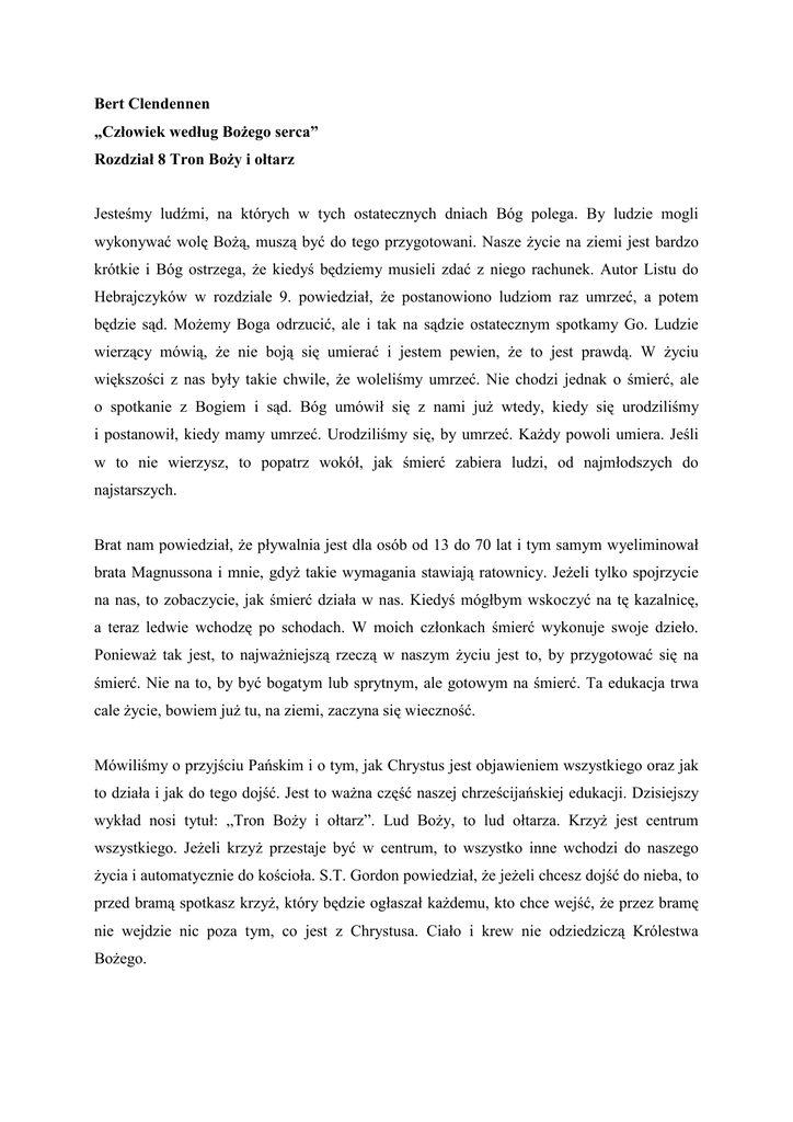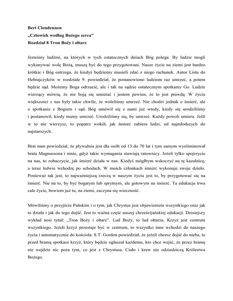 Bert Clendennen „Człowiek według Bożego serca” Rozdział 8 Tron Boży i ołtarz Jesteśmy ludźmi, na których w tych ostatecznych dniach Bóg polega. By ludzie mogli wykonywać wolę Bożą, muszą być do tego przygotowani. Nasze życie na ziemi jest bardzo krótkie i Bóg ostrzega, że kiedyś będziemy musieli zdać z niego rachunek. Autor Listu do Hebrajczyków w rozdziale 9. powiedział, że postanowiono ludziom raz umrzeć, a potem będzie sąd. Możemy Boga odrzucić, ale i tak na sądzie ostatecznym spotkamy Go. Ludzie wierzący mówią, że nie boją się umierać i jestem pewien, że to jest prawdą. W życiu większości z nas były takie chwile, że woleliśmy umrzeć. Nie chodzi jednak o śmierć, ale o spotkanie z Bogiem i sąd. Bóg umówił się z nami już wtedy, kiedy się urodziliśmy i postanowił, kiedy mamy umrzeć. Urodziliśmy się, by umrzeć. Każdy powoli umiera. Jeśli w to nie wierzysz, to popatrz wokół, jak śmierć zabiera ludzi, od najmłodszych do najstarszych. Brat nam powiedział, że pływalnia jest dla osób od 13 do 70 lat i tym samym wyeliminował brata Magnussona i mnie, gdyż takie wymagania stawiają ratownicy. Jeżeli tylko spojrzycie na nas, to zobaczycie, jak śmierć działa w nas. Kiedyś mógłbym wskoczyć na tę kazalnicę, a teraz ledwie wchodzę po schodach. W moich członkach śmierć wykonuje swoje dzieło. Ponieważ tak jest, to najważniejszą rzeczą w naszym życiu jest to, by przygotować się na śmierć. Nie na to, by być bogatym lub sprytnym, ale gotowym na śmierć. Ta edukacja trwa cale życie, bowiem już tu, na ziemi, zaczyna się wieczność. Mówiliśmy o przyjściu Pańskim i o tym, jak Chrystus jest objawieniem wszystkiego oraz jak to działa i jak do tego dojść. Jest to ważna część naszej chrześcijańskiej edukacji. Dzisiejszy wykład nosi tytuł: „Tron Boży i ołtarz”. Lud Boży, to lud ołtarza. Krzyż jest centrum wszystkiego. Jeżeli krzyż przestaje być w centrum, to wszystko inne wchodzi do naszego życia i automatycznie do kościoła. S.T. Gordon powiedział, że jeżeli chcesz dojść do nieba, to przed bramą spotkasz krzyż, który będzie ogłaszał każdemu, kto chce wejść, że przez bramę nie wejdzie nic poza tym, co jest z Chrystusa. Ciało i krew nie odziedziczą Królestwa Bożego. Będziemy czytać Rzymian 8:28: „A wiemy, że Bóg współdziała we wszystkim ku dobremu z tymi, którzy Boga miłują, to jest z tymi, którzy według postanowienia jego są powołani”. Bóg musi dokonać czegoś w nas, zanim będzie mógł cokolwiek uczynić z nami lub przez nas. To, co Bóg chce czynić w nas, musi być w naszym życiu priorytetem. Musi być na pierwszym miejscu. Dla większości ludzi, którzy sami siebie nazywają chrześcijanami. Bóg jest niczym więcej, jak tylko rodzajem zabezpieczenia przed pożarem. Mają Go tylko po to, by mogli uniknąć potępienia. Ale Bóg ma dla wierzących o wiele więcej, niż tylko uchronić nas przed piekłem i zabrać do nieba. Przez cały ten tydzień słyszymy, że ostatecznym planem Boga dla naszego życia jest to, by nas uformować na podobieństwo Syna Bożego Jezusa Chrystusa i dla tego celu wszystko współdziała ku dobremu. Nam się wydaje, że nie zawsze wszystko współdziała ku dobremu, bo czasem jest to bolesne. Jeżeli jednak pozwolimy Mu działać, to w końcu stwierdzimy, że to było ku dobremu. Ja bardziej boję się odniesienia sukcesu w rzeczach niewłaściwych, niż upadku. Bardziej obawiam się, żeby nie spędzić mojego życia na budowaniu z siana, słomy i drewna, by na końcu życia nieokazało się, że nie ma to trwałej wartości. Bóg będzie używał każdej okoliczności, by włożyć w twoje życie coś z natury i charakteru Syna Bożego Jezusa Chrystusa. Boga naprawdę obchodzi to, co ty i ja robimy, ale o wiele bardziej zależy Mu na tym, czym będziemy na końcu naszego biegu, ponieważ od tego, czym będę, zależy to, co będę robił. Gorzką prawdą jest to, że można robić wielkie rzeczy, a nie być wielkim człowiekiem. Typowym przykładem był Samson. Czynił wielkie rzeczy i miał na sobie wielkie namaszczenie Boże, ale w jego życiu była jakaś wada, defekt charakteru, z którym nigdy się nie rozprawił, aż wreszcie wyszło to na jaw i zniszczyło go. Wszystkie wielkie dzieła, których dokonał, pozostały w cieniu jego upadku pod koniec życia. Większość z nas zna lub znało ludzi, którzy byli bardzo zdolni, mieli wielkie talenty i dokonywali wielkich rzeczy, ale mieli pewne wady charakteru, które wyszły na jaw i wszystkie dokonania ich życia zostały zaprzepaszczone, kiedy odpadli od Boga. Bóg pragnie upodobnić nas do Chrystusa, ale by mogło się to dokonać, musimy dojść do takiego momentu, kiedy skonfrontujemy się z samymi sobą. Bóg musi nas doprowadzić do miejsca, z którego uczciwie spojrzymy na siebie, bez żadnej fasady czy imitacji, na każdą dziedzinę naszego życia. Izajasz znalazł się w takim miejscu. Jest to opisane w Izajasza 6:1-9. To był 2 największy kaznodzieja Starego Testamentu. W jego życiu były rzeczy i ambicje sprzeczne z tym, do czego powołał go Bóg i dlatego musiał zostać z tym skonfrontowany. Można mieć wielkie talenty i zdolności i robić rzeczy, które sprawiają, że w oczach ludzi jesteśmy wielcy. Łatwo jest potem samemu w to uwierzyć. W tym tkwi cała ludzka próżność, że kiedy ludzie zaczynają, o nas dobrze mówić, zatracamy Bożą prawdę: nie ma nikogo dobrego, tylko Bóg. CM. Ward był największym radiowym kaznodzieją przebudzeniowym w czasie przebudzenia, które ogarnęło prawie cały świat. Był moim wielkim przyjacielem i usługiwał w moim zborze. Zawsze nazywał mnie sierżantem, ponieważ byłem sierżantem w marynarce wojennej. Kiedyś powiedział do mnie: „Sierżancie, świat wpada w wielkie kłopoty, kiedy kaznodzieje zaczynają wierzyć w swoją własną propagandę”. To jest prawda. Zobaczmy w 