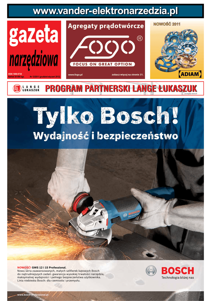 www.vander-elektronarzedzia.pl ISSN 1898-973X Nakład 20 000 egz. Nr 12/2011 (grudzień-styczeń 2012) NOWOŚĆ! GWS 12 i 15 Professional. Nowa seria zaawansowanych, małych szlifierek kątowych Bosch do najtrudniejszych zadań: gwarancja wysokiej trwałości narzędzia, maksymalnej wydajności i pełnego bezpieczeństwa użytkownika. Linia niebieska Bosch: dla rzemiosła i przemysłu. www.bosch-professional.pl www.bosch-professional.pl Zapewnia ciągle dostarczanie ciepła do 6 godzin Schowek na akumulator. Teraz współpracuje także z akumulatorem 3,0 Ah (akumulator dostępny oddzielnie) Wspólpracuje z akumulatorami 1,5 i 3,0 Ah M12 Redlithium-ion Odporna na wodę i wiatr. Zapewnia komfort i trwałość w trudnycjh warunkach. 4 wydarzenia GAZETA NARZĘDZIOWA | GRUDZIEŃ-STYCZEŃ 2012 Internationale Eisenwarenmesse 2012 W marcu 2012 r. odbędzie się kolejna edycja Internationale Eisenwarenmesse - najważniejszych targów branży narzędziowej i DIY. 24 listopada br. w hotelu Dorint w Kolonii odbyła się konferencja prasowa, podczas której organizatorzy imprezy przekazali mediom najważniejsze informacje dotyczące przyszłorocznej wystawy. T argi w Kolonii to firma z 80-letnią historią, a Internationale Eisenwarenmesse od 50 lat są jednym z niekwestionowanych filarów tej instytucji i jedną z najważniejszych imprez w jej kalendarium targowym. Przygotowania do przyszłorocznej imprezy rozpoczęły się w 2010 r. Jak powiedziała Katharina C. Hamma - CEO Targów w Kolonii - podczas listopadowej konferencji prasowej, przez ostatnie dwa lata wiele osób dokładało wszelkich starań, aby zaktualizować formułę tego spotkania, dzięki czemu Eisenwarenmesse ma szansę stać się najważniejszym wydarzeniem branżowym w 2012 r. – Mamy nadzieję, że droga rozwoju, którą wybraliśmy prawie dwa lata temu, okaże się słuszna – dodała. Szefowa Kolnmesse zwróciła uwagę na fakt, że impreza ta – tak mocno zakorzeniona w historii – nie pozostaje niezmienna. – Przeciwnie, cały czas adaptujemy ją na potrzeby rynku i panujących okoliczności, rozwijamy i przekształcamy, aby mogła pełnić funkcję nowoczesnej i ponadczasowej platformy komunikacyjnej dla przemysłu i handlu. Przyszłoroczne targi nie będą jedynie wystawą produktów. W 2012 r. Internationale Eisenwarenmesse zaprezentują się jako nowoczesne przedsiębiorstwo, które swoją ofertę kieruje do starannie dobranych grup odbiorców, potwierdzając tym samym swoją pozycję lidera w branży – podkreśliła Katharina C. Hamma. Organizatorzy spodziewają się ponad 2600 wystawców z 50 krajów. – Ponad 80 proc. firm, które zaprezentują swoje produkty podczas wystawy, przyjedzie do Kolonii spoza Niemiec. Te liczby pokazują, jak międzynarodowy charakter mają marcowe targi – stwierdziła Katharina C. Hamma. – Najwięcej firm przyjedzie do Kolonii z Włoch, Wielkiej Brytanii, Hiszponi i Francji. Licznie reprezentowane będą także Chiny, Taiwan, Indie oraz Stany Zjednoczone Ameryki. Wystawa zajmie 142 tys. m kw. powierzchni i obejmie swoim zasięgiem cztery kategorie produktów przeznaczonych dla przemysłu, rzemiosła i rynku DIY: narzędzia, mocowania, akcesoria meblowe oraz ar- Od lewej: Dr Peter Wüst - dyrektor zarządzający BHB, John W. Herbert - sekretarz generalny EDRA, Rainer Langelüddecke - dyrektor zarządzający FWI, Katharina C. Hamma - CEO Koelnmesse GmbH, J. Wolfgang Kirchhoff - przewodniczący komitetu doradczego INTERNATIONALE EISENWARENMESSE, Metin Ergül - wiceprezes ds. targów Koelnmesse GmbH, Kurt Radermacher - dyrektor zarządzający FDM, Thomas Dammann - dyrektor naczelny ZHH tykuły służące do usprawnienia technicznego i renowacji domów, mieszkań itd. Dzięki bardzo przejrzystemu i jasnemu układowi stoisk zwiedzający będą mogli bardzo szybko odnaleźć interesujące ich sektory. Najszerzej reprezentowaną kategorią produktową przyszłorocznych targów będą ponownie narzędzia. Ponad 1500 firm zaprezentuje szeroką gamę narzędzi ręcznych, elektronarzędzi oraz akcesoriów (hale 1, 2, 3, 4.1, 10.1 i 10.2). W halach 1-3 można będzie również znaleźć tego typu produkty oferowane przez azjatyckich dostawców. Stoiska w halach 4.1 i 4.2 zajmie 500 wystawców oferujących elementy wyposażenia warsztatów i fabryk oraz artykuły BHP. Ofertę zamocowań zaprezentuje 400 dostawców w halach 5.1 i 5.2. Akcesoria meblowe oraz artykuły służące do usprawnienia technicznego i renowacji domów zostaną zgromadzone w hali 5.1, gdzie zwiedzający znajdą ofertę około 200 przedsiębiorstw. – Goście będą mogli zapoznać się z wieloma nowymi produktami i aktualnymi trendami rynkowymi – poinformowała Katharina C. Hamma. – Jednym z nich jest zapewnienie klientom prostoty obsługi narzędzi, która ułatwia wykonywanie pracy i ekonomizuje ją. Ważnym trendem w obrębie maszyn i narzędzi przeznaczonych dla drobnych rzemieślników i użytkowników DIY jest zapewnienie im jak największej uniwersalności. Tworzenie produktów użytecznych dla szerszego kręgu odbiorców to podstawowy cel wielu producentów, którzy ciągle szukają nowych rozwiązań i udoskonalają swoje wyroby, aby mogły spełnić ich oczekiwania. Aby skierować uwagę szerszego grona odbiorców m.in. na tego typu innowacyjne produkty, podczas wystawy zostaną przyznane po raz pierwszy nagrody EISEN. Nagrody za innowacyjność w kategoriach narzędzi, dostawców przemysłowywch oraz zamocowań przyznają organizatorzy wraz ze Stowarzyszeniem Przemysłu i Handlu (ZHH). Przyznana zostanie również nagroda, która uhonoruje przedsiębiorstwa uwzględniające w swoich działaniach społeczną odpowiedzialność biznesu i dbałość o środowisko naturalne. Niezależne grono ekspertów zadecyduje o przyznaniu poszczególnych nagród, uwzględniając gospodarcze, środowiskowe i społeczne uwarunkowania przedsiębiorstw, które wezmą udział w konkursie. Nagrody zostaną wręczone podczas ga