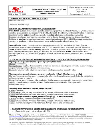 Zał. nr 4 do PS. 04.01 SPECYFIKACJA / SPECIFICATION Barszcz /Beetroot soup Pastella MV401 Data wydania/issue date: 15.02.2016 Wydanie 7 Strona/page 1 z/of 5 1.NAZWA PRODUKTU/PRODUCT NAME Barszcz instant Beetroot instant soup 2.LISTA SKŁADNIKÓW/LIST OF INGREDIENTS Składniki: cukier, koncentrat buraka czerwonego (24%), maltodekstryna, sól, wzmacniacze smaku: glutaminian monosodowy i E 635, ekstrakt drożdżowy, hydrolizat białka roślinnego (zawiera białko sojowe), cebula, marchew, seler, glukoza, pietruszka, regulator kwasowości: kwas cytrynowy, częściowo utwardzony tłuszcz palmowy, tłuszcz drobiowy, laktoza (z mleka), aromaty, substancje przeciwzbrylające: E341 i E551, pieprz, naturalne wyciągi z: kurkumy, liścia laurowego, pora, gałki muszkatołowej, papryki. Ingredients: sugar , powdered beetroot concentrate (24%), maltodextrin, salt, flavour enhancers: monosodium glutamate and E 635, hydrogenated vegetable protein (contains soya protein), onion, carrot, celery, glucose, parsley, yeast extract, acidity regulator: citric acid, partly hydrogenated palm fat, chicken fat, lactose (from milk), flavourings, anticaking agents: E 341 and E551, pepper, natural extracts: curcuma, bay leaf, leek, nutmeg, paprika. 3. CHARAKTERYSTYKA ORGANOLEPTYCZNA /ORGANOLEPTIC REQUIREMENTS Wymagania organoleptyczne przed przyrządzeniem: Barwa: buraczana, Konsystencja: sypka, dopuszczalne nietrwałe zbrylenia wynikające z wsadu surowcowego, rozprowadzające się podczas przyrządzania, Zapach: właściwy dla użytych surowców, niedopuszczalne zapachy obce Wymagania organoleptyczne po przyrządzeniu (12g/180ml gorącej wody): Barwa: buraczana, charakterystyczna dla użytych składników, odpowiednia dla produktu deklarowanego w nazwie Zapach: charakterystyczny dla produktu deklarowanego w nazwie, bez obcych zapachów, Smak: charakterystyczny dla smaku deklarowanego w nazwie. Obcy posmak niedopuszczalny. Sensory requirements before preparation: Colour: reddish, Consistency: free flowing powder with no lumps, which are hard to remove Odour: characteristic for used materials, foreign odours are not allowed Sensory requirements after preparation (12g/180ml hot water): Colour: reddish, characteristic for used materials, Odour: characteristic for used materials, foreign odours are not allowed, Taste: characteristic for used materials, foreign tastes are not allowed 4. PARAMETRY FIZYKO-CHEMICZNE/PHYSICO-CHEMICAL REQUIREMENTS Zawartość wody, nie większa niż 6% Maspex GMW Sp. z o.o.S.K.A., ul. Chopina 10, 34-100 Wadowice, Poland tel. +48 33/873 19 24, fax. +48 33/ 873 83 51, www.maspex.com.pl Powyższe dane zostały sporządzone na podstawie zdobytych doświadczeń oraz dokumentów będących do naszej dyspozycji. Nie stanowią one jednak żadnej gwarancji w sensie prawnym. W przypadku wykorzystania produktu poza granicami Rzeczpospolitej Polskiej należy stosować się do przepisów obowiązujących w danym kraju. The information given in this publication is based on our current knowledge , experience and available documents. It does however not constitute a guarantee in the legal sense You must comply with applicable laws and regulations for intended use of the product. SPECYFIKACJA / SPECIFICATION Barszcz /Beetroot soup Pastella MV401 Zał. nr 4 do PS. 04.01 Data wydania/issue date: 15.02.2016 Wydanie 7 Strona/page 2 z/of 5 Zawartość metali szkodliwych - użyte surowce spełniają wymóg: -Rozporządzenia Komisji (WE) nr 1881/2006 z dnia 19 grudnia 2006r. ustalającego najwyższe dopuszczalne poziomy niektórych zanieczyszczeń w środkach spożywczych - Rozporządzenia Komisji (UE) nr 231/2012 z dnia 9 marca 2012r. ustanawiające specyfikacje dla dodatków do żywności wymienionych w załącznikach II i III do rozporządzenia (WE) nr 1333/2008 Parlamentu Europejskiego i Rady Moisture content , no more than 6% Heavy metal content - used raw materials meet requirements of: - Commission Regulation (EC) No 1881/2006 of 19 December 2006 setting maximum levels for certain contaminants in foodstuffs - Commission Regulation ( EU) no 231/2012 of 9 March 2012 laying down specifications for food additives listed in Annexes II and III to Regulation (EC) no 1333/2008 of the European Parliament and of the Council 5. PARAMETRY MIKROBIOLOGICZNE /MICROBIOLOGICAL REQUIREMENTS Escherichia coli Salmonella Staphylococcus aureus Pleśnie nieobecna w 1 g nieobecna w 25g <10 w 1g <10 3 w 1g Escherichia coli Staphylococcus aureus Salmonella Mould negative in 1g <10 in 1g negative in 25g < 10 3 in 1g 6. WARUNKI I OKRES PRZECHOWYWANIA/STORAGE CONDITIONS AND SHELF LIFE Należy przechowywać w temperaturze do 25 0C, w pomieszczeniach o wilgotności względnej powietrza nie przekraczającej 75%. Okres przechowywania – 9 miesięcy od daty produkcji At ambient temperature max 250C in original closed packaging (RH < 75%). Storage area has to be free from off-odours. Shelf life-9 months since the production day in above mentioned storage conditions 7. OCENA OBECNOŚCI ALERGENÓW / ALLERGENS CONTROL Nr. ALERGENY1/ ALLERGENS1 OBECNE/ NIEOBECNE/ UWAGI/ PRESENT2 ABSENT2 COMMENTS 1 Zboża zawierające gluten (tj. pszenica, Możliwe żyto, jęczmień, owies zwyczajny, zanieczyszczenia pszenica oplewiona, kamut lub ich + krzyżowe / szczepy hybrydowe) i produkty Cross pochodne contamination Maspex GMW Sp. z o.o.S.K.A., ul. Chopina 10, 34-100 Wadowice, Poland tel. +48 33/873 19 24, fax. +48 33/ 873 83 51, www.maspex.com.pl Powyższe dane zostały sporządzone na podstawie zdobytych doświadczeń oraz dokumentów będących do naszej dyspozycji. Nie stanowią one jednak żadnej gwarancji w sensie prawnym. W przypadku wykorzystania produktu poza granicami Rzeczpospolitej Polskiej należy stosować się do przepisów obowiązujących w danym kraju. The information given in this publication is based on our current knowledge , experience and available documents. It does however not constitute a guarantee in the legal sense You must compl