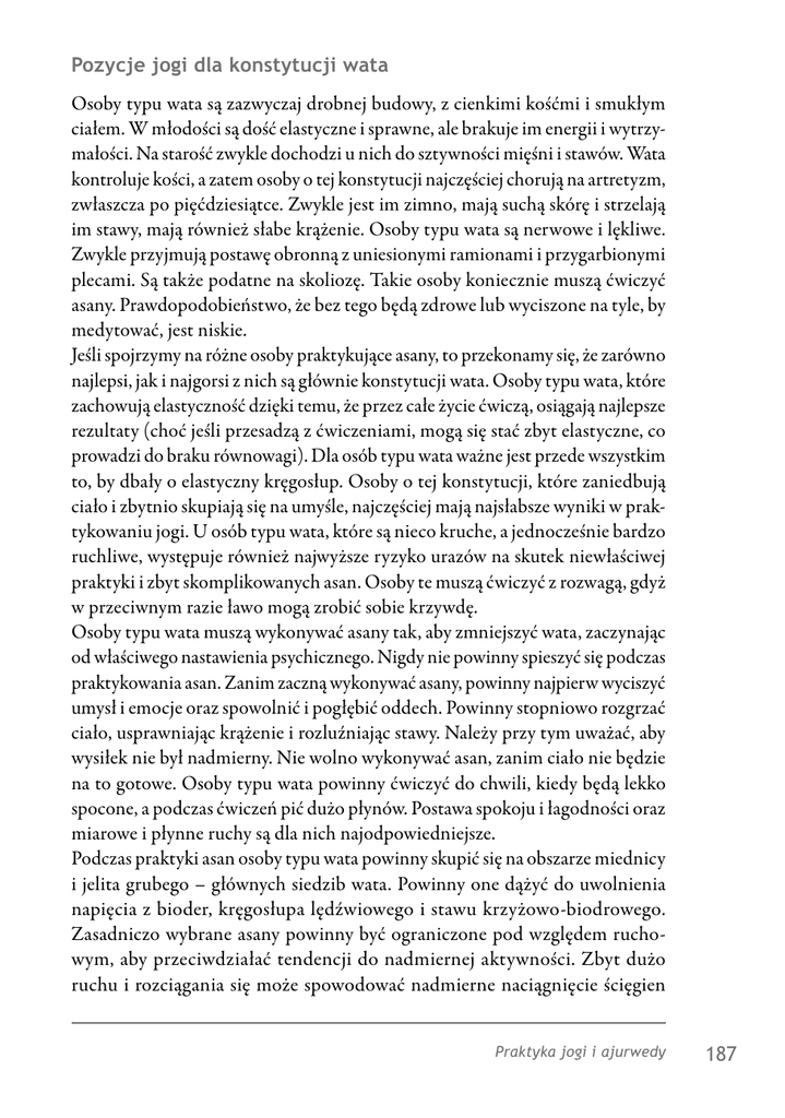 Pozycje jogi dla konstytucji wata Osoby typu wata są zazwyczaj drobnej budowy, z cienkimi kośćmi i smukłym ciałem. W młodości są dość elastyczne i sprawne, ale brakuje im energii i wytrzymałości. Na starość zwykle dochodzi u nich do sztywności mięśni i stawów. Wata kontroluje kości, a zatem osoby o tej konstytucji najczęściej chorują na artretyzm, zwłaszcza po pięćdziesiątce. Zwykle jest im zimno, mają suchą skórę i strzelają im stawy, mają również słabe krążenie. Osoby typu wata są nerwowe i lękliwe. Zwykle przyjmują postawę obronną z uniesionymi ramionami i przygarbionymi plecami. Są także podatne na skoliozę. Takie osoby koniecznie muszą ćwiczyć asany. Prawdopodobieństwo, że bez tego będą zdrowe lub wyciszone na tyle, by medytować, jest niskie. Jeśli spojrzymy na różne osoby praktykujące asany, to przekonamy się, że zarówno najlepsi, jak i najgorsi z nich są głównie konstytucji wata. Osoby typu wata, które zachowują elastyczność dzięki temu, że przez całe życie ćwiczą, osiągają najlepsze rezultaty (choć jeśli przesadzą z ćwiczeniami, mogą się stać zbyt elastyczne, co prowadzi do braku równowagi). Dla osób typu wata ważne jest przede wszystkim to, by dbały o elastyczny kręgosłup. Osoby o tej konstytucji, które zaniedbują ciało i zbytnio skupiają się na umyśle, najczęściej mają najsłabsze wyniki w praktykowaniu jogi. U osób typu wata, które są nieco kruche, a jednocześnie bardzo ruchliwe, występuje również najwyższe ryzyko urazów na skutek niewłaściwej praktyki i zbyt skomplikowanych asan. Osoby te muszą ćwiczyć z rozwagą, gdyż w przeciwnym razie ławo mogą zrobić sobie krzywdę. Osoby typu wata muszą wykonywać asany tak, aby zmniejszyć wata, zaczynając od właściwego nastawienia psychicznego. Nigdy nie powinny spieszyć się podczas praktykowania asan. Zanim zaczną wykonywać asany, powinny najpierw wyciszyć umysł i emocje oraz spowolnić i pogłębić oddech. Powinny stopniowo rozgrzać ciało, usprawniając krążenie i rozluźniając stawy. Należy przy tym uważać, aby wysiłek nie był nadmierny. Nie wolno wykonywać asan, zanim ciało nie będzie na to gotowe. Osoby typu wata powinny ćwiczyć do chwili, kiedy będą lekko spocone, a podczas ćwiczeń pić dużo płynów. Postawa spokoju i łagodności oraz miarowe i płynne ruchy są dla nich najodpowiedniejsze. Podczas praktyki asan osoby typu wata powinny skupić się na obszarze miednicy i jelita grubego – głównych siedzib wata. Powinny one dążyć do uwolnienia napięcia z bioder, kręgosłupa lędźwiowego i stawu krzyżowo-biodrowego. Zasadniczo wybrane asany powinny być ograniczone pod względem ruchowym, aby przeciwdziałać tendencji do nadmiernej aktywności. Zbyt dużo ruchu i rozciągania się może spowodować nadmierne naciągnięcie ścięgien Praktyka jogi i ajurwedy 187 i osłabienie. Ponieważ wata prowadzi do sztywności, to praktyka asan powinna mieć na celu zwiększenie ruchu i dopływu prany do zesztywniałych miejsc, ale w sposób stopniowy i równomierny. Dla osób typu wata dobre są pozycje siedzące, zwłaszcza te, które wzmacniają podbrzusze i utrzymują je w bezruchu, na przykład siddhasana, padmasana (lotos) i wajrasana. Dzięki pozycjom tym można się wyciszyć, zwiększyć poczucie osadzenia i kontrolować apana waju. Ponieważ wata ma tendencję do tego, by gromadzić się w kręgosłupie i usztywniać go, osoby o tej konstytucji powinny dbać o giętki kręgosłup, praktykując pozycje, w których kręgosłup wygina się w różne strony. Doskonałe są skręty kręgosłupa, takie jak w pozycji matsjendrasana, ponieważ usuwają wata z układu nerwowego. Skręty są jednak wskazane tylko wtedy, gdy oddech jest pełny – jeśli jest on choćby odrobinę spłycony w wyniku częściowego zablokowania płuc, które może nastąpić podczas skrętu, to wata rośnie w szybkim tempie. Skłon w przód przynosi natychmiastową ulgę w przypadku nadmiaru wata oraz wywołuje spokój i bezruch. Pozycja ta doskonale nadaje się do uwalniania wata z pleców, gdzie gromadzi się ona w postaci sztywności i napięcia. Usuwa także nadmiar wata z ciała poprzez stawy. Jeśli jednak nie połączy się tej pozycji z wygięciami do tyłu, to nie uda się usunąć wata w całości. Wygięcia do tyłu doskonale nadają się do łagodzenia wata, ale należy je wykonywać delikatnie i powoli, aby były skuteczne. Wata najczęściej powoduje kifozę i skrzywienie barków. Jeśli pracuje się z tego rodzaju sztywnością zbyt agresywnie, to możemy spowodować ból lub uraz. Silne wygięcia do tyłu pobudzają układ sympatyczny – reakcję walki lub ucieczki w ciele – a zatem mają działanie „rozszerzające”. Jeśli wykonujemy je z poczuciem ugruntowania i umiarem, to wzmacniają one u osób wata poczucie ześrodkowania i mają łagodne działanie rozgrzewające, wzmacniające apanę i okrężnicę. Łagodne wygięcia w tył, jak u kobry, są pod tym względem najbezpieczniejsze. Bardziej skomplikowane wygięcia w tył można wykonywać dopiero wtedy, gdy zyskamy biegłość w tych ćwiczeniach. Pozycje stojące, w których kładzie się nacisk na siłę, spokój i stałość, są bardzo zalecane dla wata – zwłaszcza te, które wyrabiają stabilność i równowagę jak u drzewa (wrikszasana). Aby je docenić, osoby typu wata muszą jednak najpierw osiągnąć cierpliwość i koncentrację. Zasadniczo dla osób typu wata wskazane są łagodne ćwiczenia jogi, które ich nie wyczerpią. Ich wysiłek powinien być umiarkowany. Po asanach wymagających ruchu osoby te powinny przez dłuższą chwilę wykonywać asany w pozycji 188 Joga i ajurweda siedzącej. Aby utrzymać wata pod kontrolą, podczas przyjmowania tych postaw należy praktykować pranajamę i medytację. Po ćwiczeniu asan osoby typu wata powinny odpocząć i zrelaksować się w pozycji martwego ciała. Nie należy