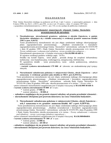 Sieciechów, 2015-07-22. GN. 6840. 3 .2015 OGŁOSZENIE Wójt Gminy Sieciechów działając na podstawie art.30 ust. 2 pkt 3 ustawy o samorządzie gminnym z dnia 8 marca 1990r. (t.j. Dz.U. z 2013 r, poz.594, ze zm.) i art. 35 ustawy z dnia 21 sierpnia 1997 roku o gospodarce nieruchomościami (t.j. z 2014 r. poz. 518, ze zm.) podaje do publicznej wiadomości Wykaz nieruchomości stanowiących własność Gminy Sieciechów przeznaczonych do sprzedaży 1. Niezabudowana nieruchomość gruntowa położona w obrębie Zajezierze, w gminie Sieciechów składająca się z działki oznaczonej w ewidencji gruntów numerem działki 330/2 o pow. 0,46 ha Teren przedmiotowej nieruchomości nie jest objęty ustaleniami żadnego obowiązującego planu zagospodarowania przestrzennego. „Studium uwarunkowań i kierunków zagospodarowania przestrzennego Gminy Sieciechów" zatwierdzone uchwałą Nr XVI/91/99 z dnia 28 grudnia 1999 r Rady Gminy Sieciechów określa przeznaczenie w/w terenu :” Tereny zabudowane i wskazane pod zabudowę –tereny produkcyjno-usługowe „. Nieruchomość ujawniona jest w księdze wieczystej nr RA1K/000 48 668 /6 . W rejestrze ewidencji gruntów widnieje zapis – R IVa . Działka ma kształt trapezu, teren płaski , posiada dostęp do urządzeń infrastruktury technicznej : sieci kanalizacyjnej, wodociągowej, energetycznej, telefonicznej. W sąsiedztwie działki – teren przemysłowy, teren szkoły podstawowej, zabudowa jednorodzinna. - wartość rynkowa nieruchomości 175 000 zł (słownie: sto siedemdziesiąt pięć tysięcy złotych). 2. Nieruchomość zabudowana położona w miejscowości Głusiec, obręb Zajezierze – ark.4 oznaczona w ewidencji gruntów jako działka nr 502/1 pow.0,2934 ha. Teren przedmiotowej nieruchomości nie jest objęty ustaleniami żadnego obowiązującego planu zagospodarowania przestrzennego. „Studium uwarunkowań i kierunków zagospodarowania przestrzennego Gminy Sieciechów" zatwierdzone uchwałą Rady Gminy Sieciechów Nr XVI/91/99 z dnia 28 grudnia 1999 roku określa przeznaczenie w/w terenu :” Tereny rolne”. - prawo własności nieruchomości uregulowane jest w księdze wieczystej nr RA1K/000 48 668 /6 - wartość rynkowa nieruchomości 55 800 zł w tym : * wartość gruntu ; 17 800 zł, * wartość zabudowy ; 38 000 zł - zabudowa znajdująca się na gruncie stanowi odrębny od gruntu przedmiot własności . - nieruchomość obciążona jest prawem dzierżawy na rzecz właściciela budynków . 3. Nieruchomość zabudowana położona w miejscowości Głusiec, obręb Zajezierze – ark.3 oznaczona w ew. gruntów numerem działki 467 o pow. 0,2079 ha. Teren przedmiotowej nieruchomości nie jest objęty ustaleniami żadnego obowiązującego planu zagospodarowania przestrzennego. „Studium uwarunkowań i kierunków zagospodarowania przestrzennego Gminy Sieciechów" zatwierdzone uchwałą Nr XVI/91/99 z dnia 28 grudnia 1999 r Rady Gminy Sieciechów określa przeznaczenie w/w terenu : Tereny zabudowane i wskazane pod zabudowę – tereny z przewagą zabudowy zagrodowej „ - prawo własności nieruchomości uregulowane jest w księdze wieczystej RA1K/00048668/6 - wartość rynkowa nieruchomości 79 500 zł w tym : * wartość gruntu ; 12 800 zł, * wartość zabudowy ; 68 100 zł - zabudowa znajdująca się na gruncie stanowi odrębny od gruntu przedmiot własności . - nieruchomość obciążona jest prawem dzierżawy na rzecz właściciela budynków . Zgodnie z art.. 34 ust. 1 pkt. 1 i pkt. 2 ustawy z dnia 21 sierpnia 1997r o gospodarce nieruchomościami., pierwszeństwo w nabyciu przedmiotowych nieruchomości przysługuje osobie, która spełnia jeden z następujących warunków: 1.przysługuje jej roszczenie o nabycie nieruchomości z mocy niniejszej ustawy lub odrębnych przepisów, jeżeli złoży wniosek o nabycie w terminie do 03 września 2015 r. 2.jest poprzednim właścicielem zbywanej nieruchomości pozbawionym prawa własności tej nieruchomości przed 5 grudnia 1990 roku, albo jego spadkobiercą, jeżeli złoży wniosek o nabycie w terminie do 03 września2015 r. Powyższy wykaz zostaje wywieszony na tablicach ogłoszeń : Urzędu Gminy w Sieciechowie na okres od dnia 22.07.2015 r do 12.08.2015 r oraz umieszczony na stronie internetowej www.sieciechow.pl Sieciechów, dnia 22. 07. 2015 r Wójt Gminy -//- Marian Zbigniew Czerski