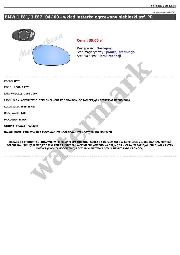 Informacje o produkcie Utworzono 02-03-2017 BMW 1 E81/ 1 E87 `04-`09 - wkład lusterka ogrzewany niebieski asf. PR Cena : 39,00 zł MARKA: BMW MODEL: 1 E81/ 1 E87 LATA PRODUKCJI: 2004-2009 er m ar k Dostępność : Dostępny Stan magazynowy : poniżej średniego Średnia ocena : brak recenzji PROFIL SZKŁA: ASFERYCZNE (DZIELONE) - OBRAZ ODDALONY, OGRANICZAJĄCY EFEKT MARTWEGO POLA KOLOR SZKŁA: NIEBIESKIE OGRZEWANIE: TAK MOCOWANIE: TAK STRONA: PRAWA - PASAŻER UWAGI: KOMPLETNY WKŁAD Z MOCOWANIEM I OGRZEWANIEM - GOTOWY DO MONTAŻU w at WKŁADY SĄ PRODUKTAMI NOWYMI, W FIRMOWYM OPAKOWANIU. SZKŁA SĄ OGRZEWANE I W KOMPLECIE Z MOCOWANIEM. MONTAŻ POLEGA NA USUNIĘCIU SWOJEGO WKLADU Z LUSTERKA I WCIŚNIĘCIU NOWEGO NA OBEJMĘ SILNICZKA. W RAZIE JAKICHKOLWIEK PYTAŃ DOTYCZĄCYCH ZAMOCOWANIA, BĄDŹ WYMIANY WKŁADÓW SŁUŻYMY RADĄ I POMOCĄ.