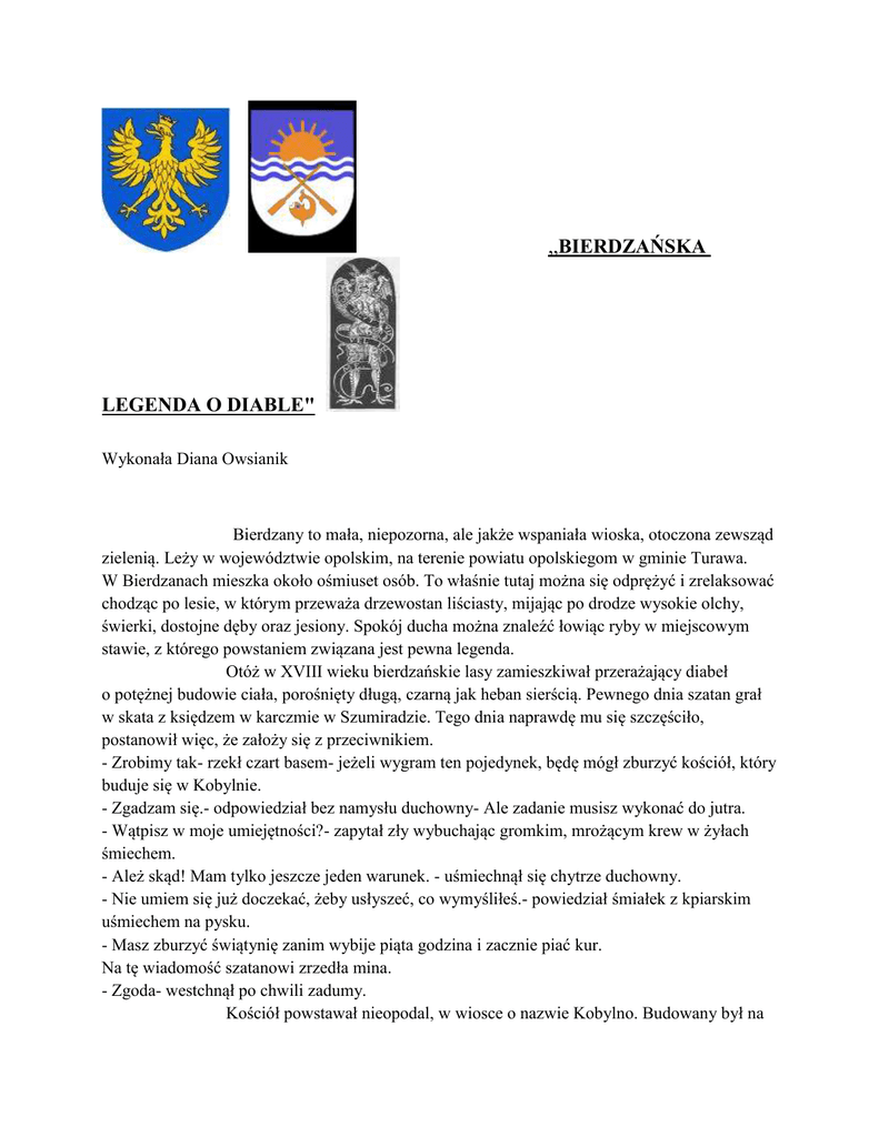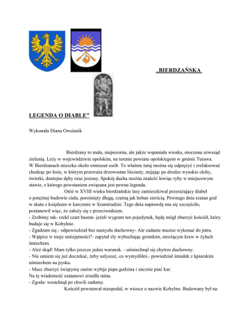 ,,BIERDZAŃSKA LEGENDA O DIABLE" Wykonała Diana Owsianik Bierdzany to mała, niepozorna, ale jakże wspaniała wioska, otoczona zewsząd zielenią. Leży w województwie opolskim, na terenie powiatu opolskiegom w gminie Turawa. W Bierdzanach mieszka około ośmiuset osób. To właśnie tutaj można się odprężyć i zrelaksować chodząc po lesie, w którym przeważa drzewostan liściasty, mijając po drodze wysokie olchy, świerki, dostojne dęby oraz jesiony. Spokój ducha można znaleźć łowiąc ryby w miejscowym stawie, z którego powstaniem związana jest pewna legenda. Otóż w XVIII wieku bierdzańskie lasy zamieszkiwał przerażający diabeł o potężnej budowie ciała, porośnięty długą, czarną jak heban sierścią. Pewnego dnia szatan grał w skata z księdzem w karczmie w Szumiradzie. Tego dnia naprawdę mu się szczęściło, postanowił więc, że założy się z przeciwnikiem. - Zrobimy tak- rzekł czart basem- jeżeli wygram ten pojedynek, będę mógł zburzyć kościół, który buduje się w Kobylnie. - Zgadzam się.- odpowiedział bez namysłu duchowny- Ale zadanie musisz wykonać do jutra. - Wątpisz w moje umiejętności?- zapytał zły wybuchając gromkim, mrożącym krew w żyłach śmiechem. - Ależ skąd! Mam tylko jeszcze jeden warunek. - uśmiechnął się chytrze duchowny. - Nie umiem się już doczekać, żeby usłyszeć, co wymyśliłeś.- powiedział śmiałek z kpiarskim uśmiechem na pysku. - Masz zburzyć świątynię zanim wybije piąta godzina i zacznie piać kur. Na tę wiadomość szatanowi zrzedła mina. - Zgoda- westchnął po chwili zadumy. Kościół powstawał nieopodal, w wiosce o nazwie Kobylno. Budowany był na zlecenie zamożnego posiadacza okolicznych ziem, hrabiego Franciszka Adama von Gaschina. Miał to być prezent dla jego bardzo pobożnej żony- Anny Barbary. Hrabinę prześladował pech, nieszczęście goniło nieszczęście. Jedynie w modlitwie odnajdywała ukojenie. Miała wielki plany co do tego kościoła. Chciała, by krzyż u zwieńczenia budowli był widoczny z jej turawskiej posiadłości. Ludność Kobylna także od dawna marzyła o wybudowaniu kościoła. Na nieszczęście bies wygrał pojedynek. Jak powiedział, tak też zrobił. Chwycił w swe kosmate łapy ogromny głaz i począł go nieść polnymi dróżkami,zmierzając ku wznoszącej się budowli. Pamiętając o warunku postawionym przez duchownego, gnał co tchu. Czart był jednak zmęczony całonocną grą w karty i przechodząc przez Bierdzany dwa razy się zatrzymał, aby odpocząć i nabrać sił do dalszej drogi. W miejscach, gdzie przerwał swą wędrówkę powstały dwa stawy, w tym jeden obok drewnianego kościoła pod wezwaniem świętej Jadwigii Śląskiej. Pod koniec wędrówki diabeł był okrutnie zmęczony i zamiast nieść, pchał głaz żłobiąc szerokie na dwa metry koryto. Nagle wybiła piąta godzina, zaczął piać kur, a złego opuściły nieczyste moce. Rzucony z impetem kamień toczył się jeszcze parę metrów ryjąc niewielki rów. Właśnie dlatego rzeka kończy się małym strumieniem. Kościół w Kobylnie został uratowany, a prace nad nim można było spokojnie kontynuować. Bryła skalna spoczywa tam po dziś dzień, zapadając coraz bardziej w głąb bagiennego torfowego olsu, wśród krzaków jeżyn i malin. Podmokły grunt powoli zagarnia świadka pojedynku dobra ze złem. Ale pamięć o nim przetrwa w legendzie. Odtąd będzie ona opowiadana z pokolenia na pokolenie, mieszkańcom Bierdzan, małej wioski, której chlubą jest powstały w 1711 roku drewniany kościół. Góruje nad stawem, pamiątką niecnych zamiarów bierdzańskiego biesa. Źródła informacji: Do pracy zostały wykorzystane wiadomości starszych mieszkańców Bierdzan oraz niektóre informacje z fragmentu reportażu, umieszczonego w książce ,,Sekrety i cienie" autorstwa Agnieszki Malik i Jana Płaskonia. Zdjęcia przedstawiające diabli kamień, stawy bierdzańskie, Jaźwinkę oraz kościół w Kobylnie zostały wykonane aparatem amatorskim.