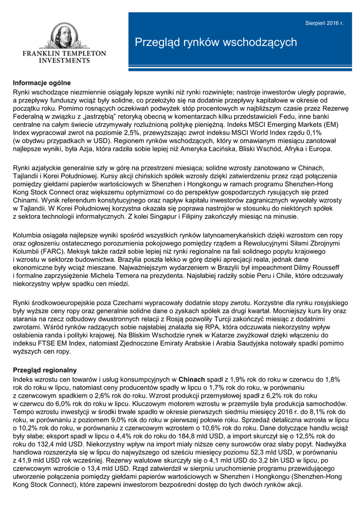 Sierpień 2016 r. Przegląd rynków wschodzących Informacje ogólne Rynki wschodzące niezmiennie osiągały lepsze wyniki niż rynki rozwinięte; nastroje inwestorów uległy poprawie, a przepływy funduszy wciąż były solidne, co przełożyło się na dodatnie przepływy kapitałowe w okresie od początku roku. Pomimo rosnących oczekiwań podwyżek stóp procentowych w najbliższym czasie przez Rezerwę Federalną w związku z „jastrzębią” retoryką obecną w komentarzach kilku przedstawicieli Fedu, inne banki centralne na całym świecie utrzymywały rozluźnioną politykę pieniężną. Indeks MSCI Emerging Markets (EM) Index wypracował zwrot na poziomie 2,5%, przewyższając zwrot indeksu MSCI World Index rzędu 0,1% (w obydwu przypadkach w USD). Regionem rynków wschodzących, który w omawianym miesiącu zanotował najlepsze wyniki, była Azja, która radziła sobie lepiej niż Ameryka Łacińska, Bliski Wschód, Afryka i Europa. Rynki azjatyckie generalnie szły w górę na przestrzeni miesiąca; solidne wzrosty zanotowano w Chinach, Tajlandii i Korei Południowej. Kursy akcji chińskich spółek wzrosły dzięki zatwierdzeniu przez rząd połączenia pomiędzy giełdami papierów wartościowych w Shenzhen i Hongkongu w ramach programu Shenzhen-Hong Kong Stock Connect oraz większemu optymizmowi co do perspektyw gospodarczych rysujących się przed Chinami. Wynik referendum konstytucyjnego oraz napływ kapitału inwestorów zagranicznych wywołały wzrosty w Tajlandii. W Korei Południowej korzystna okazała się poprawa nastrojów w stosunku do niektórych spółek z sektora technologii informatycznych. Z kolei Singapur i Filipiny zakończyły miesiąc na minusie. Kolumbia osiągała najlepsze wyniki spośród wszystkich rynków latynoamerykańskich dzięki wzrostom cen ropy oraz ogłoszeniu ostatecznego porozumienia pokojowego pomiędzy rządem a Rewolucyjnymi Siłami Zbrojnymi Kolumbii (FARC). Meksyk także radził sobie lepiej niż rynki regionalne na fali solidnego popytu krajowego i wzrostu w sektorze budownictwa. Brazylia poszła lekko w górę dzięki aprecjacji reala, jednak dane ekonomiczne były wciąż mieszane. Najważniejszym wydarzeniem w Brazylii był impeachment Dilmy Rousseff i formalne zaprzysiężenie Michela Temera na prezydenta. Najsłabiej radziły sobie Peru i Chile, które odczuwały niekorzystny wpływ spadku cen miedzi. Rynki środkowoeuropejskie poza Czechami wypracowały dodatnie stopy zwrotu. Korzystne dla rynku rosyjskiego były wyższe ceny ropy oraz generalnie solidne dane o zyskach spółek za drugi kwartał. Mocniejszy kurs liry oraz starania na rzecz odbudowy dwustronnych relacji z Rosją pozwoliły Turcji zakończyć miesiąc z dodatnimi zwrotami. Wśród rynków radzących sobie najsłabiej znalazła się RPA, która odczuwała niekorzystny wpływ osłabienia randa i polityki krajowej. Na Bliskim Wschodzie rynek w Katarze zwyżkował dzięki włączeniu do indeksu FTSE EM Index, natomiast Zjednoczone Emiraty Arabskie i Arabia Saudyjska notowały spadki pomimo wyższych cen ropy. Przegląd regionalny Indeks wzrostu cen towarów i usług konsumpcyjnych w Chinach spadł z 1,9% rok do roku w czerwcu do 1,8% rok do roku w lipcu, natomiast ceny producentów spadły w lipcu o 1,7% rok do roku, w porównaniu z czerwcowym spadkiem o 2,6% rok do roku. Wzrost produkcji przemysłowej spadł z 6,2% rok do roku w czerwcu do 6,0% rok do roku w lipcu. Kluczowym motorem wzrostu w przemyśle była produkcja samochodów. Tempo wzrostu inwestycji w środki trwałe spadło w okresie pierwszych siedmiu miesięcy 2016 r. do 8,1% rok do roku, w porównaniu z poziomem 9,0% rok do roku w pierwszej połowie roku. Sprzedaż detaliczna wzrosła w lipcu o 10,2% rok do roku, w porównaniu z czerwcowym wzrostem o 10,6% rok do roku. Dane dotyczące handlu wciąż były słabe; eksport spadł w lipcu o 4,4% rok do roku do 184,8 mld USD, a import skurczył się o 12,5% rok do roku do 132,4 mld USD. Niekorzystny wpływ na import miały niższe ceny surowców oraz słaby popyt. Nadwyżka handlowa rozszerzyła się w lipcu do najwyższego od sześciu miesięcy poziomu 52,3 mld USD, w porównaniu z 41,9 mld USD rok wcześniej. Rezerwy walutowe skurczyły się o 4,1 mld USD do 3,2 bln USD w lipcu, po czerwcowym wzroście o 13,4 mld USD. Rząd zatwierdził w sierpniu uruchomienie programu przewidującego utworzenie połączenia pomiędzy giełdami papierów wartościowych w Shenzhen i Hongkongu (Shenzhen-Hong Kong Stock Connect), które zapewni inwestorom bezpośredni dostęp do tych dwóch rynków akcji. Przegląd rynków wschodzących Bank centralny Korei Południowej utrzymał w sierpniu swoją referencyjną stopę procentową na rekordowo niskim poziomie 1,25% z myślą o zapewnieniu wsparcia dla ożywienia gospodarczego. Inflacja utrzymała się poniżej celu inflacyjnego na 2016 r. ustalonego przez bank centralny na poziomie 2%. Indeks wzrostu cen towarów i usług konsumpcyjnych poszedł w lipcu lekko w dół do 0,7% rok do roku, w porównaniu z 0,8% rok do roku w czerwcu, pod wpływem spadków cen żywności i transportu w porównaniu z rokiem ubiegłym. Eksport zanotował w lipcu nadspodziewanie duży spadek o 10,2% rok do roku do 41,0 mld USD; eksport kierowany na największy rynek eksportowy Korei Południowej, jakim są Chiny, spadł o 9,3% rok do roku, natomiast eksport do USA spadł o 14,3% rok do roku. Import także zanotował w lipcu dwucyfrowy spadek o 14,0% rok do roku do 33,3 mld USD, w porównaniu z czerwcowym spadkiem o 8,0% rok do roku. Nadwyżka handlowa rozszerzyła się w lipcu do 7,8 mld USD, w porównaniu z 7,1 mld USD w tym samym miesiącu w roku ubiegłym, jednak była niższa w porównaniu z nadwyżką na poziomie 11,5 mld USD zanotowaną w czerwcu. Stopa bezrobocia utrzymała się w lipcu na niezmienionym od czerwca poziomie 3,6%, nieznacznie niższym w porównaniu z 3,7% rok wcześniej. Bank Rezerw Indii utrzymał w sierpniu swoją kluczow