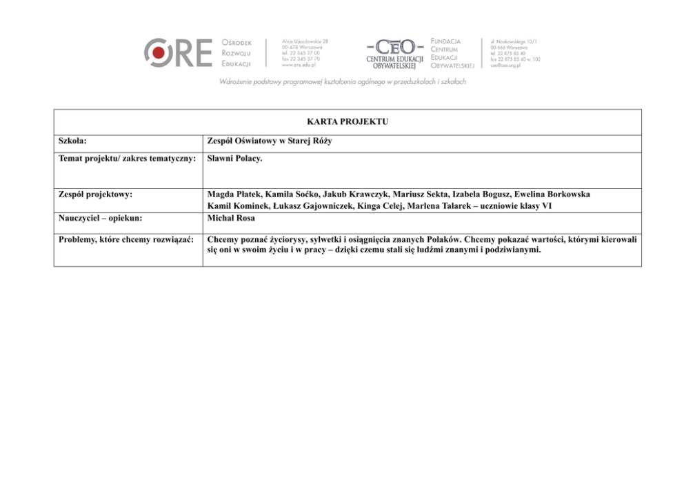 KARTA PROJEKTU Szkoła: Zespół Oświatowy w Starej Róży Temat