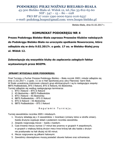 PODOKRĘG PIŁKI NOŻNEJ BIELSKO-BIAŁA 43-300 Bielsko-Biała ul. Widok 12, tel./fax 33-812-65-60 NIP : 547 – 15 – 80 – 028 PKO BP 27 1020 1390 0000 6302 0116 6537 e-mail: podokrę[email protected]; www.bozpn-bielsko.pl Bielsko-Biała, dnia 01.02.2017 r. KOMUNIKAT PODOKRĘGU NR 4 Prezes Podokręgu Bielsko-Biała zaprasza Prezesów Klubów należących do Podokręgu Bielsko-Biała na uroczyste spotkanie Noworoczne, które odbędzie się w dniu 9.02.2017r. o godz. 17 oo. w Bielsku-Białej przy ul. Widok 12. Zobowiązuje się wszystkie kluby do zapłacenia zaległych faktur wystawionych przez BOZPN. SPRAWY WYDZIAŁU GIER PODOKRĘGU: Finał Turnieju o Puchar Prezesa Podokręgu Bielsko – Biała rocznik 2005 i młodsi odbędzie się dnia 11.02.2017 r. o godz. 11 oo w Hali Sportowej przy ulicy Filarowej- Sarni Stok. W finale uczestniczą mistrzowie czterech grup eliminacyjnych i są to następujące zespoły: BBTS Podbeskidzie, BTS I Rekord, BTS II Rekord, KS Bestwinka. Turniej odbędzie się według następującego terminarza: 1. BTS I Rekord – BTS II Rekord 2. KS Bestwinka – BBTS Podbeskidzie 3. BTS I Rekord – KS Bestwinka 4. BBTS Podbeskidzie – BTS II Rekord 5. BTS II Rekord – KS Bestwinka 6. BBTS Podbeskidzie – BTS I Rekord Regulamin Turnieju. Turniej zawodników rocznika 2005 i młodszych. 1. Drużyny składają się z 4 zawodników + bramkarz (zmiany lotne w strefie zmian). Każda drużyna wypisuje skład z podaniem rocznika zawodnika. 2. Zespoły rozgrywają mecze – każdy z każdym. 3. Czas trwania meczu wynosi 17 minut bez przerwy w grupach 4 zespołowych, w grupach z większą ilością drużyn mecz trwa krócej tak aby każda z drużyn nie przebywała na hali dłużej niż 60 minut. 4. Mecze rozgrywane są piłkami halowymi. 5. Zawodnicy obowiązkowo muszą posiadać obuwie halowe oraz ochraniacze. 6. Kary indywidualne: 2 minuty oraz wykluczenie (za zawodnika wykluczonego wchodzi inny zawodnik z ławki). 7. Wznowienie gry przez bramkarza w dowolny sposób, rozpoczęcie gry z autu – zagranie nogą do partnera, wszystkie wznowienia z autu oraz rzuty wolne są rzutami pośrednimi, zakaz wślizgów, pozostałe przepisy gry obowiązują jak na boisku w tej grupie wiekowej. 8. W turnieju musi być wyłoniony mistrz na zasadach ogólnie obowiązujących: - największa ilość zdobytych punktów, - przy równej ilości pkt. bezpośredni pojedynek, - przy remisowym bezpośrednim pojedynku: lepsza różnica bramek, więcej strzelonych bramek, - ostatnim rozstrzygnięciem są rzuty karne wykonywane aż do skutku. 9. W sprawach spornych decyzje podejmuje sędzia zawodów. Podokręg Bielsko – Biała przyjmuje zgłoszenia na Kurs UEFA „C’’. Sprawy organizacyjne WG i D. 1. Są do pobrania terminarze rozgrywek: Klasa A Bielsko-Biała, Klasa B Bielsko – Biała, III Liga Liga Okręgowa A1 Junior Starszy, IV Liga Okręgowa A1 Junior Starszy. 2. Zobowiązujemy kluby do potwierdzenia względnie zgłoszenia drużyn do rozgrywek grup dziecięcych rozpoczynających się na wiosnę 2017 r. w Podokręgu Bielsko – Biała, dotyczy to przede wszystkim: Młodzików D1 – rocznik 2004 i młodsi, Młodzików Młodszych D2 – rocznik 2005 i młodsi. 3. Wydział Gier i Dyscypliny w sezonie wiosna 2017 będzie prowadził rozgrywki Żaków (rocznik 2008 i młodsi). Zgłoszenia telefoniczne chętnych drużyn do uczestnictwa w rozgrywkach będzie przyjmował członek WG i D kol. Artur Mazur – nr tel. 698 949 837. Zgłoszenia przyjmowane będą do 19 lutego 2017 r. Jest możliwość pisemnego zgłoszenia do Podokręgu Bielsko-Biała. Warunki oraz regulamin zostanie przedstawiony po zamknięciu listy zgłoszeń. Przewodniczący Wydziału Gier i Dyscypliny Paweł Lewkowicz