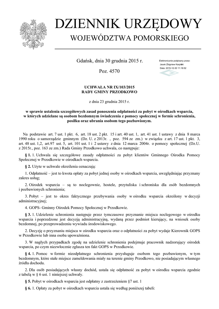 DZIENNIK URZĘDOWY WOJEWÓDZTWA POMORSKIEGO Gdańsk, dnia 30 grudnia 2015 r. Elektronicznie podpisany przez: Jacek Zbigniew Karpiński Poz. 4570 Data: 2015-12-30 11:18:52 UCHWAŁA NR IX/103/2015 RADY GMINY PRZODKOWO z dnia 23 grudnia 2015 r. w sprawie ustalenia szczegółowych zasad ponoszenia odpłatności za pobyt w ośrodkach wsparcia, w których udzielane są osobom bezdomnym świadczenia z pomocy społecznej w formie schronienia, posiłku oraz ubrania osobom tego pozbawionym. Na podstawie art. 7 ust. 1 pkt. 6, art. 18 ust. 2 pkt. 15 i art. 40 ust. 1, art. 41 ust. 1 ustawy z dnia 8 marca 1990 roku o samorządzie gminnym (Dz. U. z 2013r. , poz. 594 ze zm.) w związku z art. 17 ust. 1 pkt. 3, art. 48 ust. 1,2, art.97 ust. 5, art. 101 ust. 1 i 2 ustawy z dnia 12 marca 2004r. o pomocy społecznej (Dz.U. z 2015r., poz. 163 ze zm.) Rada Gminy Przodkowo uchwala, co następuje: § 1. 1. Uchwala się szczegółowe zasady odpłatności za pobyt klientów Gminnego Ośrodka Pomocy Społecznej w Przodkowie w ośrodkach wsparcia. § 2. Użyte w uchwale określenia oznaczają: 1. Odpłatność – jest to kwota opłaty za pobyt jednej osoby w ośrodkach wsparcia, uwzględniając przyznany zakres usług; 2. Ośrodek wsparcia – są to noclegownie, hostele, przytuliska i schroniska dla osób bezdomnych i pozbawionych schronienia; 3. Pobyt – jest to okres faktycznego przebywania osoby w ośrodku wsparcia określony w decyzji administracyjnej; 4. GOPS- Gminny Ośrodek Pomocy Społecznej w Przodkowie. § 3. 1. Udzielenie schronienia następuje przez tymczasowe przyznanie miejsca noclegowego w ośrodku wsparcia i poprzedzone jest decyzją administracyjną, wydaną przez podmiot kierujący, na wniosek osoby bezdomnej, po przeprowadzeniu wywiadu środowiskowego. 2. Decyzję o przyznaniu miejsca w ośrodku wsparcia oraz o odpłatności za pobyt wydaje Kierownik GOPS w Przodkowie lub inna osoba upoważniona. 3. W nagłych przypadkach zgodę na udzielenie schronienia podejmuje pracownik nadzorujący ośrodek wsparcia, po czym niezwłocznie zgłasza ten fakt GOPS w Przodkowie. § 4. 1. Pomoc w formie nieodpłatnego schronienia przysługuje osobom tego pozbawionym, w tym bezdomnym, które stałe miejsce zameldowania miały na terenie gminy Przodkowo, nie posiadającym własnego źródła dochodu. 2. Dla osób posiadających własny dochód, ustala się odpłatność za pobyt w ośrodku wsparcia zgodnie z tabelą w § 6 ust. 1 niniejszej uchwały. § 5. Pobyt w ośrodkach wsparcia jest odpłatny z zastrzeżeniem §7 ust. 1 § 6. 1. Opłaty za pobyt w ośrodkach wsparcia ustala się według poniższej tabeli: Dziennik Urzędowy Województwa Pomorskiego –2– Poz. 4570 _______________________________________________________________________________________________________________ Procentowy stosunek dochodu osiąganego przez osobę do kryterium dochodowego Wysokość odpłatności za pobyt i posiłek w % liczona od dochodu osoby przebywającej w ośrodku wsparcia do 100% powyżej 100% do 200% powyżej 200% do 250% powyżej 250% 70% 80% 85% 100% 2. Opłata za pobyt w ośrodku wsparcia jaką ponosi osoba skierowana nie może być wyższa od dochodu osoby skierowanej, jak również nie może przekroczyć miesięcznego kosztu jej pobytu. Pozostałą do pełnej odpłatności kwotę będzie regulował GOPS. 3. Osoby, o których mowa w § 4 ust. 2, winny wpłacać należność za pobyt w ośrodku wsparcia na rachunek bankowy lub w kasie ośrodka wsparcia właściwego ze względu na miejsce pobytu. 4. Opłatę ustala się za każdy miesiąc kalendarzowy pobytu w ośrodku wsparcia. 5. W przypadku, gdy pobyt osoby w ośrodku wsparcia nie obejmuje pełnego miesiąca kalendarzowego, opłatę oblicza się proporcjonalnie za każdy dzień pobytu dzieląc kwotę opłaty wynikającą z §6.1 przez liczbę dni w danym miesiącu i mnożąc przez liczbę dni pobytu. 6. Osoby, których dochód przekracza 250% kryterium dochodowego nie mają prawa do korzystania ze skierowania GOPS do ośrodków wsparcia, z wyłączeniem szczególnie uzasadnionych przypadków powodujących konieczność udzielenia pomocy w formie schronienia. § 7. 1. Ze względu na trudną sytuację zdrowotną lub osobistą osoby przebywającej w ośrodku wsparcia opłata może być ustalona w wysokości niższej niż określona w niniejszej uchwale, albo osoba może być całkowicie zwolniona z opłaty na okres wynikający z okoliczności sprawy. 2. Obniżenie lub też całkowite zwolnienie z opłaty następuje na wniosek osoby przebywającej w ośrodku wsparcia. 3. Obniżenie lub też całkowite zwolnienie z opłaty nie może przekroczyć 3 miesięcy w ciągu roku kalendarzowego. § 8. Wykonanie powierza się Wójtowi Gminy Przodkowo. § 9. Uchwała wchodzi w życie po upływie 14 dni od dnia ogłoszenia w Dzienniku Urzędowym Województwa Pomorskiego. Przewodniczący Rady Gminy Przodkowo Dariusz Toporek