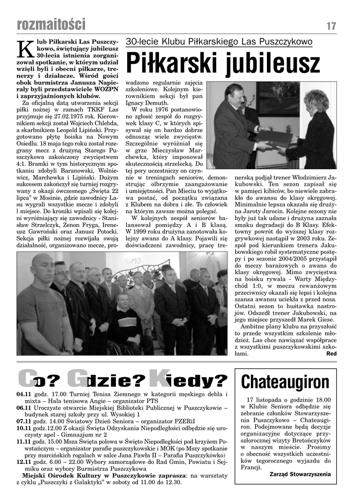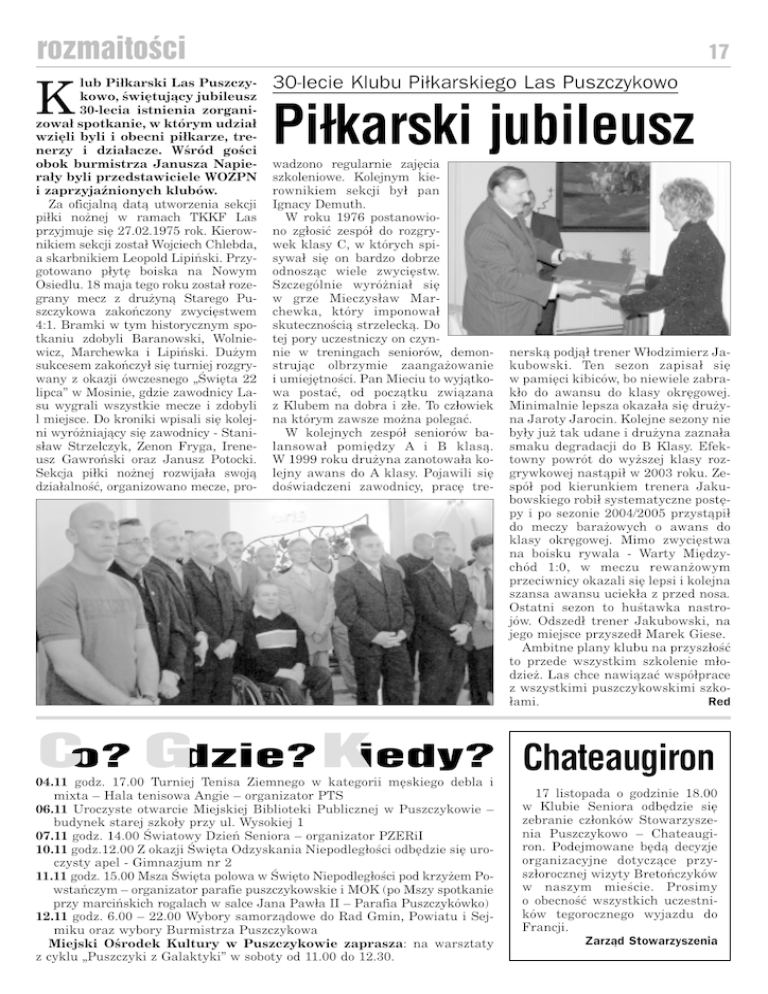 rozmaitoci K lub Pi³karski Las Puszczykowo, wiêtuj¹cy jubileusz 30-lecia istnienia zorganizowa³ spotkanie, w którym udzia³ wziêli byli i obecni pi³karze, trenerzy i dzia³acze. Wród goci obok burmistrza Janusza Napiera³y byli przedstawiciele WOZPN i zaprzyjanionych klubów. Za oficjaln¹ dat¹ utworzenia sekcji pi³ki no¿nej w ramach TKKF Las przyjmuje siê 27.02.1975 rok. Kierownikiem sekcji zosta³ Wojciech Chlebda, a skarbnikiem Leopold Lipiñski. Przygotowano p³ytê boiska na Nowym Osiedlu. 18 maja tego roku zosta³ rozegrany mecz z dru¿yn¹ Starego Puszczykowa zakoñczony zwyciêstwem 4:1. Bramki w tym historycznym spotkaniu zdobyli Baranowski, Wolniewicz, Marchewka i Lipiñski. Du¿ym sukcesem zakoñczy³ siê turniej rozgrywany z okazji ówczesnego wiêta 22 lipca w Mosinie, gdzie zawodnicy Lasu wygrali wszystkie mecze i zdobyli l miejsce. Do kroniki wpisali siê kolejni wyró¿niaj¹cy siê zawodnicy - Stanis³aw Strzelczyk, Zenon Fryga, Ireneusz Gawroñski oraz Janusz Potocki. Sekcja pi³ki no¿nej rozwija³a swoj¹ dzia³alnoæ, organizowano mecze, pro- 17 30-lecie Klubu Pi³karskiego Las Puszczykowo Pi³karski jubileusz wadzono regularnie zajêcia szkoleniowe. Kolejnym kierownikiem sekcji by³ pan Ignacy Demuth. W roku 1976 postanowiono zg³osiæ zespó³ do rozgrywek klasy C, w których spisywa³ siê on bardzo dobrze odnosz¹c wiele zwyciêstw. Szczególnie wyró¿nia³ siê w grze Mieczys³aw Marchewka, który imponowa³ skutecznoci¹ strzeleck¹. Do tej pory uczestniczy on czynnie w treningach seniorów, demonstruj¹c olbrzymie zaanga¿owanie i umiejêtnoci. Pan Mieciu to wyj¹tkowa postaæ, od pocz¹tku zwi¹zana z Klubem na dobra i z³e. To cz³owiek na którym zawsze mo¿na polegaæ. W kolejnych zespó³ seniorów balansowa³ pomiêdzy A i B klas¹. W 1999 roku dru¿yna zanotowa³a kolejny awans do A klasy. Pojawili siê dowiadczeni zawodnicy, pracê tre- 04.11 godz. 17.00 Turniej Tenisa Ziemnego w kategorii mêskiego debla i mixta Hala tenisowa Angie organizator PTS 06.11 Uroczyste otwarcie Miejskiej Biblioteki Publicznej w Puszczykowie budynek starej szko³y przy ul. Wysokiej 1 07.11 godz. 14.00 wiatowy Dzieñ Seniora organizator PZERiI 10.11 godz.12.00 Z okazji wiêta Odzyskania Niepodleg³oci odbêdzie siê uroczysty apel - Gimnazjum nr 2 11.11 godz. 15.00 Msza wiêta polowa w wiêto Niepodleg³oci pod krzy¿em Powstañczym organizator parafie puszczykowskie i MOK (po Mszy spotkanie przy marciñskich rogalach w salce Jana Paw³a II Parafia Puszczykówko) 12.11 godz. 6.00 22.00 Wybory samorz¹dowe do Rad Gmin, Powiatu i Sejmiku oraz wybory Burmistrza Puszczykowa Miejski Orodek Kultury w Puszczykowie zaprasza: na warsztaty z cyklu Puszczyki z Galaktyki w soboty od 11.00 do 12.30. nersk¹ podj¹³ trener W³odzimierz Jakubowski. Ten sezon zapisa³ siê w pamiêci kibiców, bo niewiele zabrak³o do awansu do klasy okrêgowej. Minimalnie lepsza okaza³a siê dru¿yna Jaroty Jarocin. Kolejne sezony nie by³y ju¿ tak udane i dru¿yna zazna³a smaku degradacji do B Klasy. Efektowny powrót do wy¿szej klasy rozgrywkowej nast¹pi³ w 2003 roku. Zespó³ pod kierunkiem trenera Jakubowskiego robi³ systematyczne postêpy i po sezonie 2004/2005 przyst¹pi³ do meczy bara¿owych o awans do klasy okrêgowej. Mimo zwyciêstwa na boisku rywala - Warty Miêdzychód 1:0, w meczu rewan¿owym przeciwnicy okazali siê lepsi i kolejna szansa awansu uciek³a z przed nosa. Ostatni sezon to hutawka nastrojów. Odszed³ trener Jakubowski, na jego miejsce przyszed³ Marek Giese. Ambitne plany klubu na przysz³oæ to przede wszystkim szkolenie m³odzie¿. Las chce nawi¹zaæ wspó³prace z wszystkimi puszczykowskimi szko³ami. Red Chateaugiron 17 listopada o godzinie 18.00 w Klubie Seniora odbêdzie siê zebranie cz³onków Stowarzyszenia Puszczykowo Chateaugiron. Podejmowane bêd¹ decyzje organizacyjne dotycz¹ce przysz³orocznej wizyty Bretoñczyków w naszym miecie. Prosimy o obecnoæ wszystkich uczestników tegorocznego wyjazdu do Francji. Zarz¹d Stowarzyszenia
